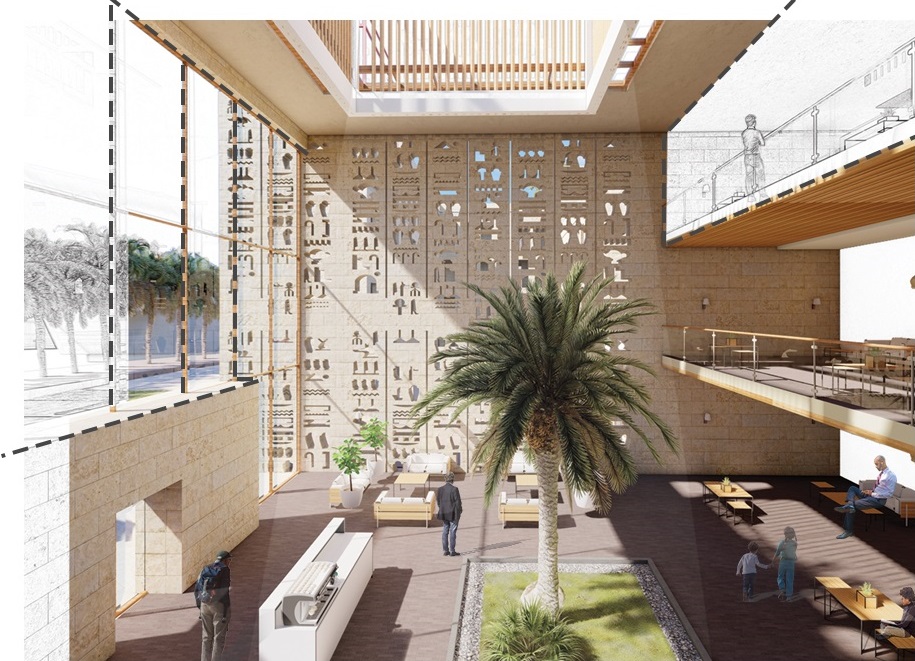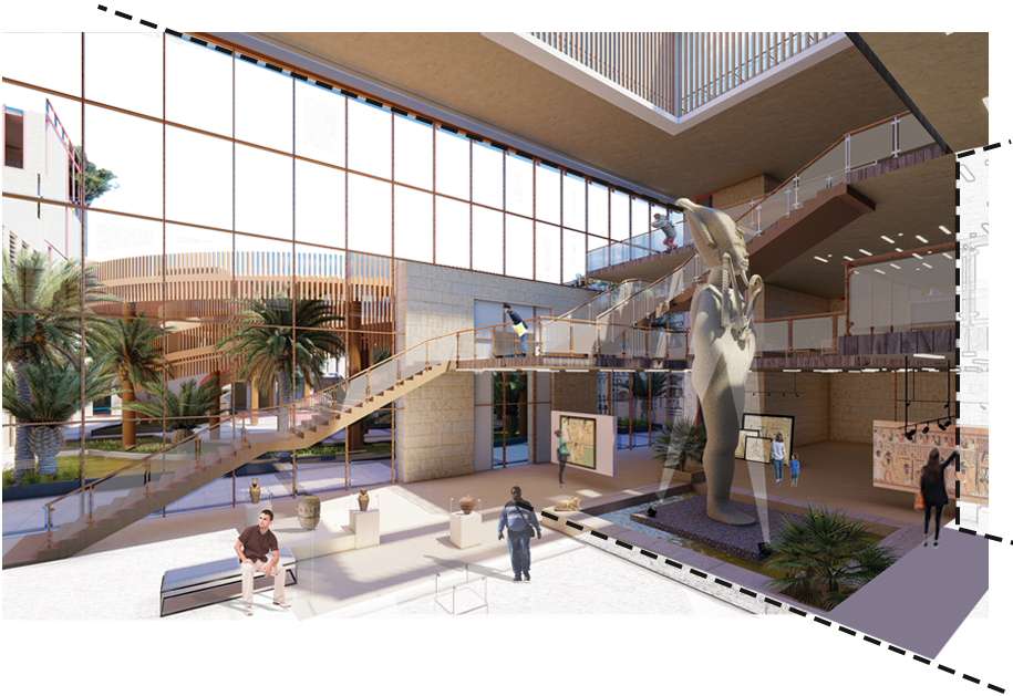 Thus, and with respect to the project’s proximity to the only remaining ancient world wonder, the centre focuses on revitalizing the ancient Egyptians’ wellness philosophies, also their buildings’ philosophies to create a memory image that brings this culture to mind. This is accomplished through narrative architecture that would achieve holistic wellness by spatial experience and culturally appropriate program functions.