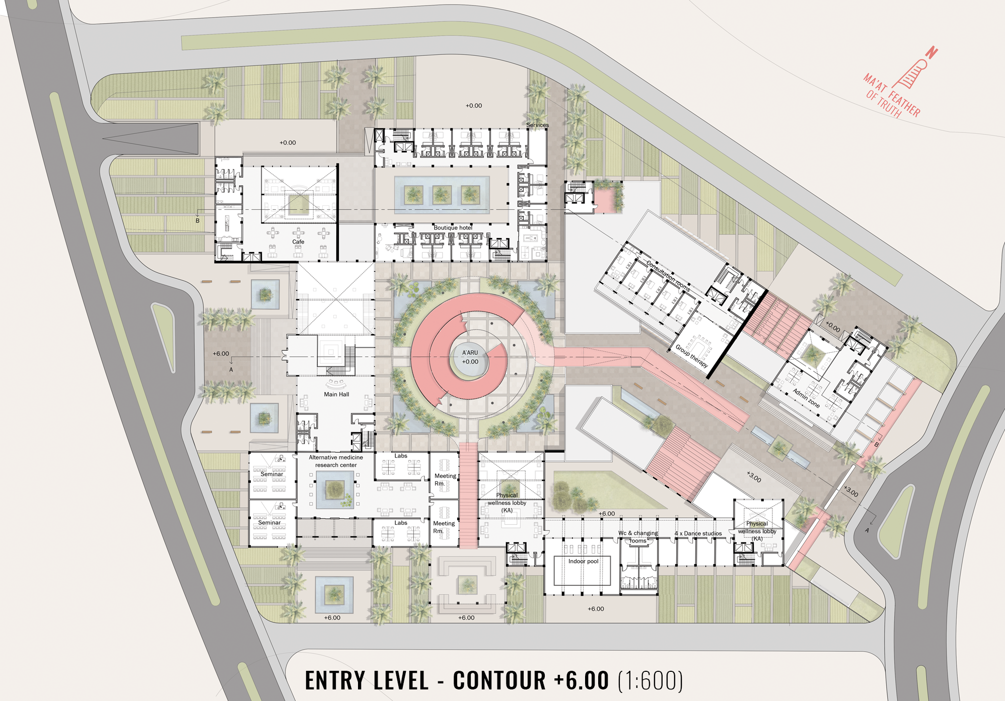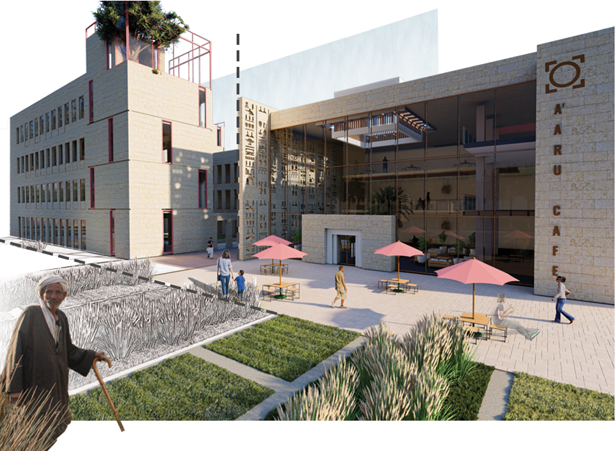 The experience begins as the metaphorically un-well user enters from the east west axis in reference to the sun journey in ancient Egyptian temples, where he is greeted by a gate like entrance creating memory image of the Egyptian pylons. Afterwards he descends on a ramp following the contour whilst experiencing a darker shaded atmosphere in a journey similar to entry paths of ancient tombs. Until he reaches the place with the lowest contour level which is the metaphoric A’Aru fields, where the boundary between nature and built structure is blurred and one can enjoy the sacred lake with the ruler “Osiris” in the middle and embark on a journey of ascent full of interesting serial vision using the helix ramp symbolizing transcendence until the user reaches the majestic view of the pyramids and reaches the metaphoric state of wellness.