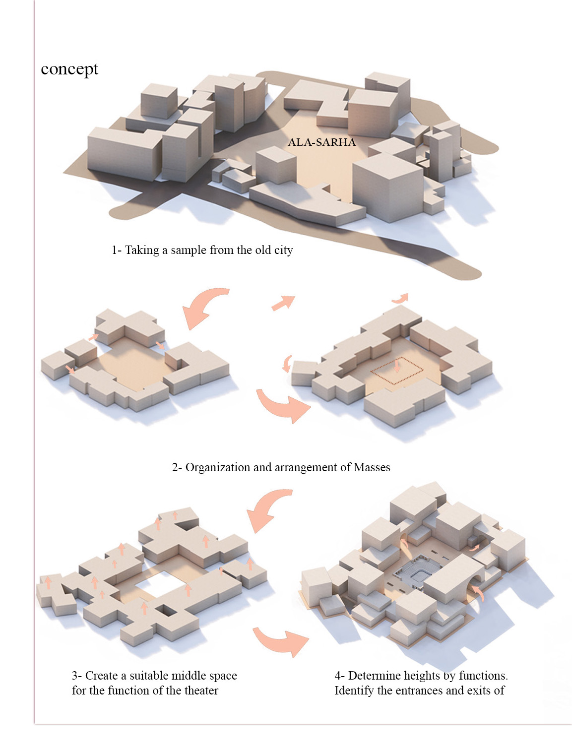 The Yemeni rejoices when he sees the crowds of people around him, That’s why ancient man built a city on this basis.. The people in each neighborhood left a space called( AL-Sarha), which is a space that mediates a group of dwellings. In it he met his loved ones and held his weddings and events. And in it he cried with his head on his friend when he died dear to him .And it is the same place that gathered people in religious holidays and occasions.. He sang in its center the artist and the dance of the public “Bara’a”. Therefore, Al-Sarha has an important historical and philosophical depth from which my idea was inspired. To bring life and sublime thought back to a similar place. Al- Sarha was represented by the open middle theater. The houses were replaced by the various functions of the house.
