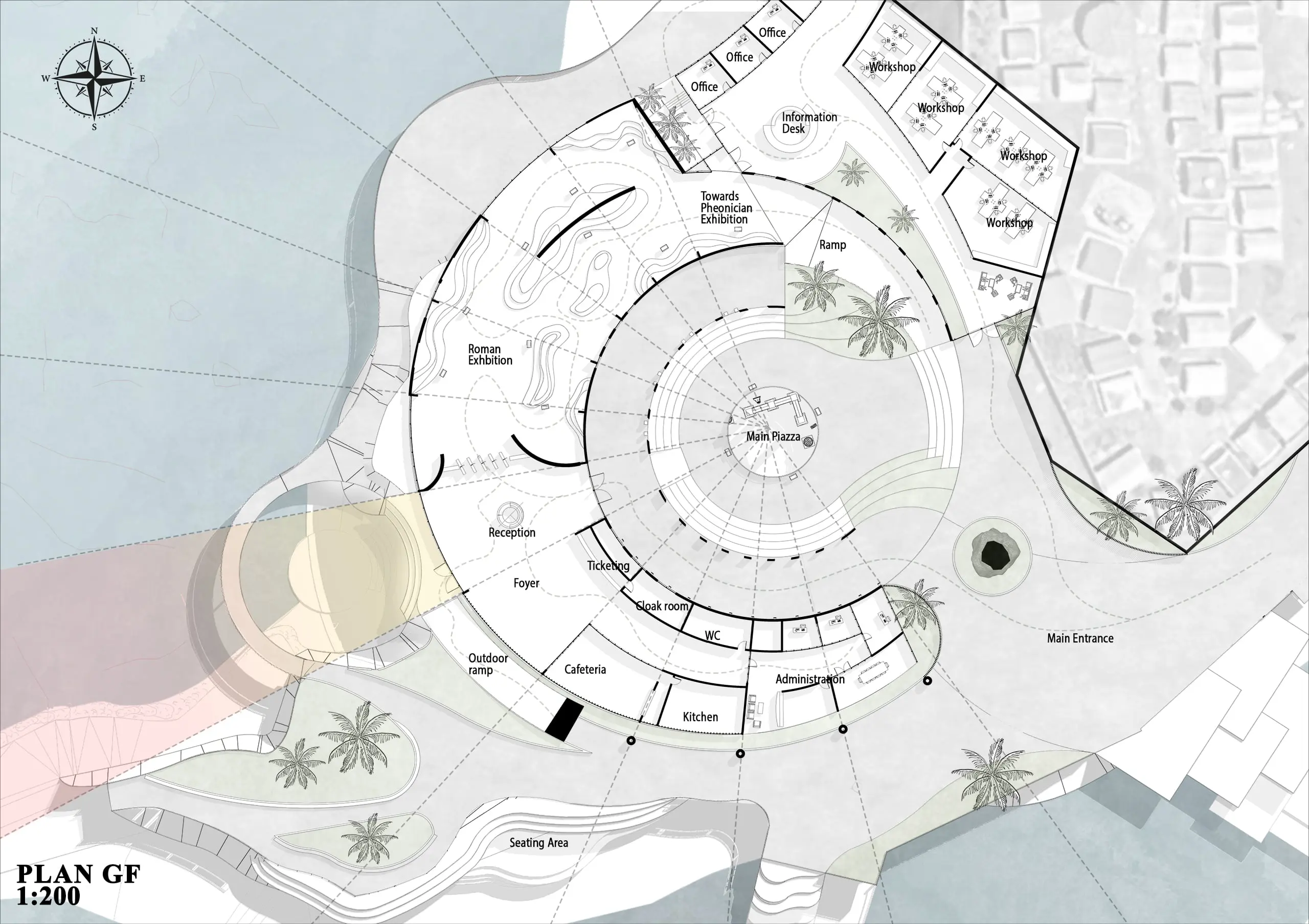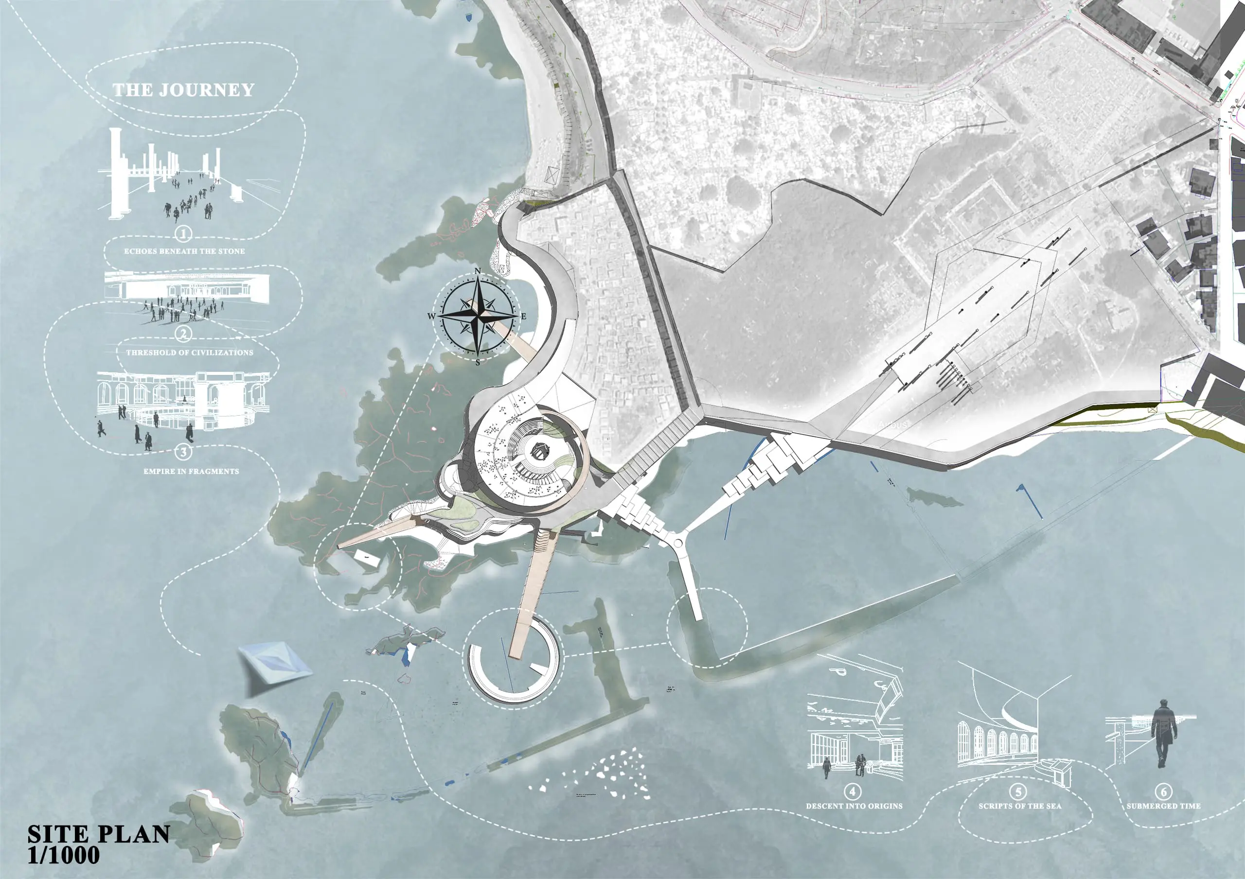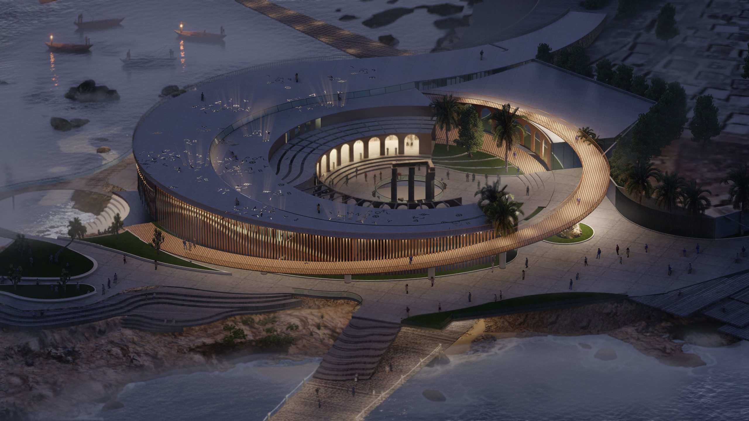 The Maritime Archaeology Museum in Tyre is a celebration of the city’s rich Phoenician and Roman maritime heritage. Once a thriving Mediterranean port, Tyre shaped trade, culture, and navigation, leaving a legacy that continues to inspire. This museum transforms history into an immersive experience, bridging ancient maritime achievements with contemporary architectural expression. The design draws from Tyre’s ancient urban fabric, particularly the Cardo and Decumanus, creating a circulation that guides visitors through a narrative journey from Phoenician seafaring and shipbuilding to Roman maritime engineering. Each space is crafted to educate, inspire, and immerse, turning exploration into discovery. The façade takes the form of a sculptural, wave-like wooden parametric system, symbolizing Tyre’s intimate bond with the sea. Its dynamic form casts ever-changing shadows and textures, evoking movement, fluidity, and rhythm. Above, the roof is engraved with lettering inspired by ancient scripts. Sunlight filters through these inscriptions, projecting stories across the interior and transforming light and shadow into a living narrative. Visitors walk beneath a roof that tells history, creating a poetic interplay between architecture, light, and story. Inside, flexible exhibition halls, research spaces, and interactive installations engage visitors with artifacts, digital reconstructions, and augmented reality. Open courtyards and terraces frame views of the coastline, connecting the museum to the sea it celebrates. Sustainability guides the design with natural ventilation, daylight optimization, and locally sourced materials. Ultimately, the museum is not just a building it is a living archive, a vessel of memory and discovery, where history, architecture, and the sea converge to create a uniquely immersive journey.