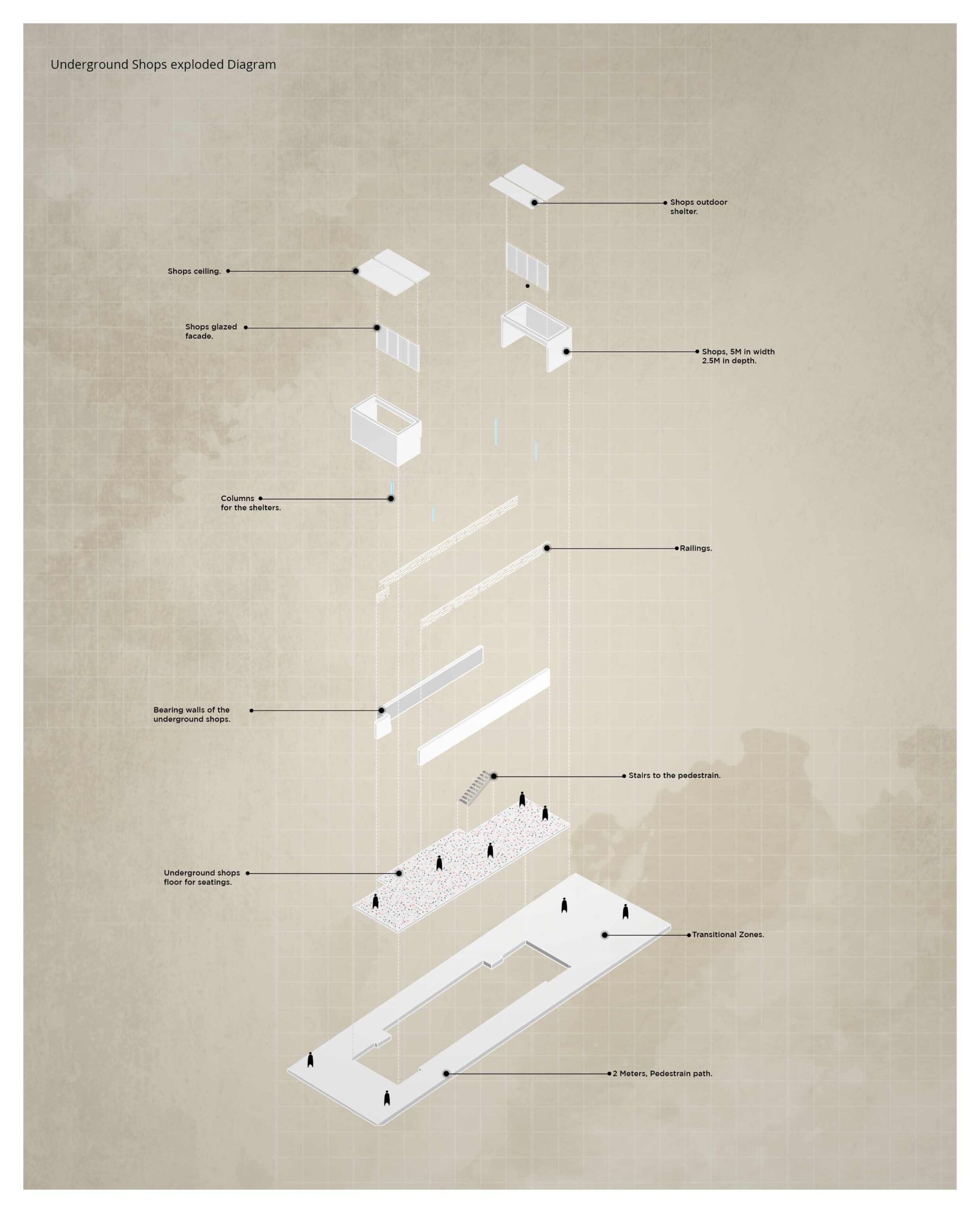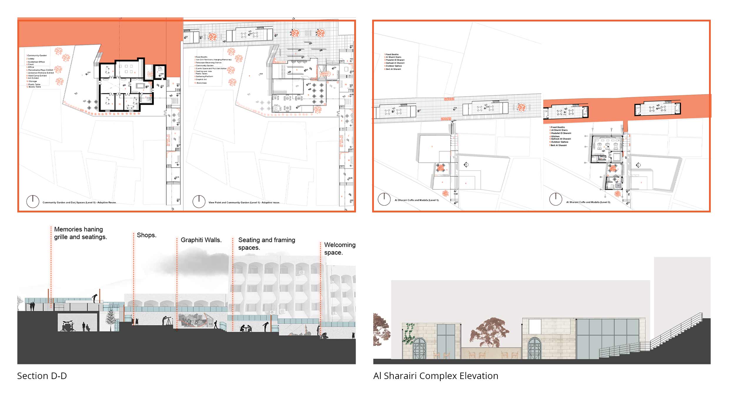 The new extensions to House of AlSharairi are Alharairi coffee that serves as a small coffee station for selling coffee with a small outdoor seating, and Madafet AlSharairi that works as an open space for seating, with a reflection of the culture. Both of them are added to complete the lack of services in House of Al Sharairi. Frames are added to the stairs, to frame the views and to work as a stop point in the stations.