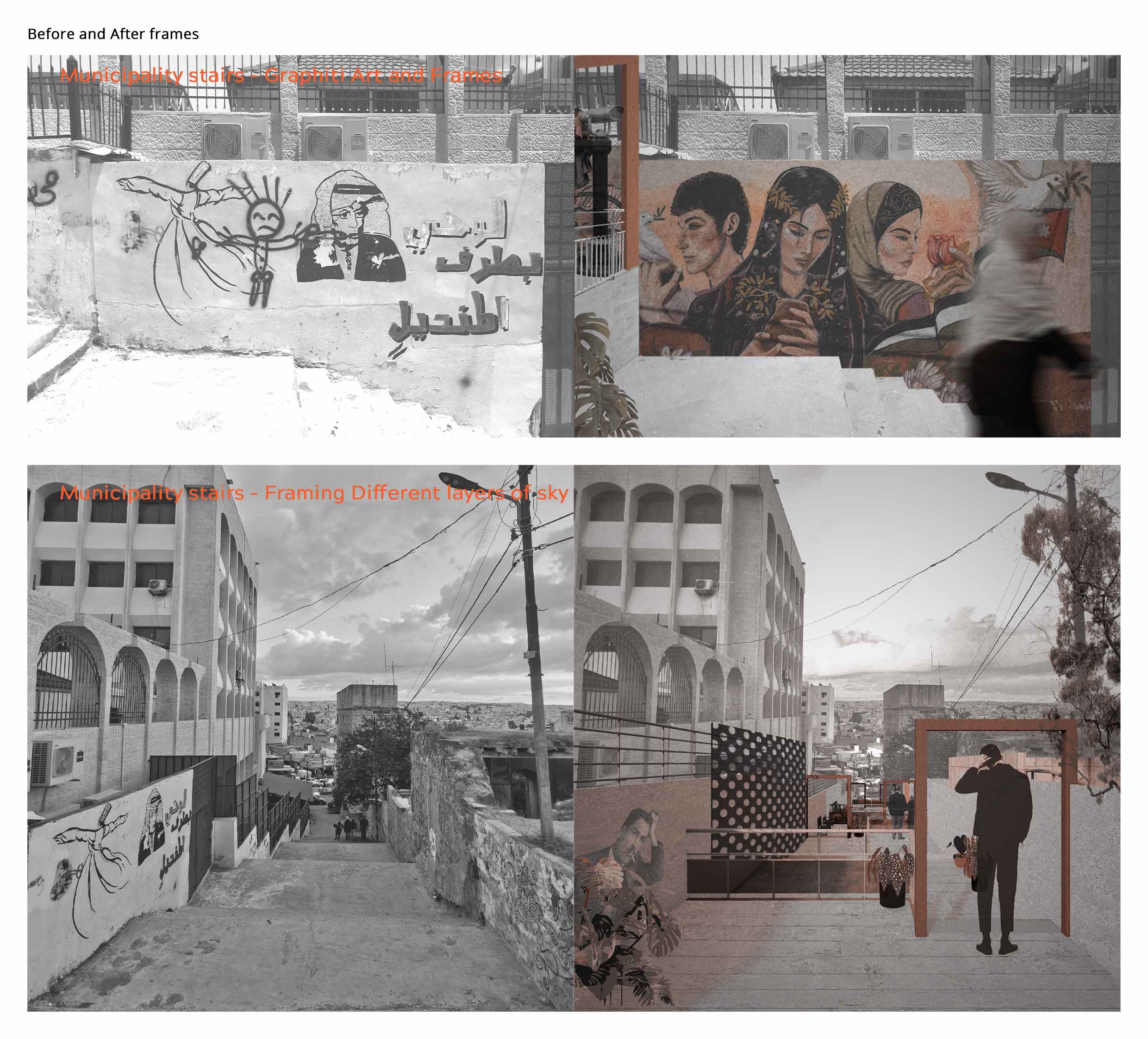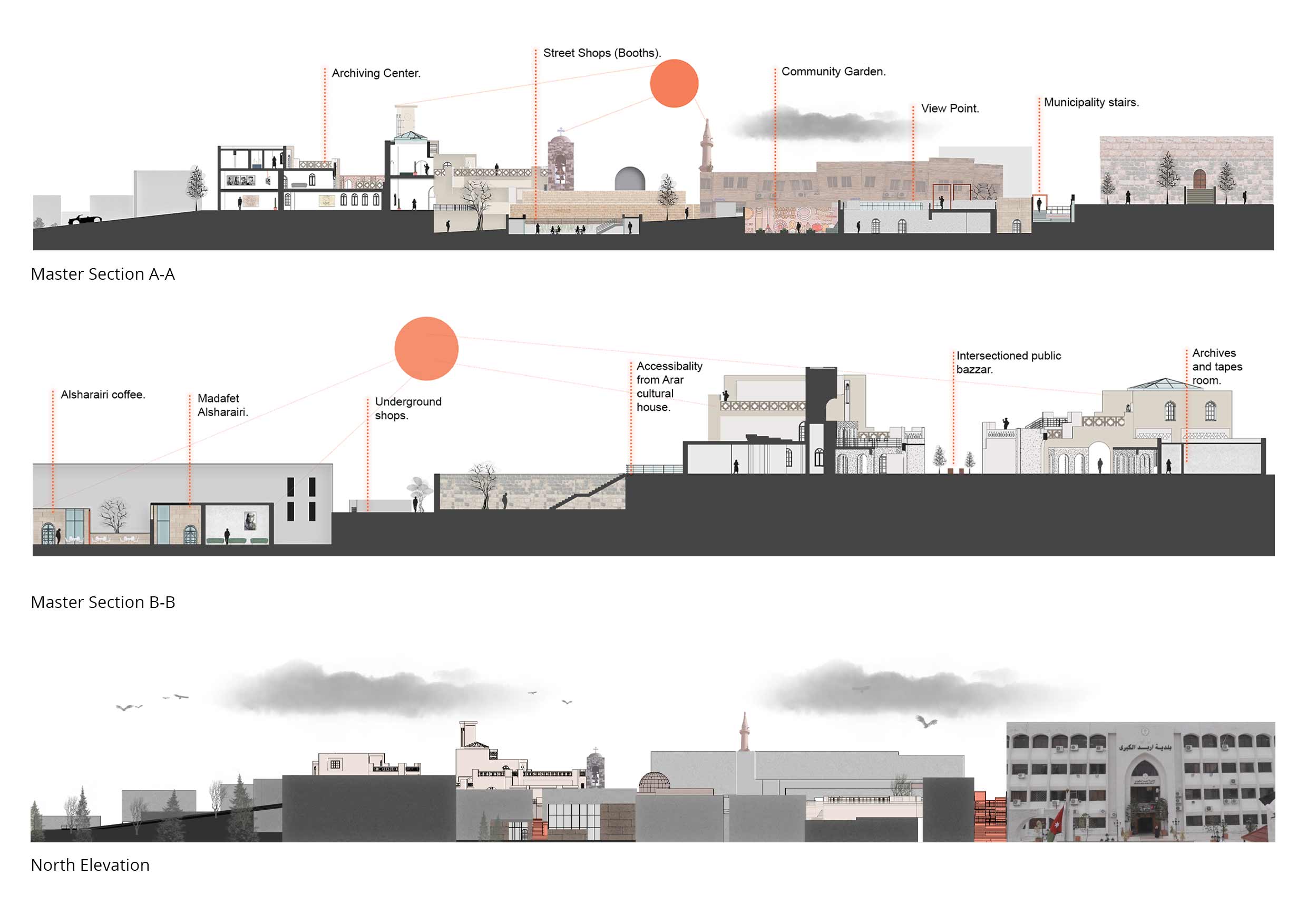 The municipality stairs is redesigned to have such a framing platforms that frames the different layers of the skyline, with taking advantage of the stairs spaces for selling crafts, plants and books, the walls are redesigned to reflect Arar poetry in a graffiti art, the steps are divided into circulation steps and seating steps. The old municipality building was in a bad condition and abandoned even though it has a rich cultural value, the exterior walls thickness was around 70CM, and 3.5M height, with a court inside that reflects the vernacular architectural language. The building is adapted and reused mainly as Point view, event spaces, and community garden (that reflects the old arrangement of the city). The ground floor is reused as a fixed exhibition that represent Darj Festival which took place in 2017 on the municipality stairs. the roof is reused as a point view with a steel frames that looks and frames a different layers of the skyline, and with a series of events, like sitting zones, and memories hanging grille space. The municipality street was changed into pedestrian street with a width of 10M, the street is redesigned to have a underground small shops with a 5M width for selling crafts, food and crops from community garden, with a green seating zones.