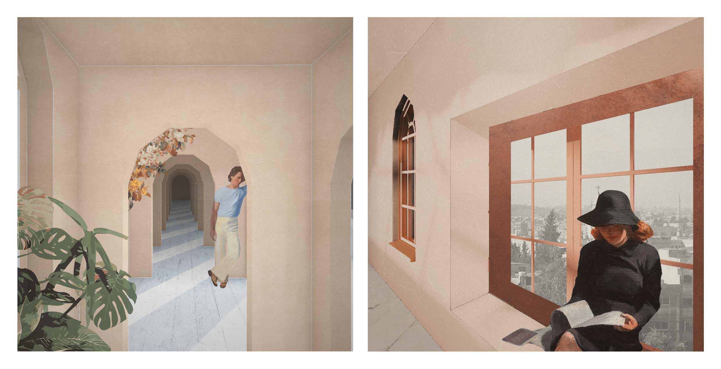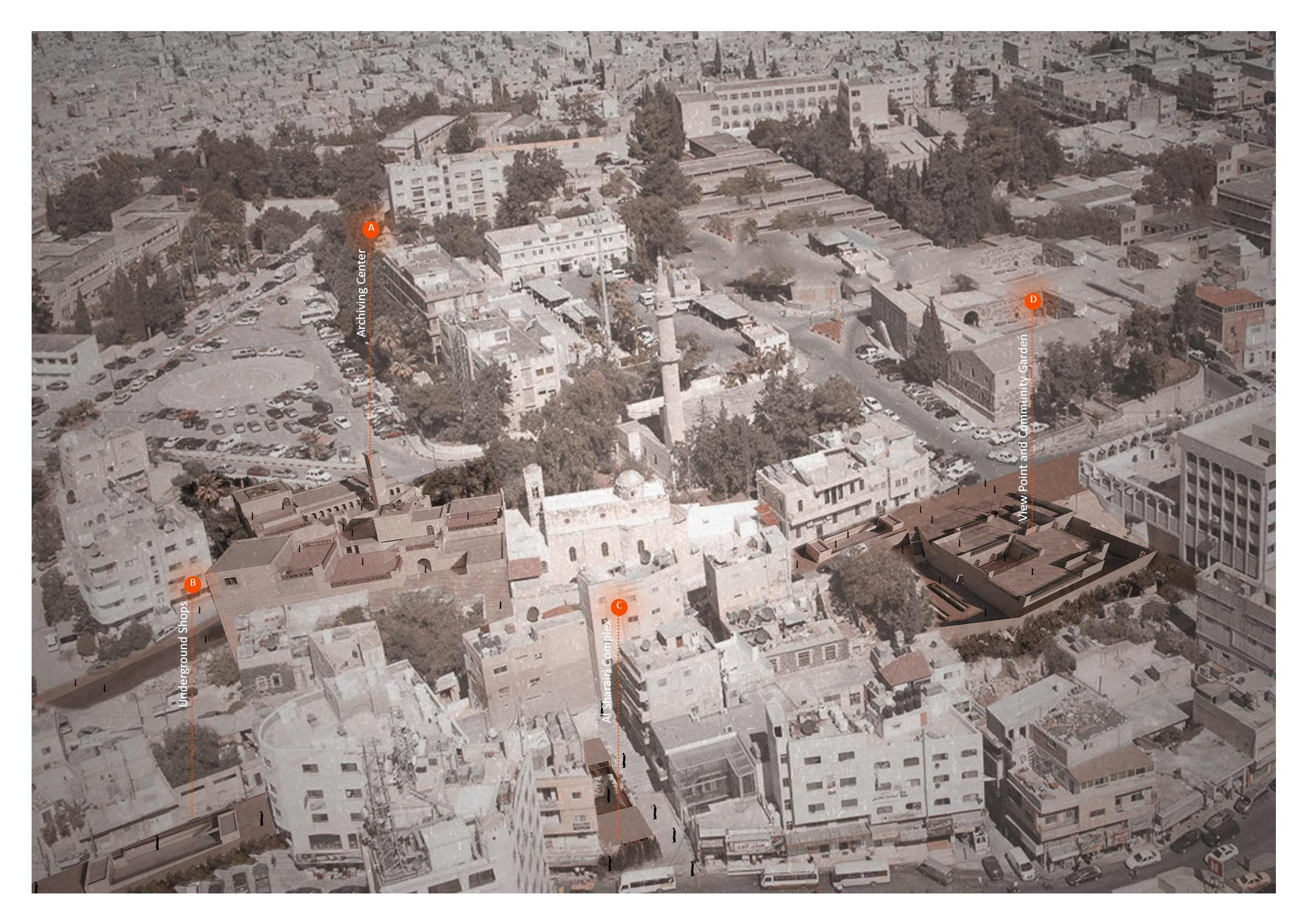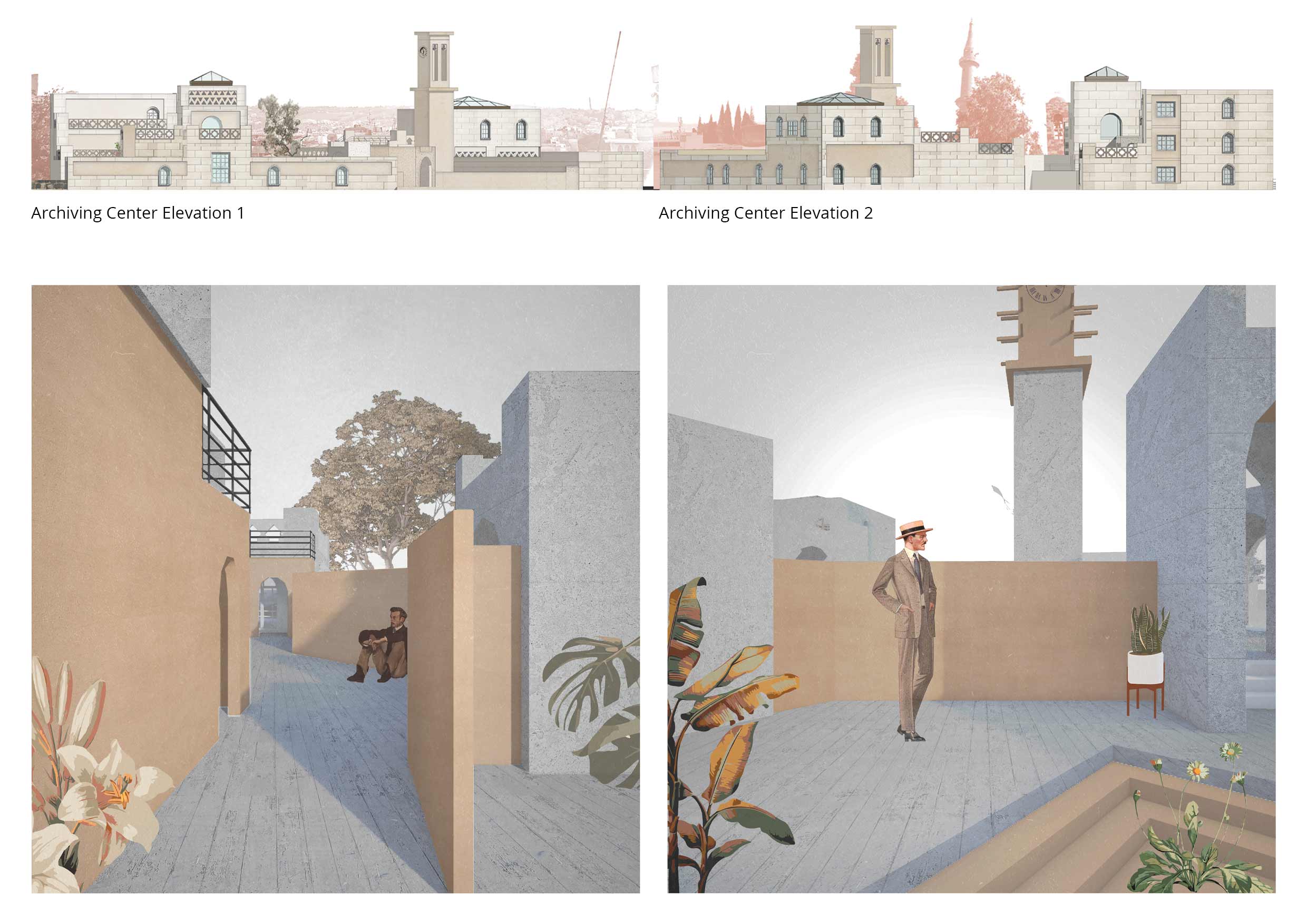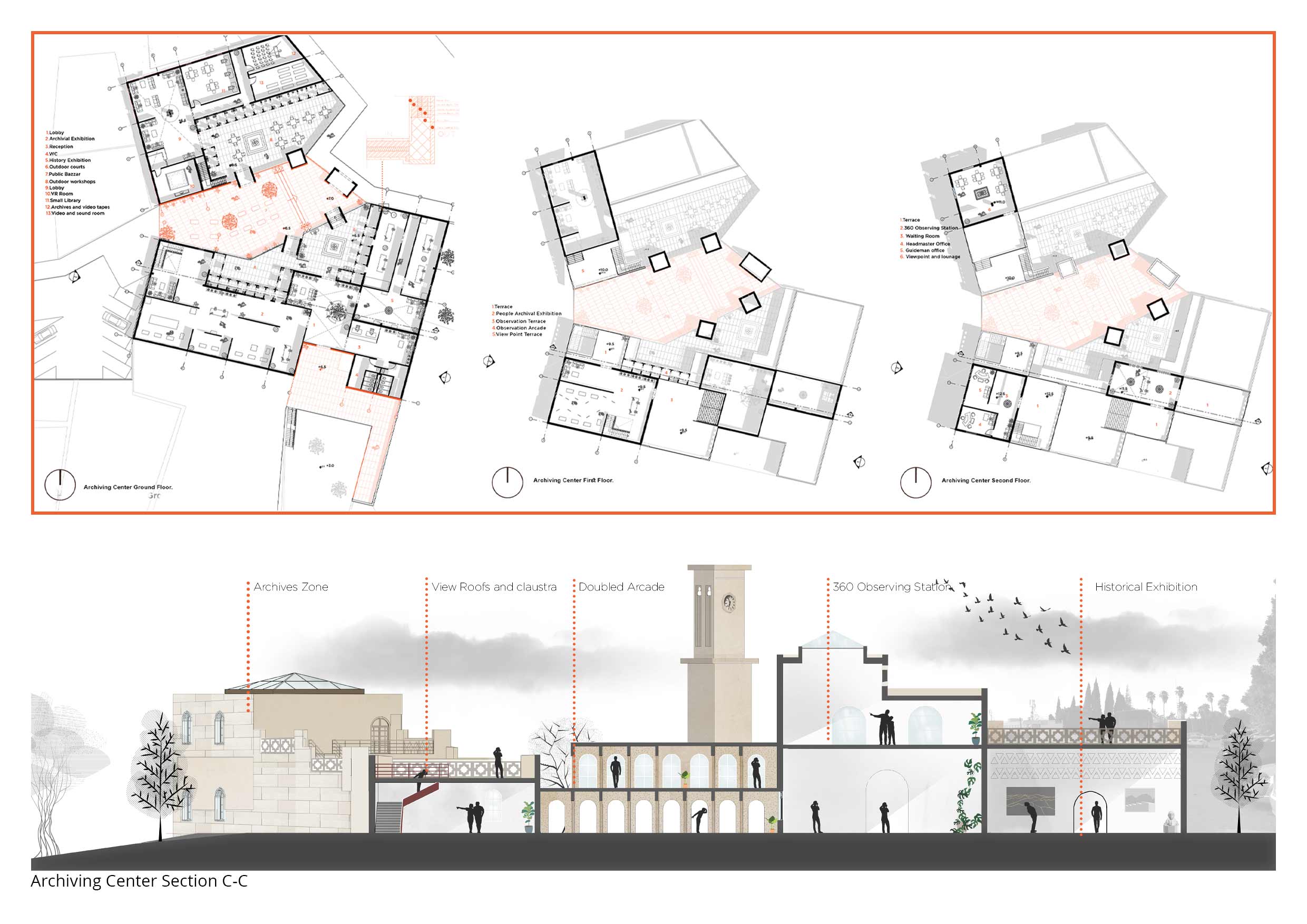 The archiving center is divided into 3 sections, Sequence of exhibitions, interconnected street (serves as Public Bazar) and the archiving zone. The sequential exhibitions are an archival maps and city development exhibition, people exhibition that exhibit people whether they were icons in the city, or local citizens who want to share memories with people, and the last exhibition is a historical exhibition that shows a unique piece from Tal Irbid. The archiving zone main purpose was to exhibit a documentaries of the city in the video room. There are a roofs that used a view points over the city, and there is specific 360 view platform that frames the breakthrough of the church and mosque.