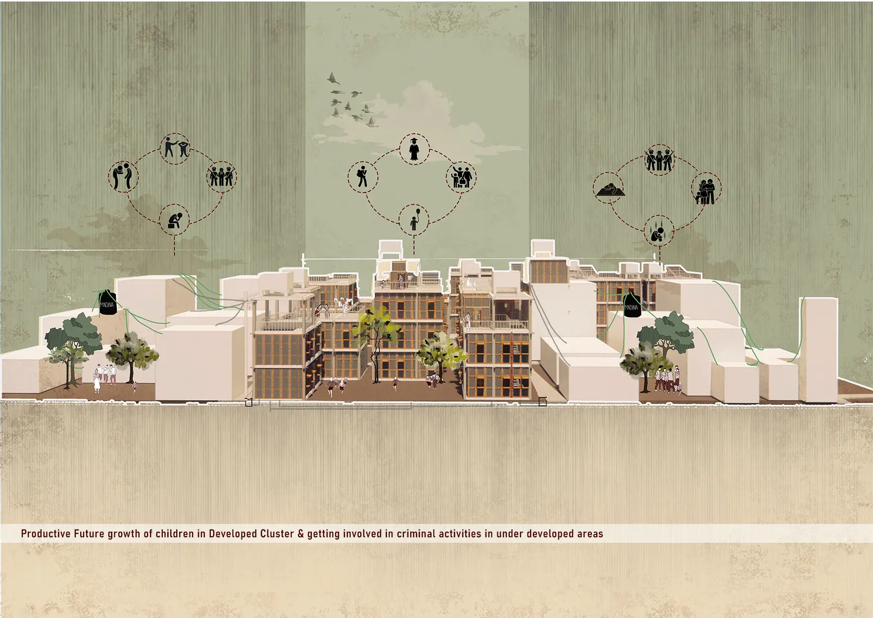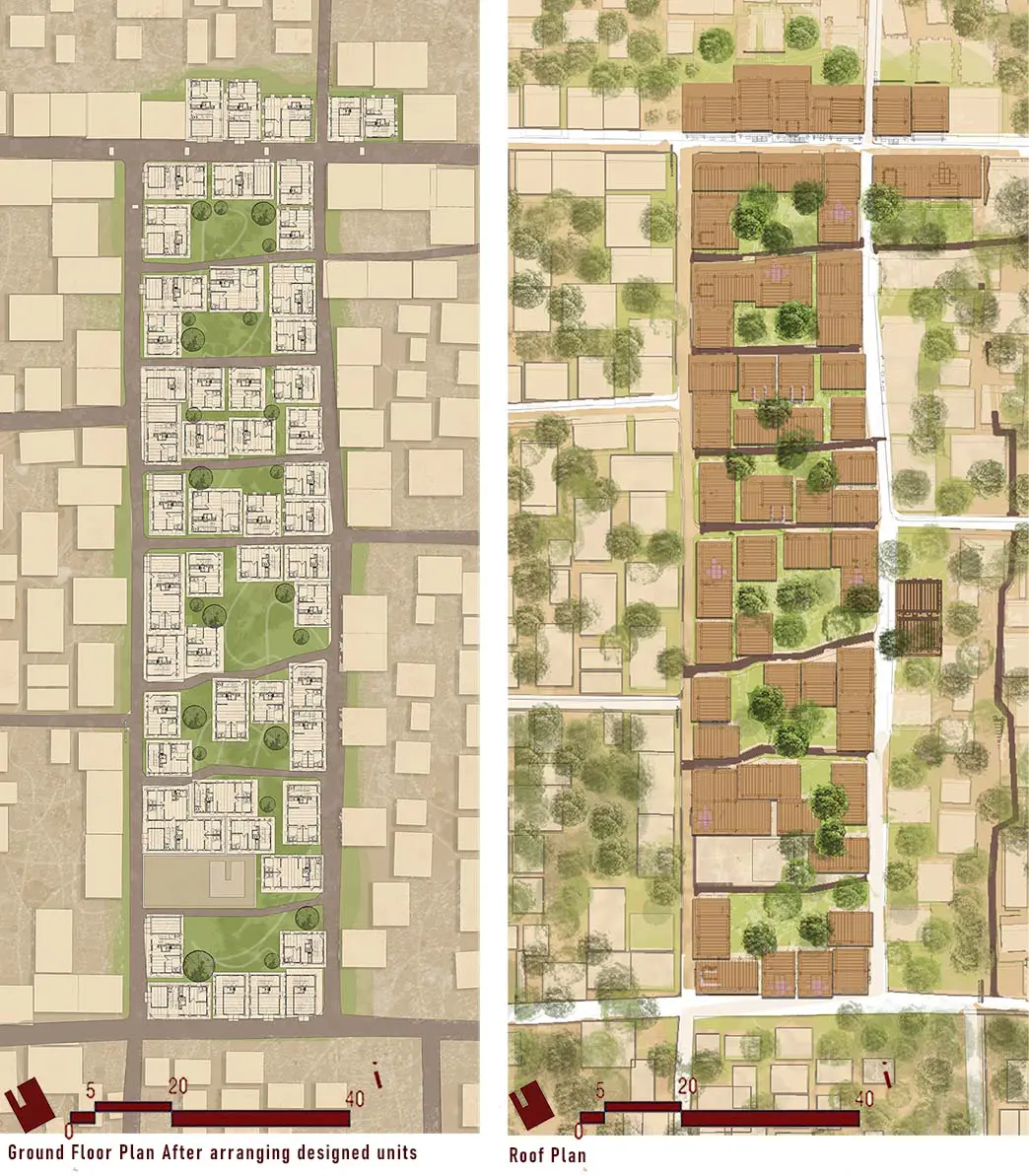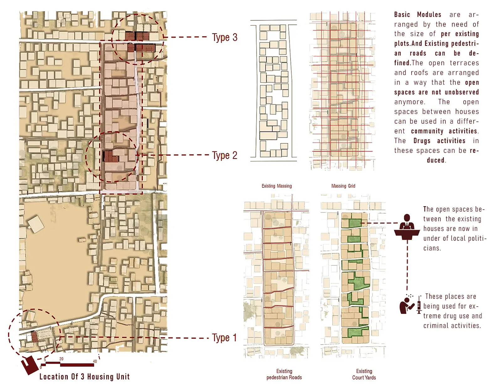 Cluster Development: The modular units, designed to meet the residents’ needs, can be replicated according to the plot sizes. By repeating these modules, the open spaces within the clusters will be better monitored, reducing the likelihood of unobserved areas that could contribute to criminal activities.