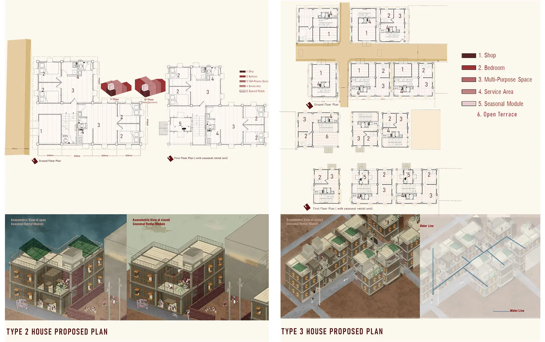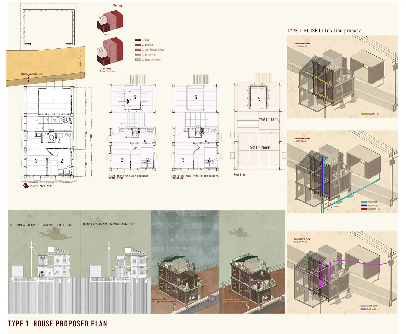 Design Approach: After conducting an extensive field survey, three households with varying sizes and utility-sharing systems were selected. The design of these homes is based on the needs of the community, with basic modules created within a common grid size. This modular approach allows for flexibility, enabling residents to build according to their specific plot sizes and needs.