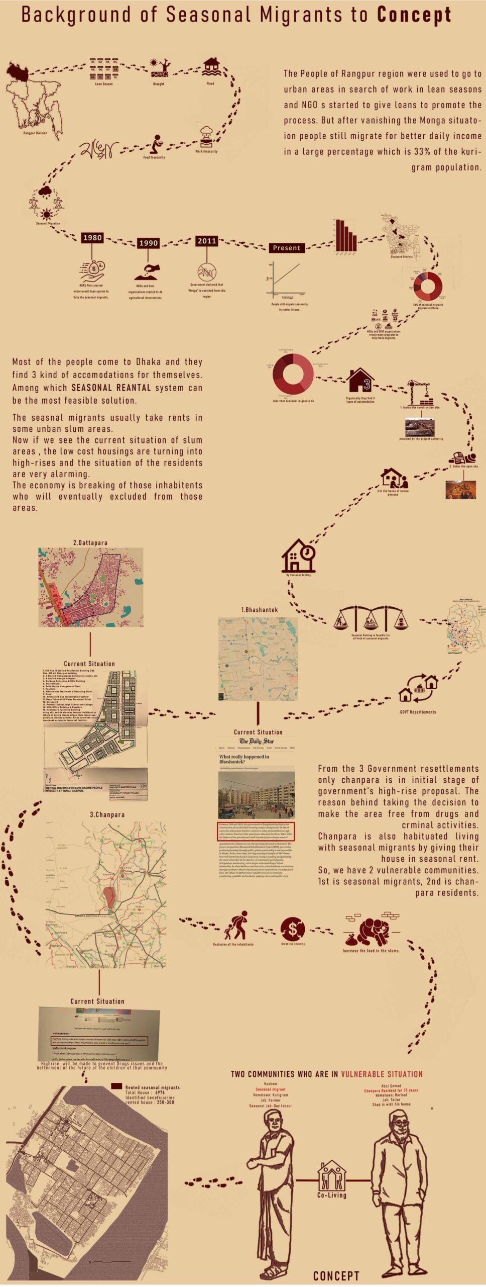 Origin: People from kurigram and Greater rangpur region face a serious seasonal famine called “Monga”. Until 2011, people used to migrate to the urban city to cope with Monga unemployment. But still people migrate on those lean season for better income. As a day labourer, worker can earn up to 1000 taka per day in Dhaka which becomes half in native village. So, seasonal migration is a necessary step for better income, and it should be promoted by government and NGOs.