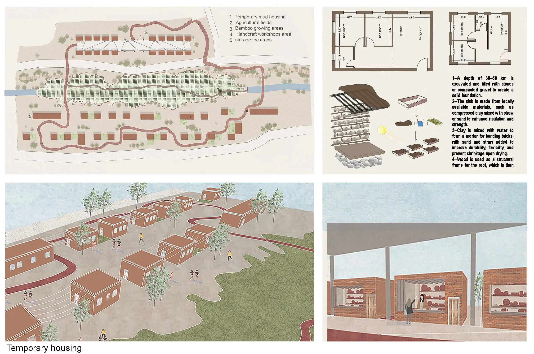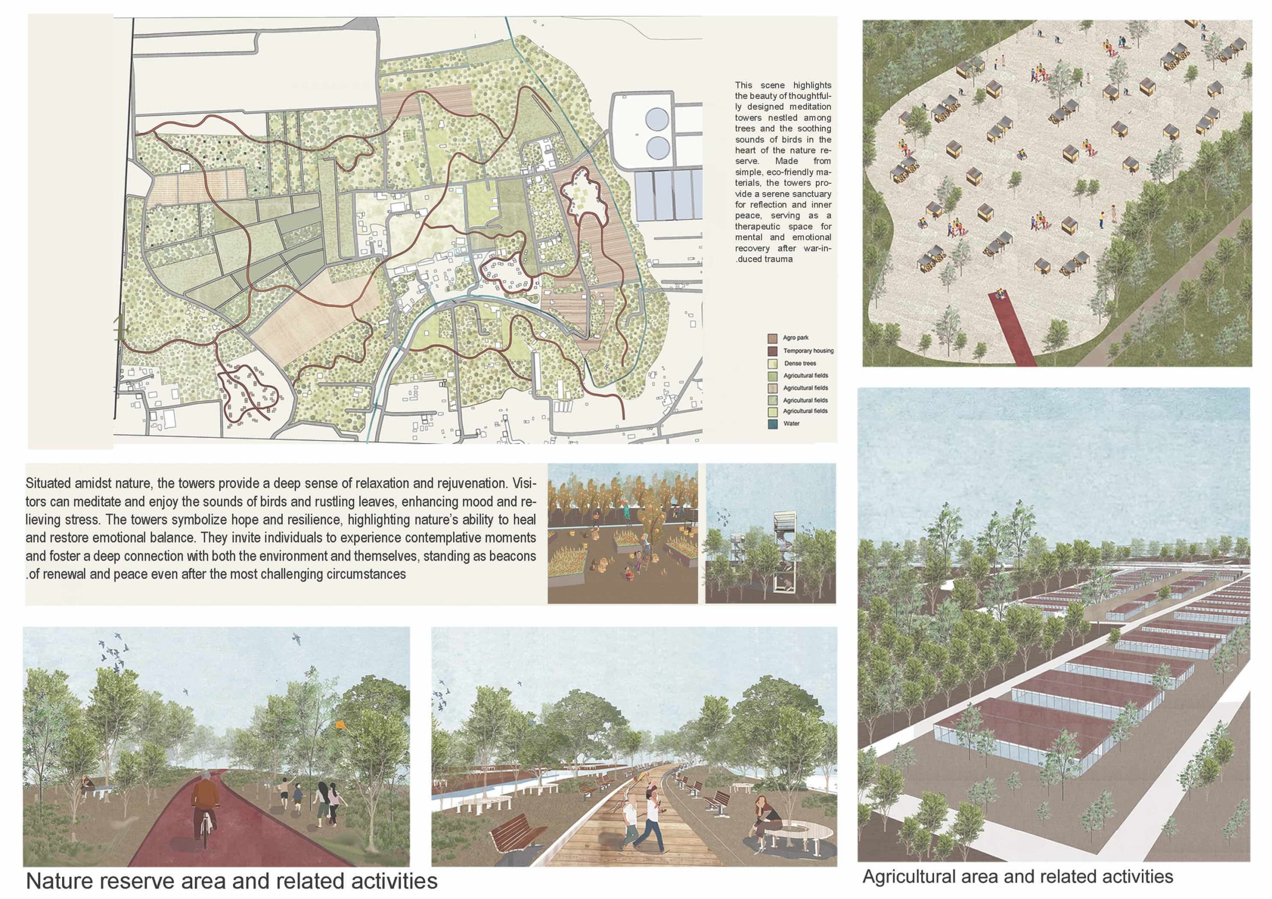 2. Social innovation via temporary agro-housing for displaced families, integrating them into farming, crafts, and rehabilitation workforces, alongside development of public spaces, playgrounds, and cultural hubs.