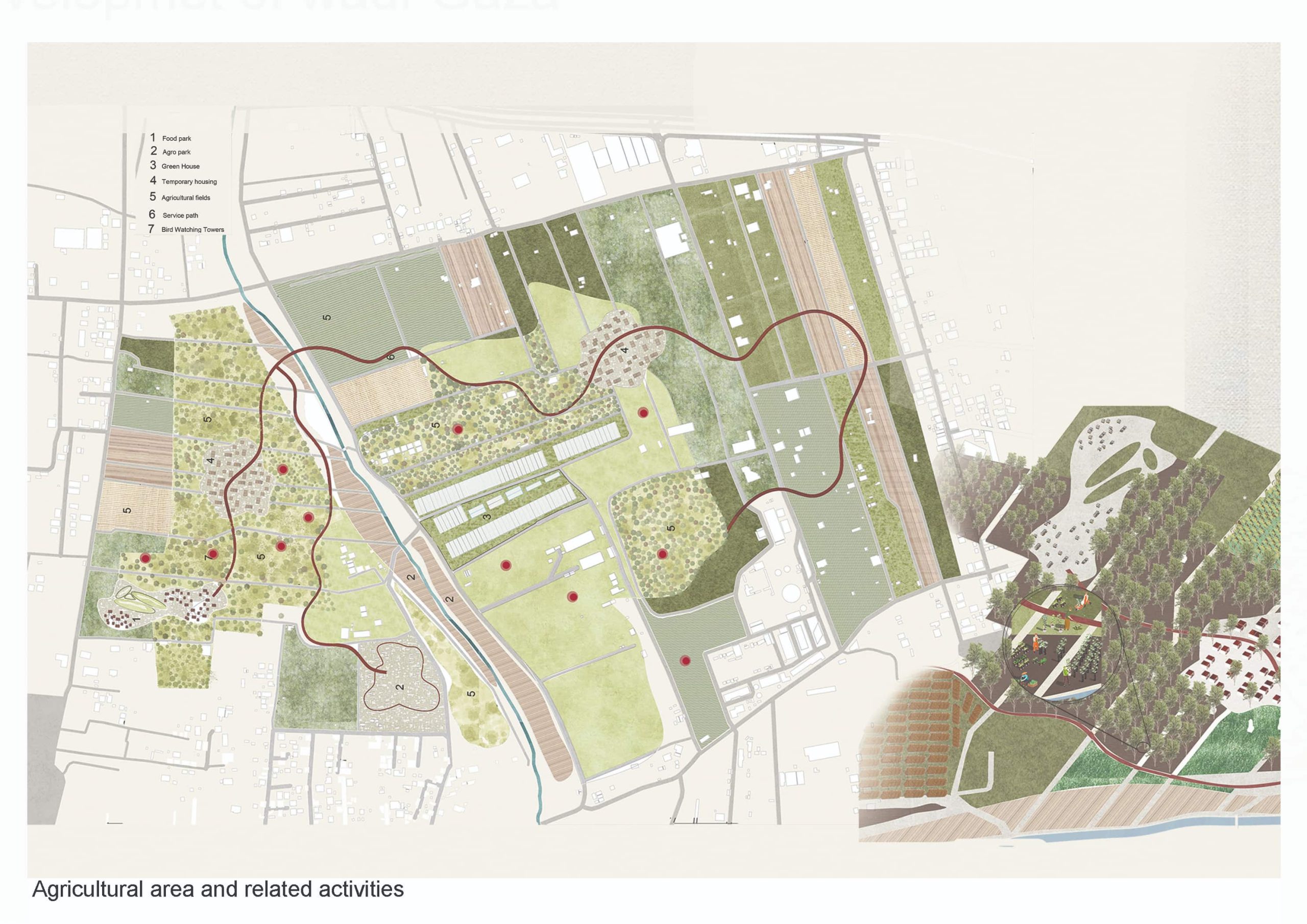 The Wadi Gaza Rehabilitation Project envisions the valley as a natural urban breathing space, structured around three pillars: