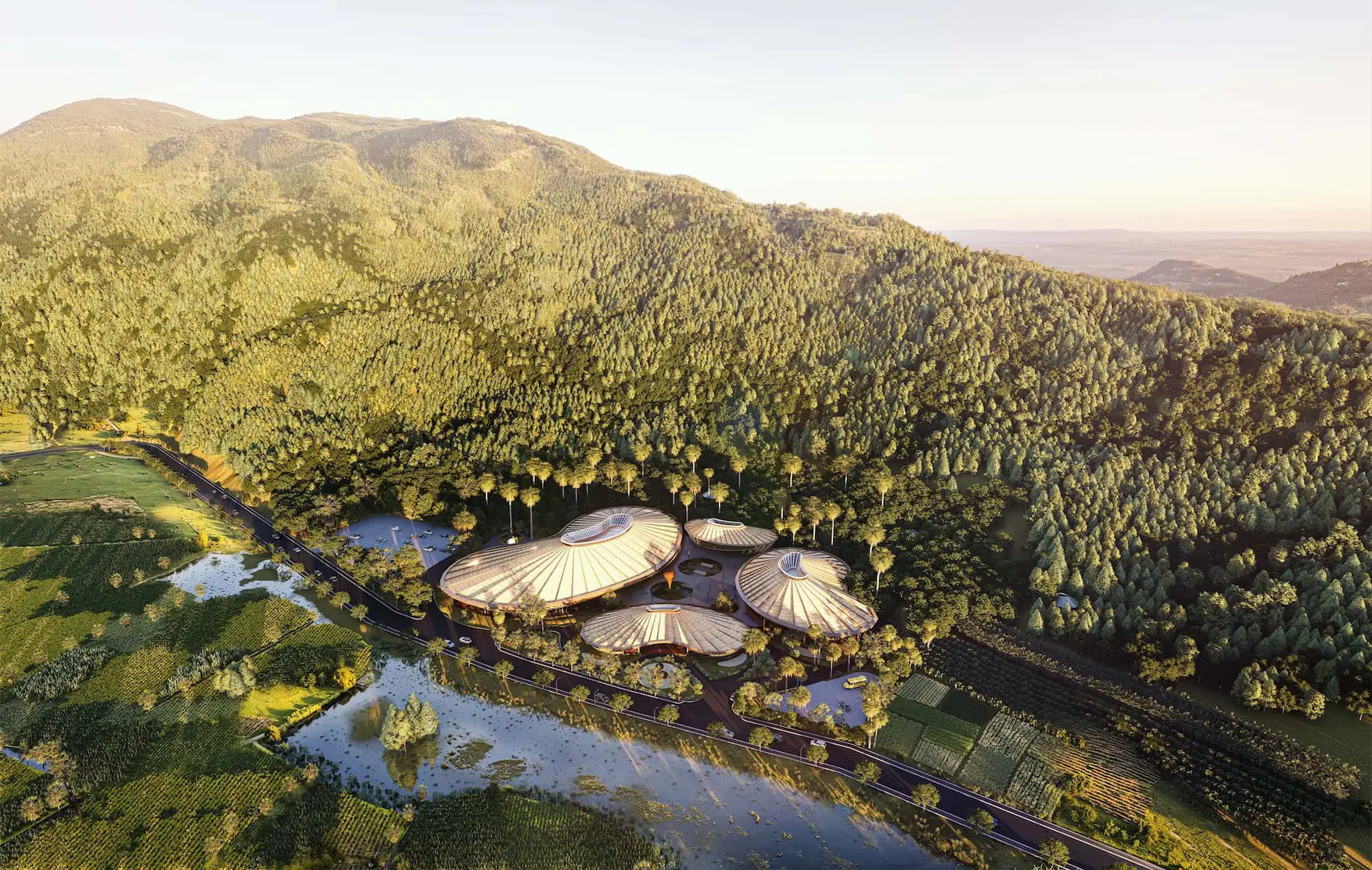 The architectural form draws inspiration from the cross-section of the palmyra fruit, where the outer “shell” comprises functional blocks enclosing the central festival space. The landscape design adapts to the mountain slope, with palmyra trees as a defining element. Indigenous materials such as bamboo, timber, palmyra leaves, and Tà Pạ stone are employed extensively, integrated with bioclimatic solutions and contemporary production technologies.