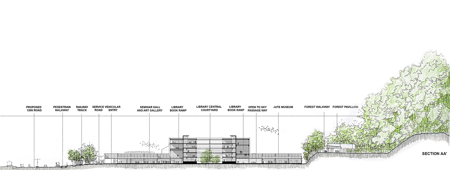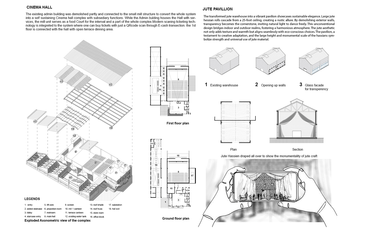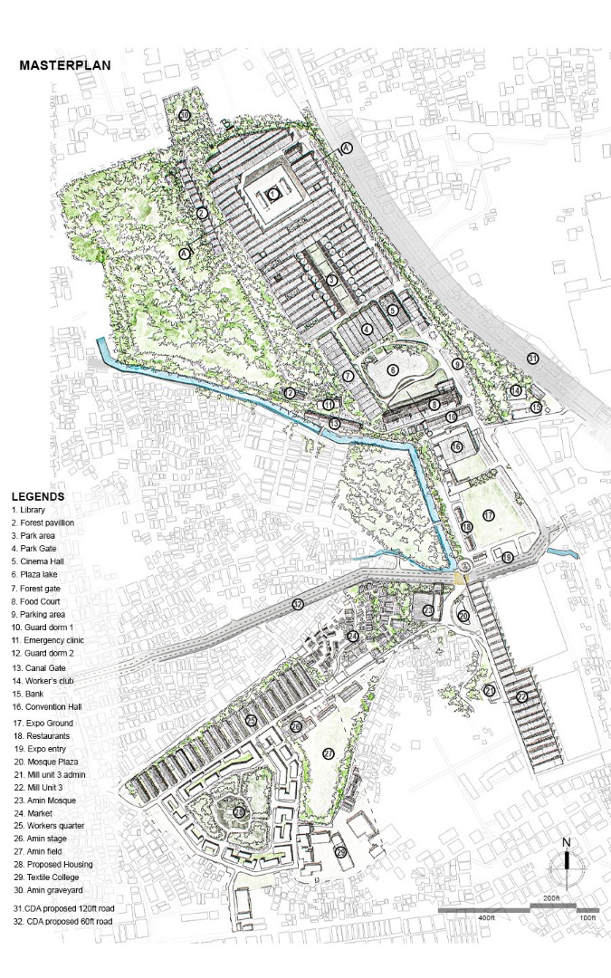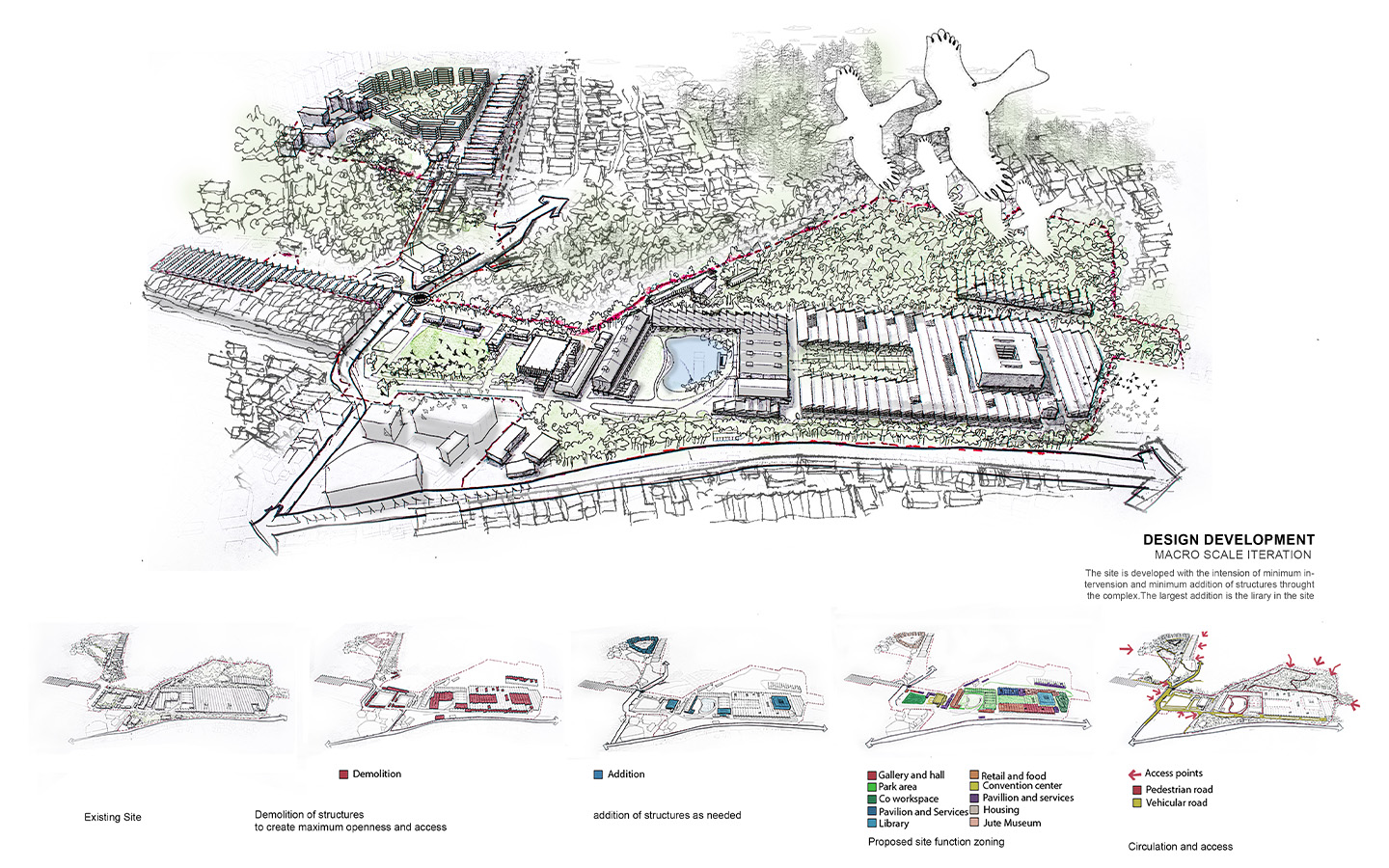 Amin Jute Mill is a government owned jute mill complex located in Sholoshohor, Chittagong. The mill was originally established by Maulana Amin, a Pakistani millionaire in 1954. Within 17 years the mill grew and eventually formed a large worker’s community making a local name for the site which it still carries ‘Amin gate’.After the independence in 1971, the site was taken as enemy land and went under the newly formed Bangladesh Government. The mill kept on running under the supervision of BJMC and the community continued to grow out of the site. In 2020, all government Jute mills were decommissioned and today a part of the 70-year-old site is abandoned. Soon after the decommission most of the workers migrated out and with the mills closed, the site is now quiet, lifeless, and purposeless. Although the complex was constructed outside of the city back in 1954, today the city expanded and the settlements around the site are surrounded from all four sides. Within this gray jungle, the site stands with 80 acres of breathing green topography. Now abandoned and with no plans declared by the government, the site is waiting to be taken over by the surroundings to construct residential and commercial buildings, robbing the neighbor of the only chance of having a green space in the context. Sholoshohor is an area where civil amenities and green open spaces for the public are absent. This gives the project the perfect opportunity to repurpose and rethink the area for public use. This project aims to revive this abandoned site with robust urban energy serving the surrounding neighbor’s needs through adaptive reuse and repurposing of the jute mill complex.