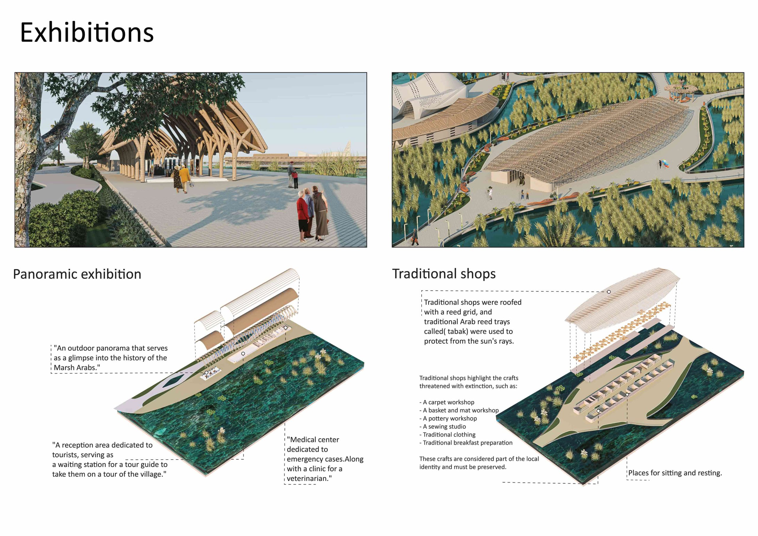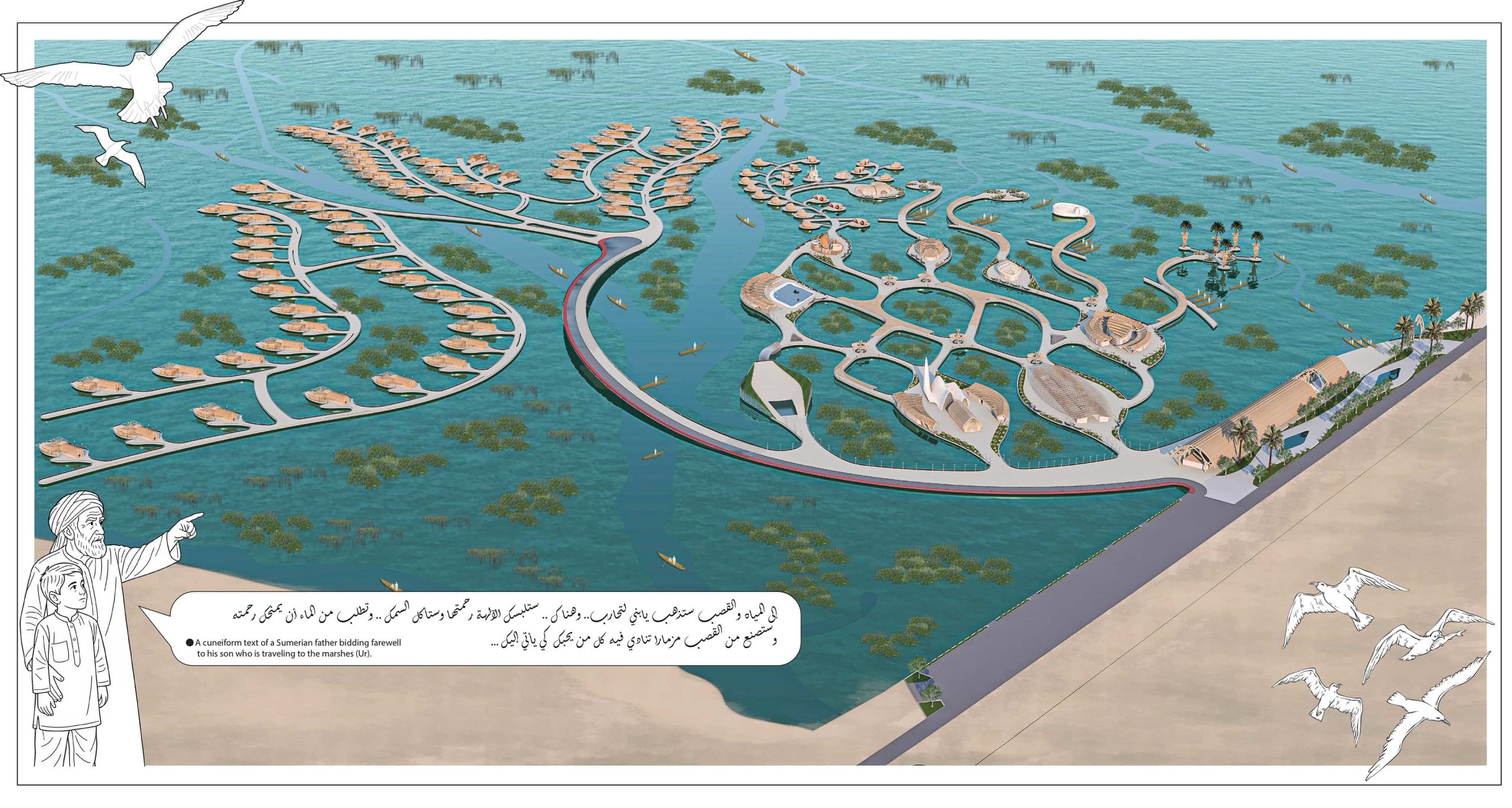 The marshes face increasing challenges, highlighting the need for integrated architectural solutions to address environmental degradation and social and economic decline. With rising displacement rates and the extinction of traditional crafts, the project’s design, focused on sustainability, can positively impact the revival of the cultural identity of the marshes, making it a model for sustainable tourist villages globally.