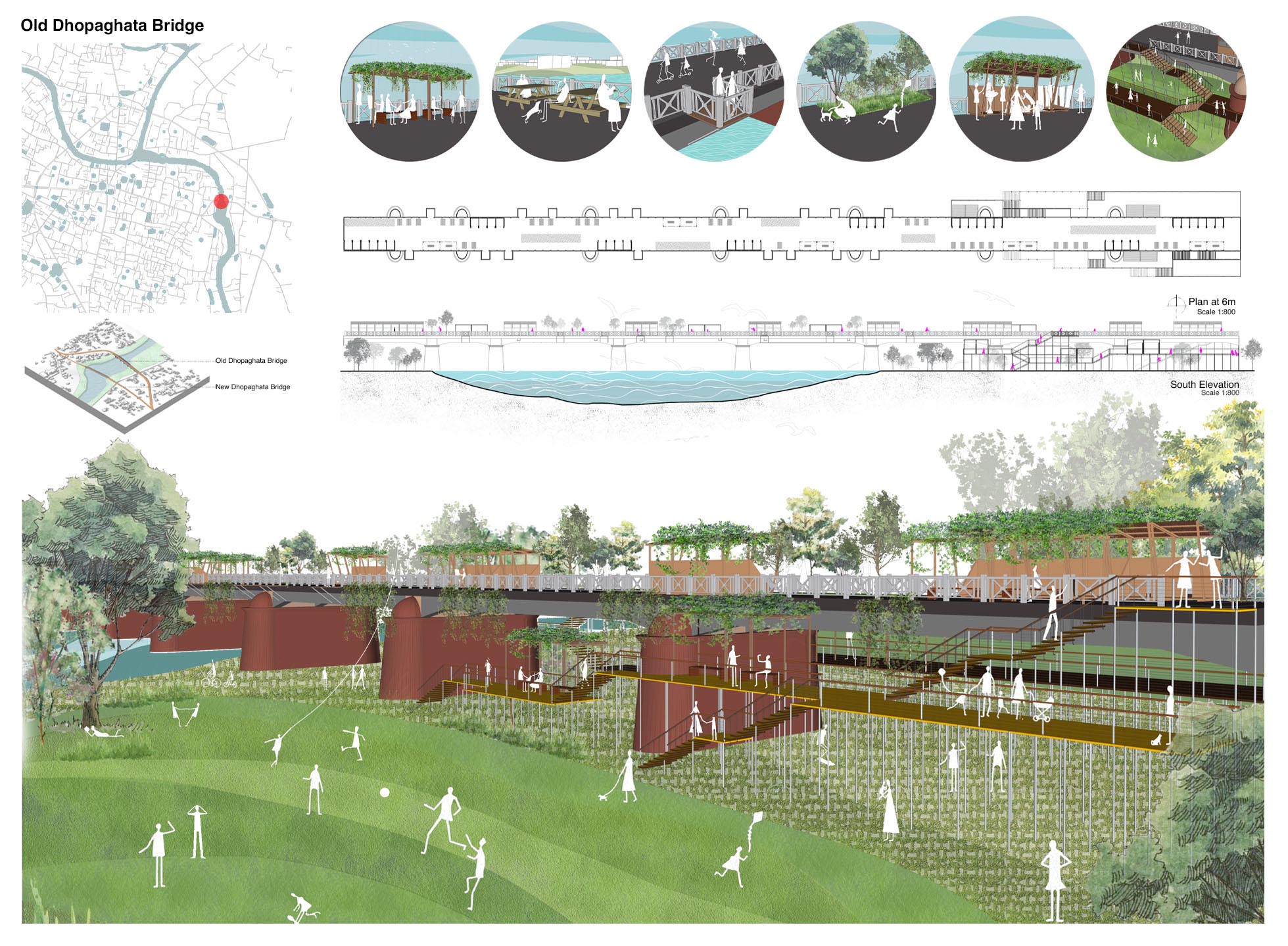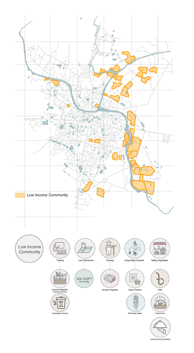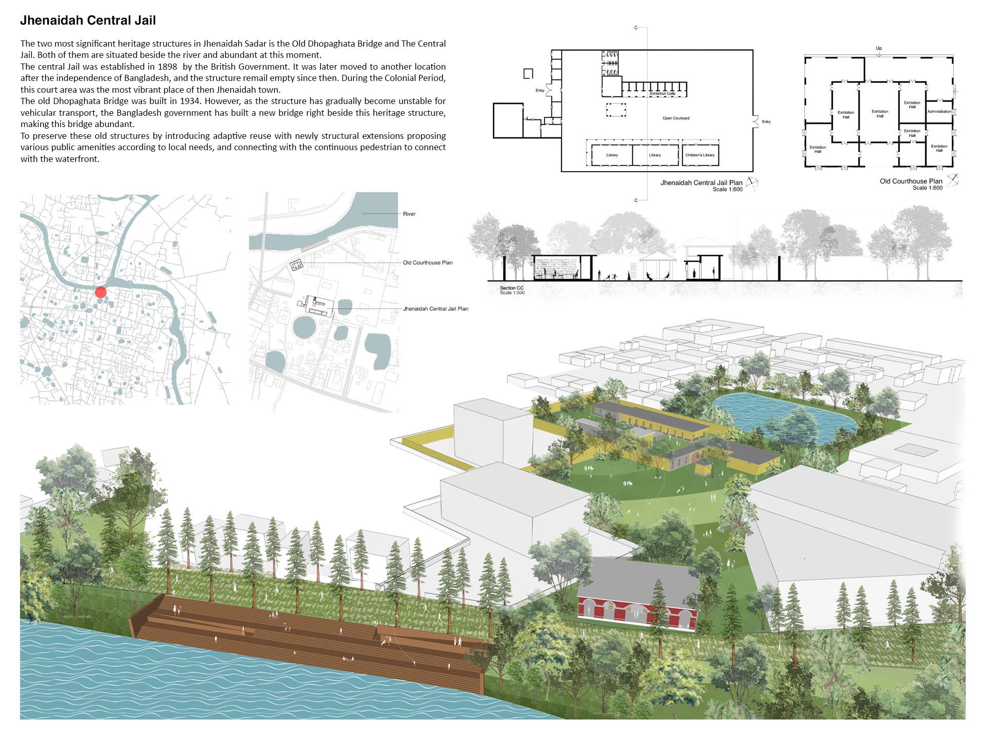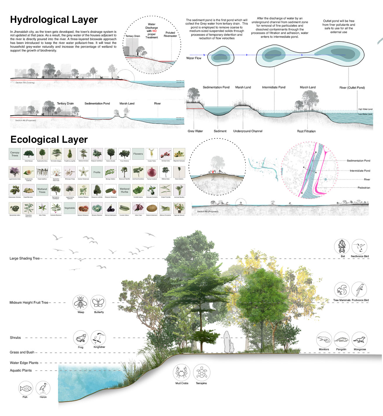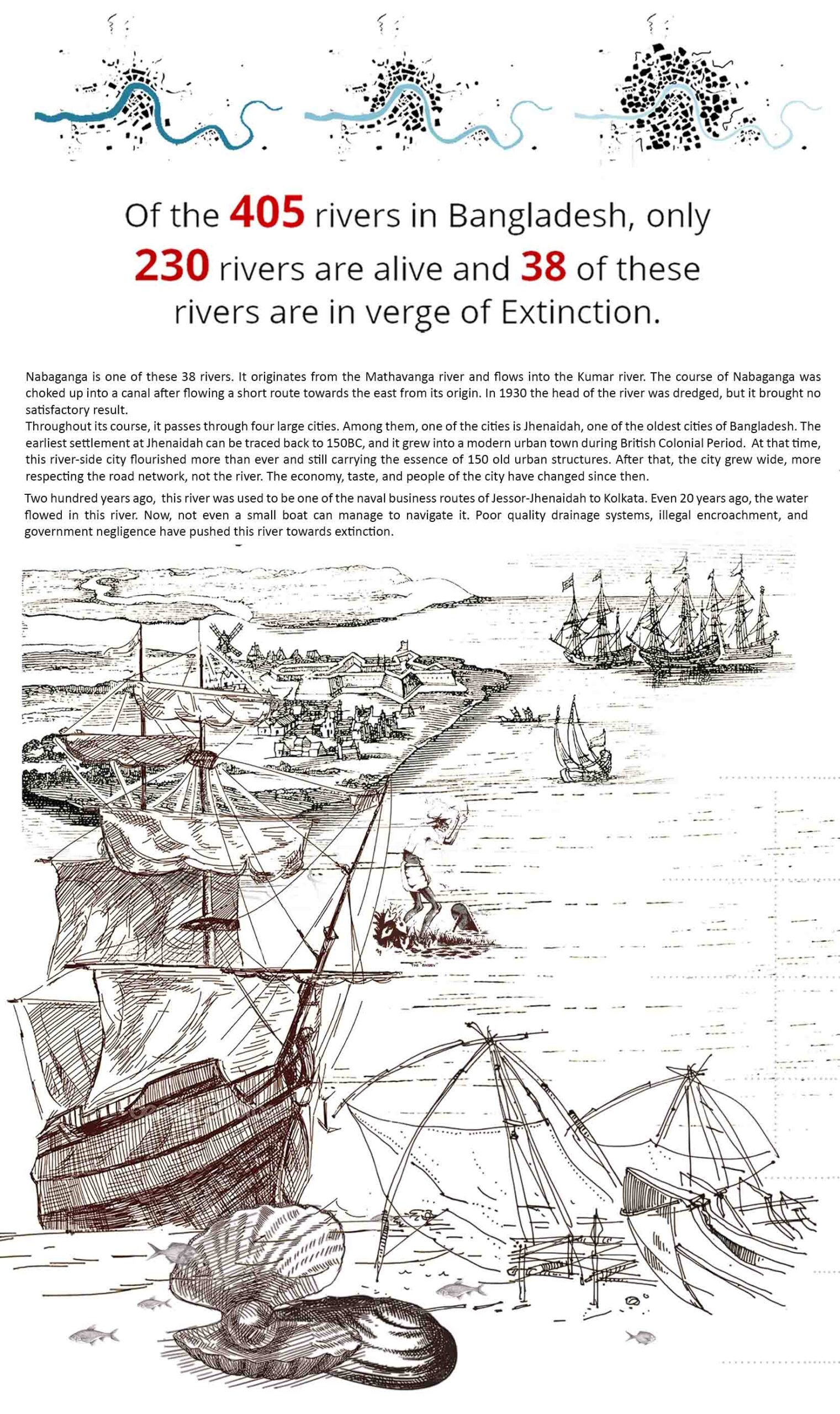 As a result, of the 405 rivers in Bangladesh, only 230 are now alive. Sadly, 38 of them are on the verge of extinction. This project aims to bring back an urban river from the “backyard” to the “front yard” and mend the river and city relationship by using Nabaganga River and Jhenaidah City as a framework. It aims to make the people aware of the asset that passes through their town and revive the ecological aspect of the river and its adjacent land by creating a network system between nature and the people. The design proposes a four-layered solution. First, a ‘Hydrological Layer’ will treat the open grey water naturally and keep the river water pollution-free. Second, an ‘Ecological Layer’ will support onsite water treatment and revive the biodiversity of the adjacent riverbank. A ‘Cultural Layer,’ which will shed light on the historical and traditional context of the city. This layer will tie the old and new, city and traditions together.
