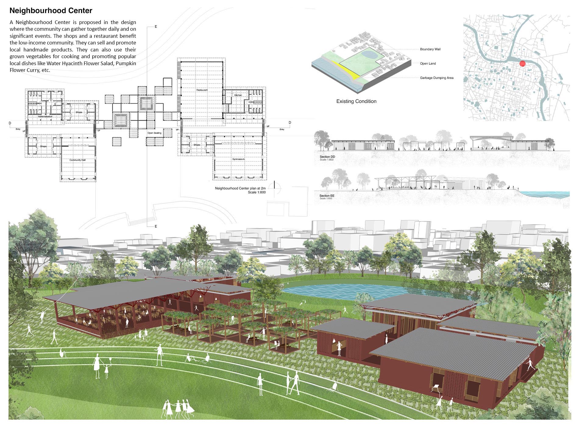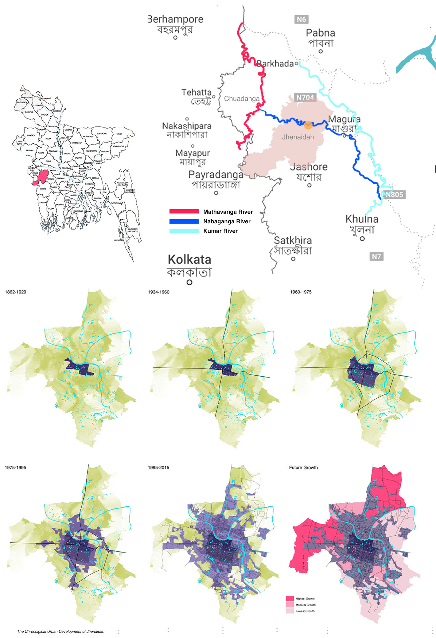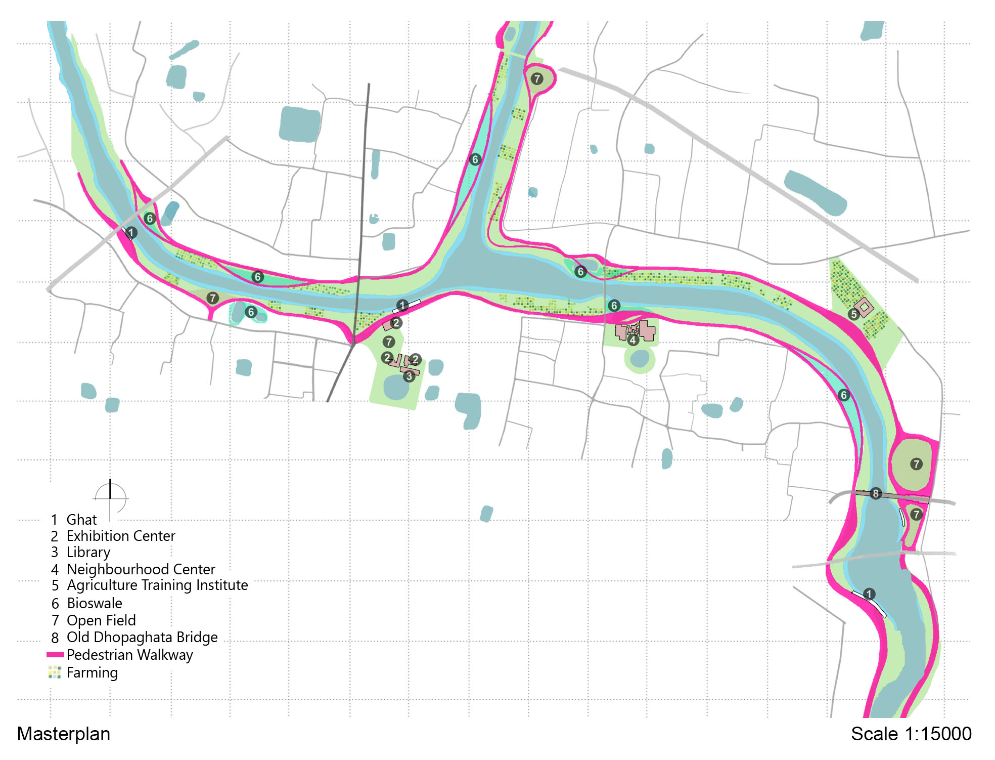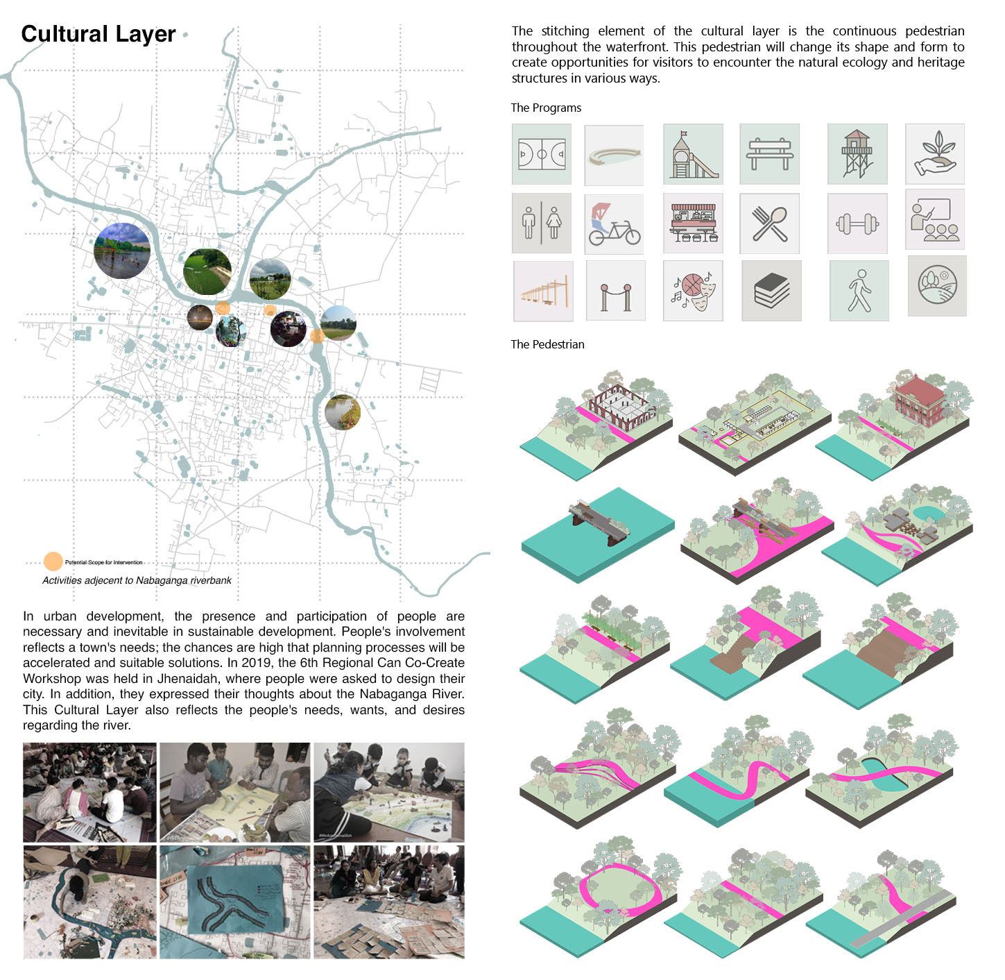 As a result, of the 405 rivers in Bangladesh, only 230 are now alive. Sadly, 38 of them are on the verge of extinction. This project aims to bring back an urban river from the “backyard” to the “front yard” and mend the river and city relationship by using Nabaganga River and Jhenaidah City as a framework. It aims to make the people aware of the asset that passes through their town and revive the ecological aspect of the river and its adjacent land by creating a network system between nature and the people. The design proposes a four-layered solution. First, a ‘Hydrological Layer’ will treat the open grey water naturally and keep the river water pollution-free. Second, an ‘Ecological Layer’ will support onsite water treatment and revive the biodiversity of the adjacent riverbank. A ‘Cultural Layer,’ which will shed light on the historical and traditional context of the city. This layer will tie the old and new, city and traditions together.