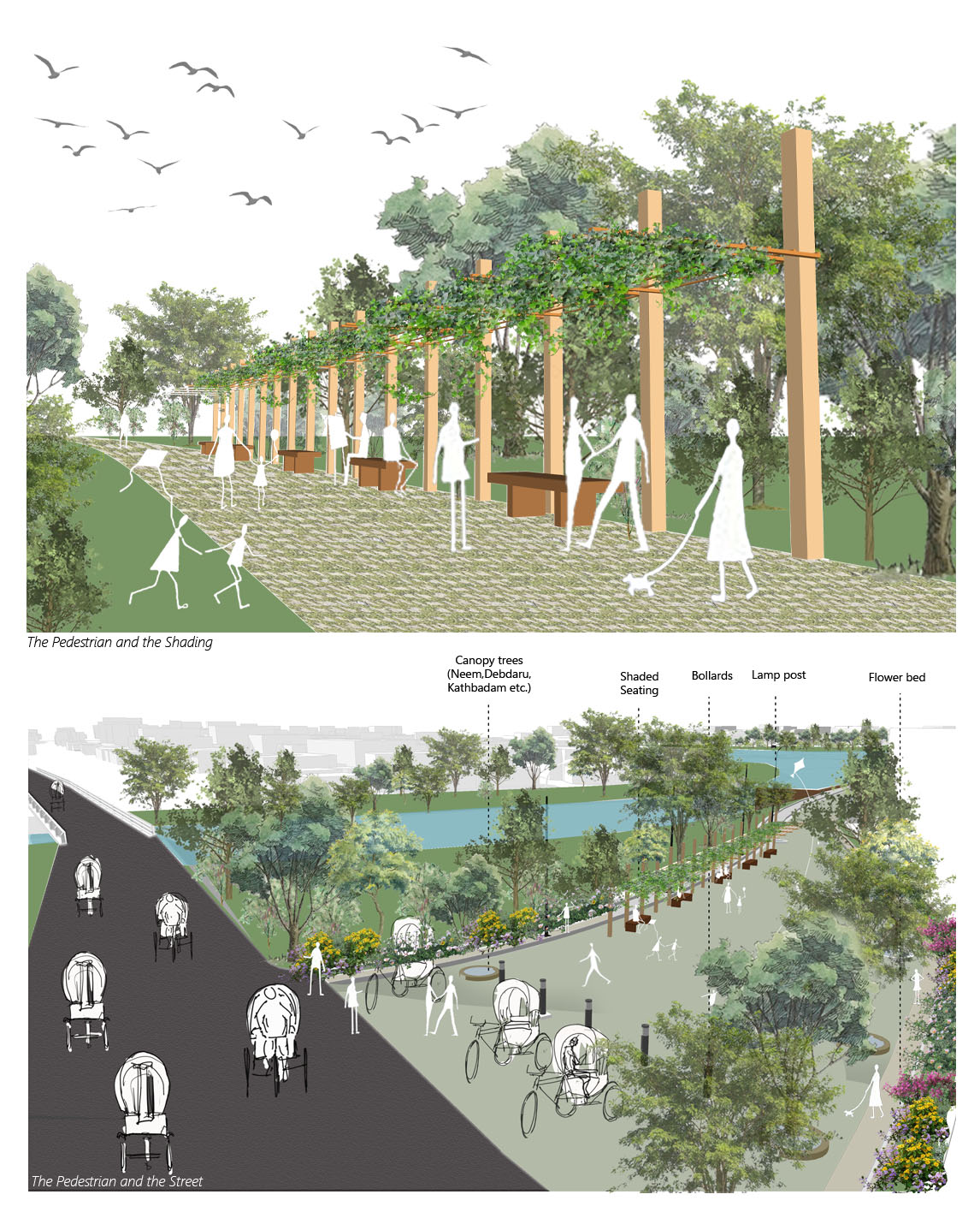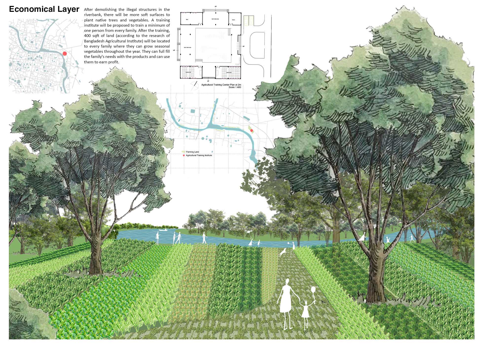 History tells us the economy of Bangladesh had grown beside the rivers, and as the land adjacent to the river is more vulnerable and cheap, the urban poor in our country tend to live beside the river. So that is why the final stage of the design process- ‘Economical Layer,’ by which the low-income community living beside the riverbank can benefit. All four layers will create an experience for the people by adding public functions and natural elements and showcasing the historical features. Once people realize the value of this asset, the city will automatically celebrate the river. Celebrating nature also has a spontaneous ripple effect. For example, being a riverine country, Bangladeshi towns and villages have countless ponds, wetlands, and puddles. If the most significant water body of the city is revived, it will later pass its impact on the smaller water bodies. It will lead the city to sustainable pond-centric urbanism.