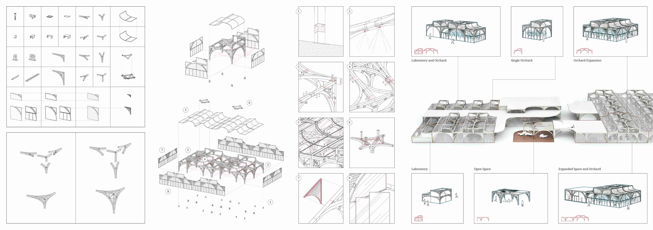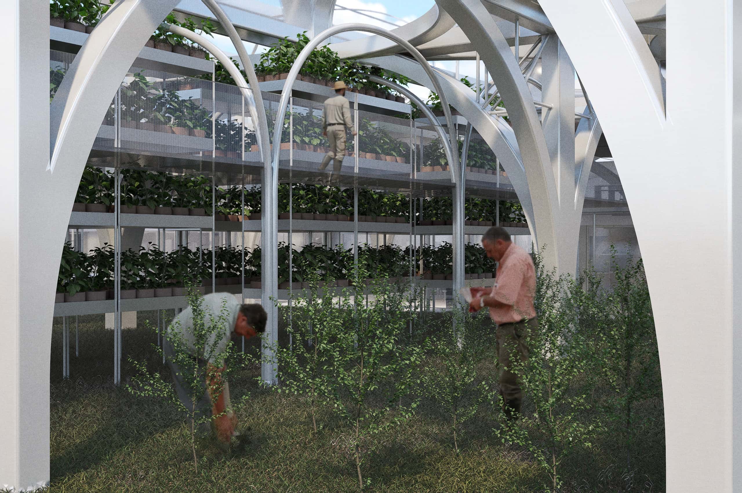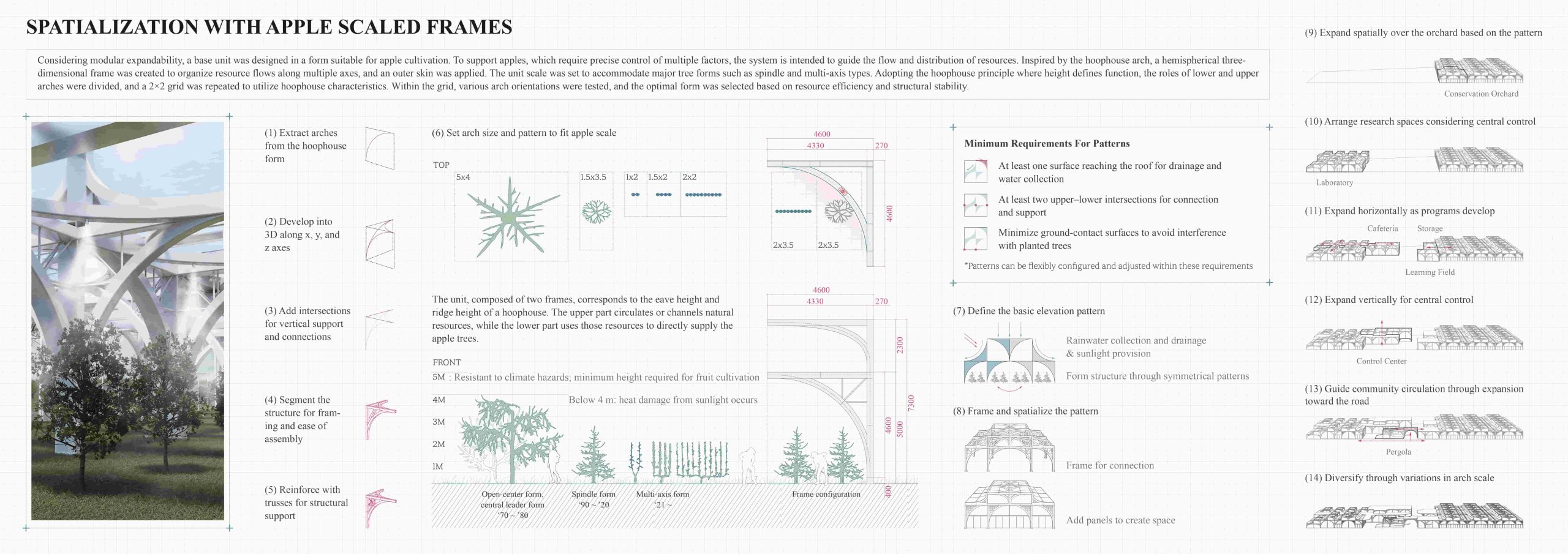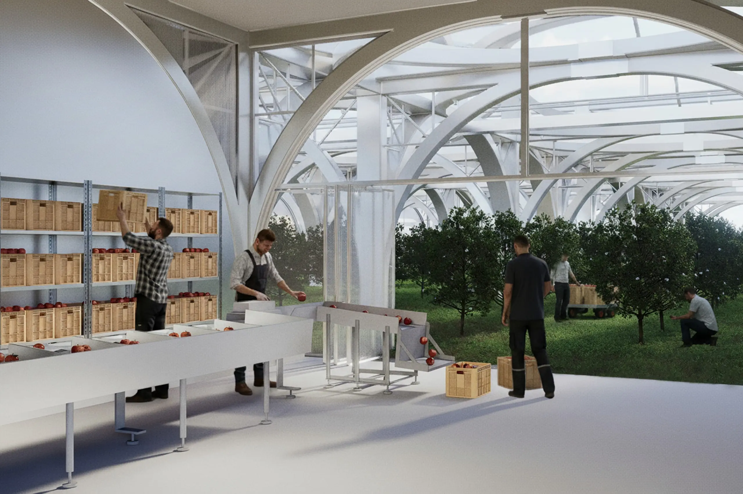 This modular design is adaptable to an uncertain future, allowing for potential expansion. The project extends beyond simple apple cultivation, exploring new architectural models for agriculture on a global scale that can effectively respond to climate change.