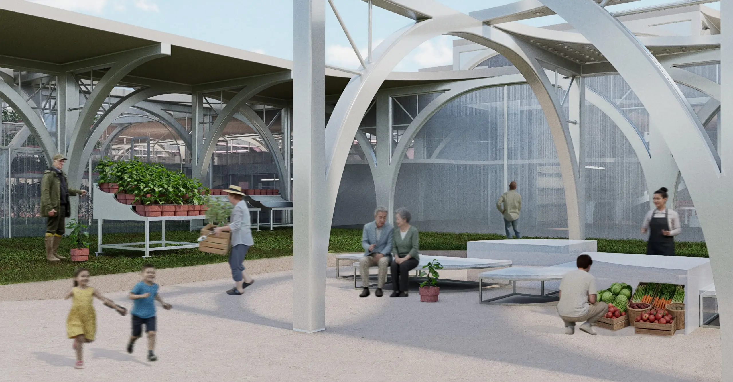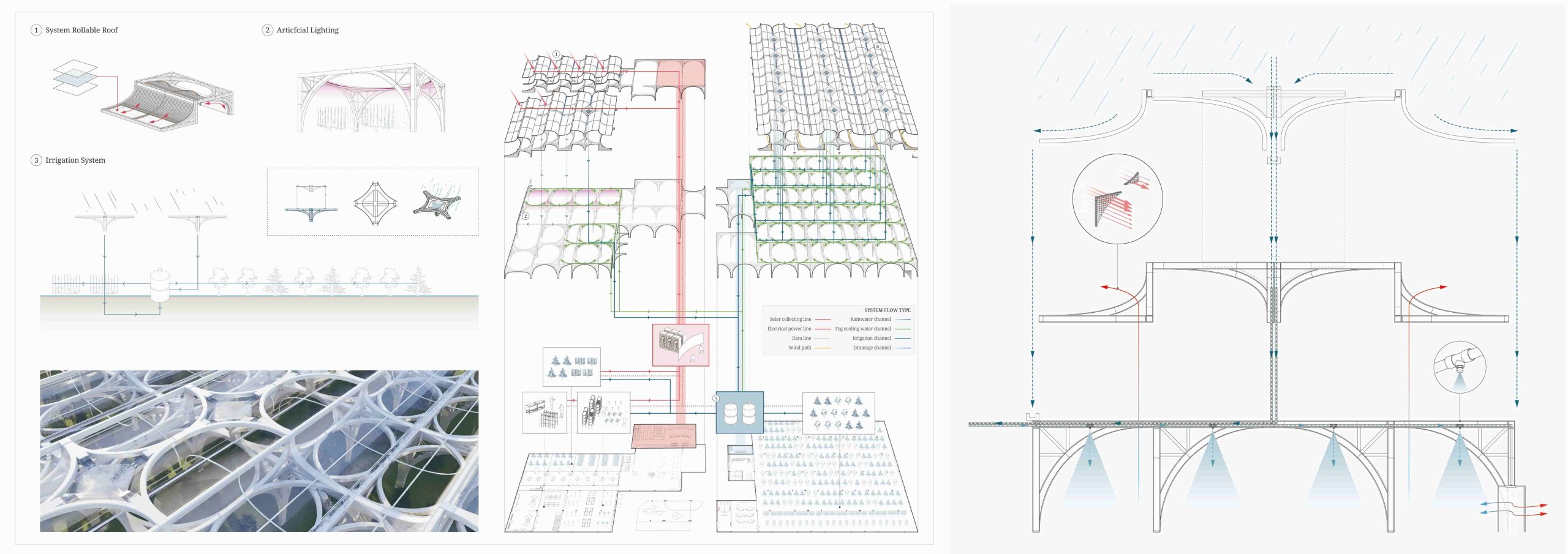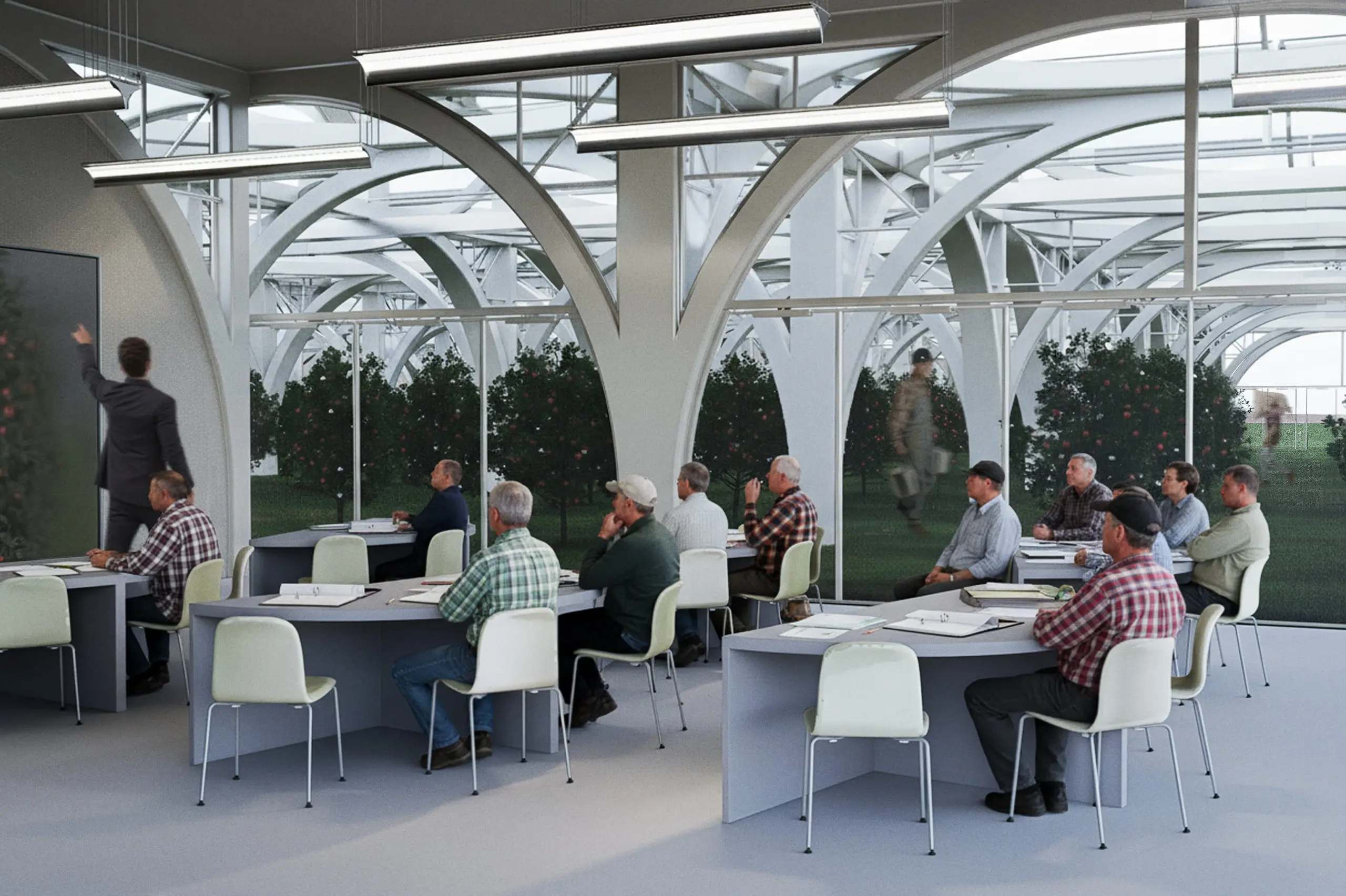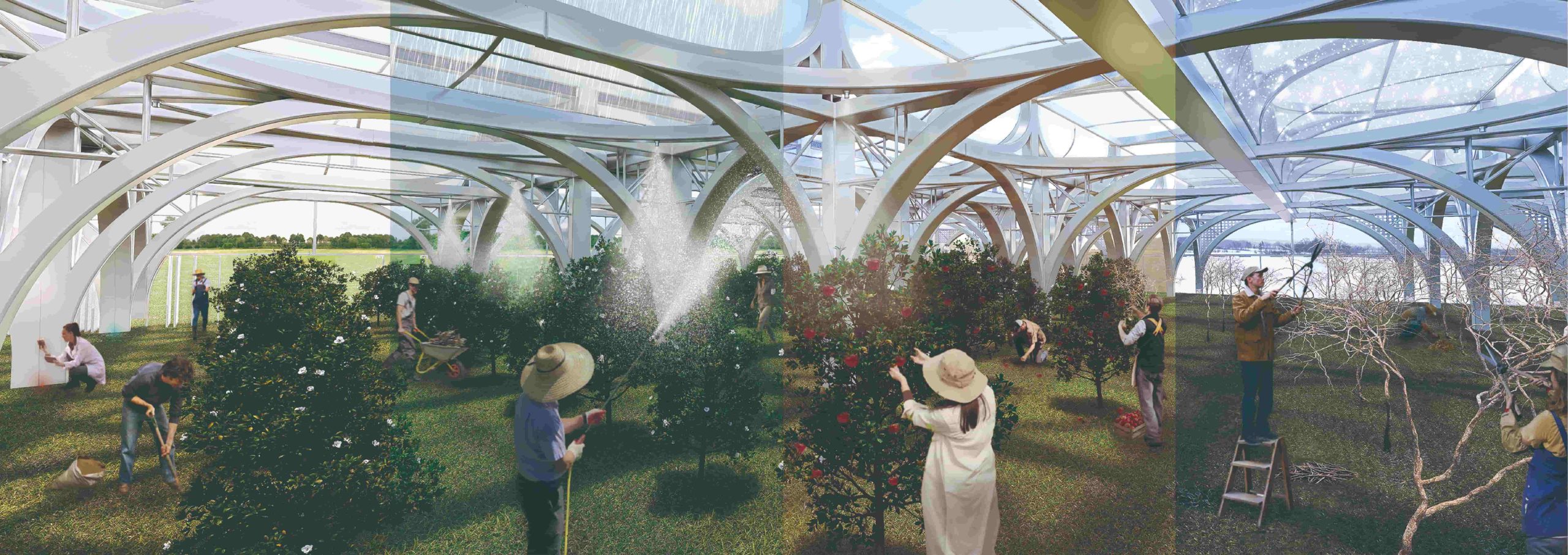 This modular design is adaptable to an uncertain future, allowing for potential expansion. The project extends beyond simple apple cultivation, exploring new architectural models for agriculture on a global scale that can effectively respond to climate change.