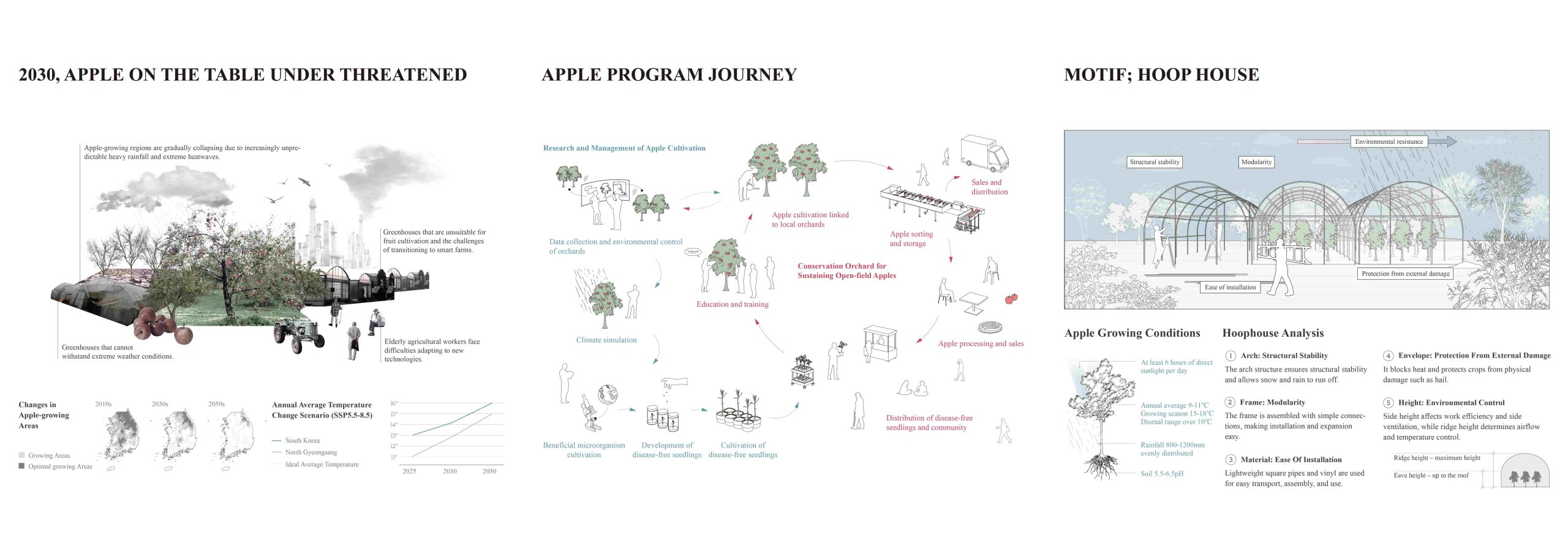 Climate change is shifting apple cultivation north, challenging production in Gyeongbuk, while high costs and aging farmers limit smart farm adoption and orchard transition. This project proposes a flexible, modular orchard model integrating cultivation, research, and community while respecting traditional open-field practices.