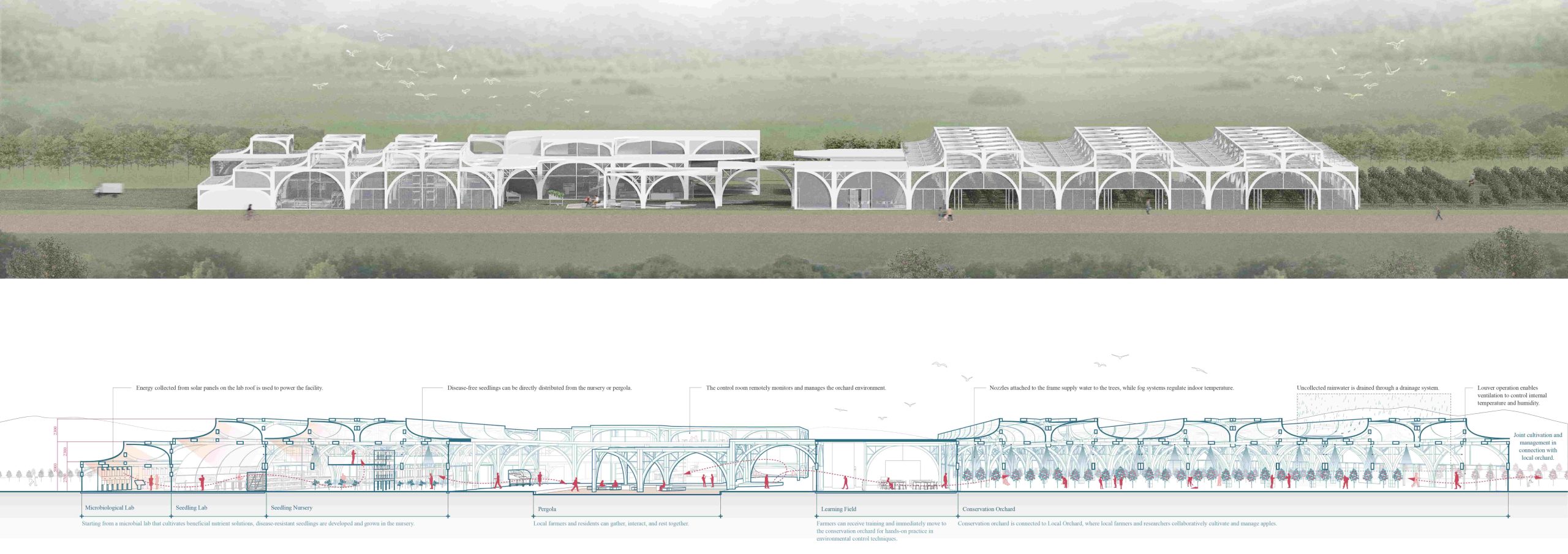 The government’s proposed solution of smart farms is challenging to implement due to the aging farming population and high initial costs. This project offers an architectural alternative: a model that combines sustainable production with research. By integrating existing orchards with a research facility, we can study climate-resilient apple varieties and cultivation methods. Data collected on soil and climate is then applied directly to the orchard for experimentation and educational purposes.
