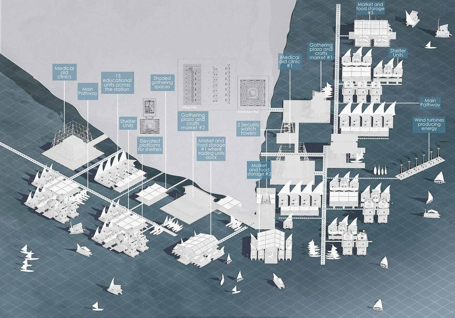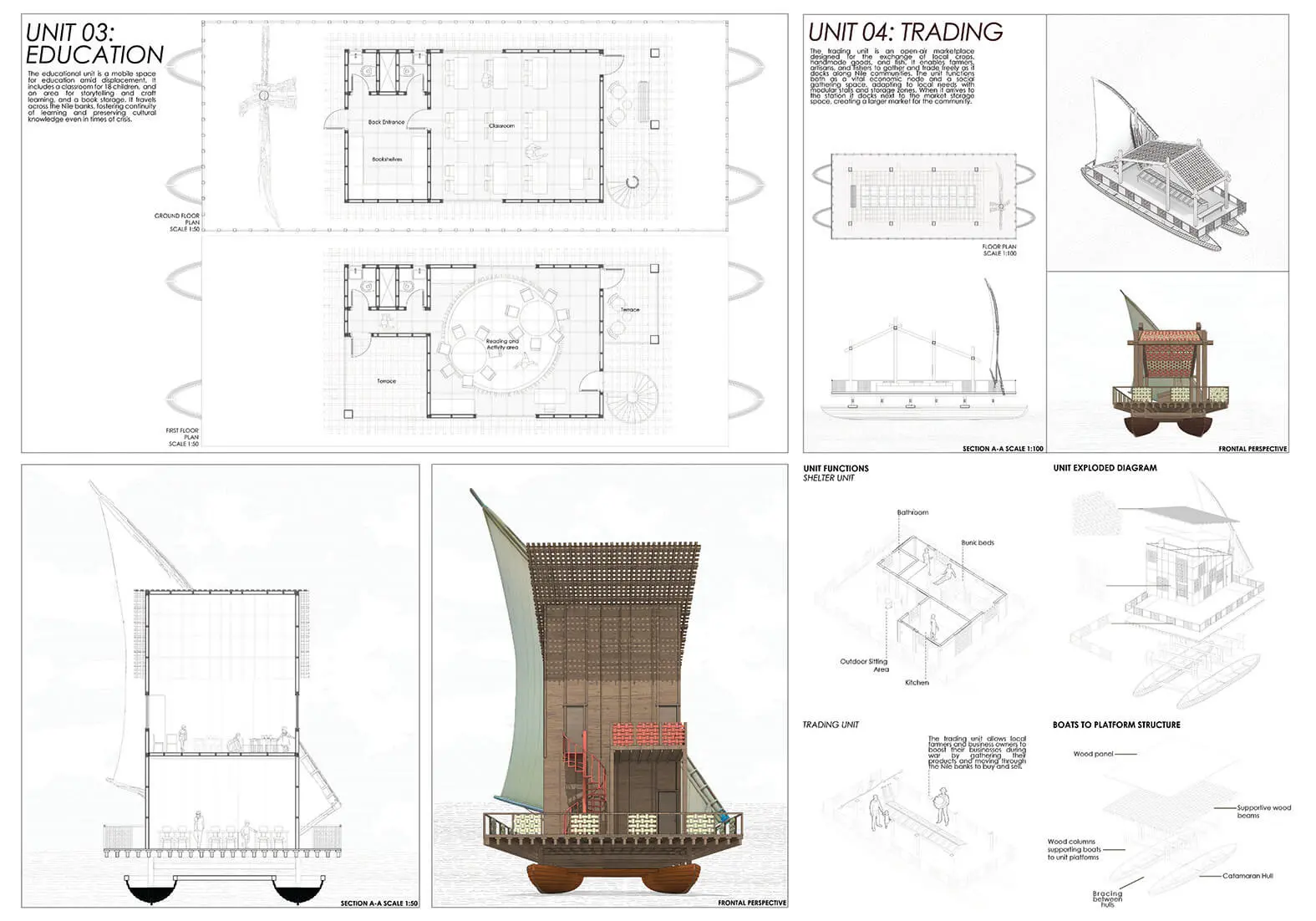 Nile Settlements proposes a system of floating, mobile settlements along the Nile River to provide safe and adaptable shelters for people displaced by the ongoing civil war and the potential risks posed by the Grand Ethiopian Renaissance Dam. The design draws inspiration from local wood boat-building craft to develop modular floating units. These units travel between floating secure stations located along the Nile’s shore. The stations integrate basic services and resource systems to support displaced communities in both the immediate short term and long term.