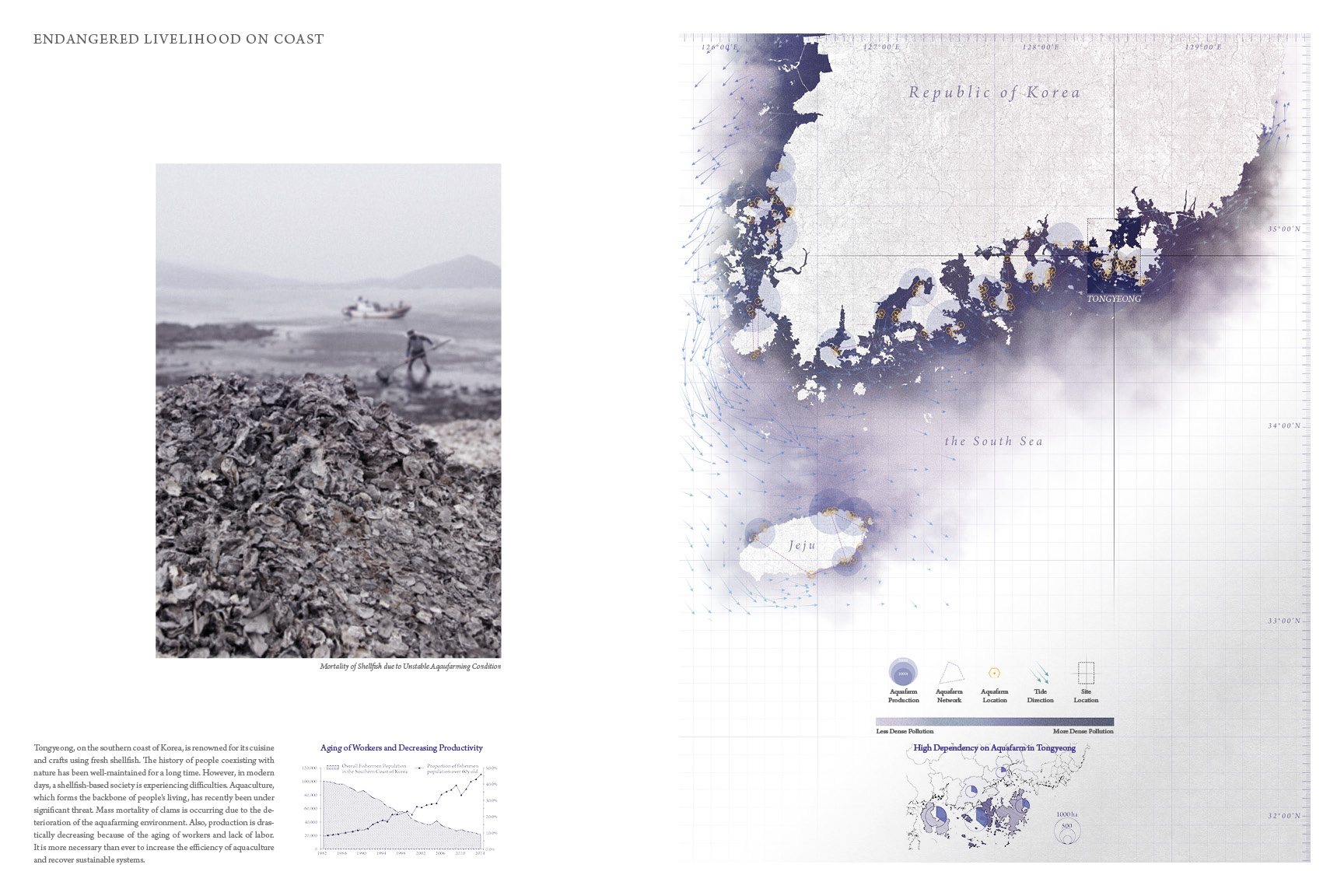 Tongyeong, on the Southern Coast of South Korea, has been famous for its cuisine and crafts using fresh shellfish. The history of people coexisting with nature has been well-maintained for a long time. However, in modern days, a shellfish-based society is experiencing difficulties. Aquafarming, the backbone of people’s living, has been under significant threat. Mass mortality of clams is occurring due to the deterioration of the aquafarming environment. Also, production is decreasing because of the aging of the workers and lack of labor. It is more necessary than ever to increase the efficiency of aquaculture and recover sustainable systems.