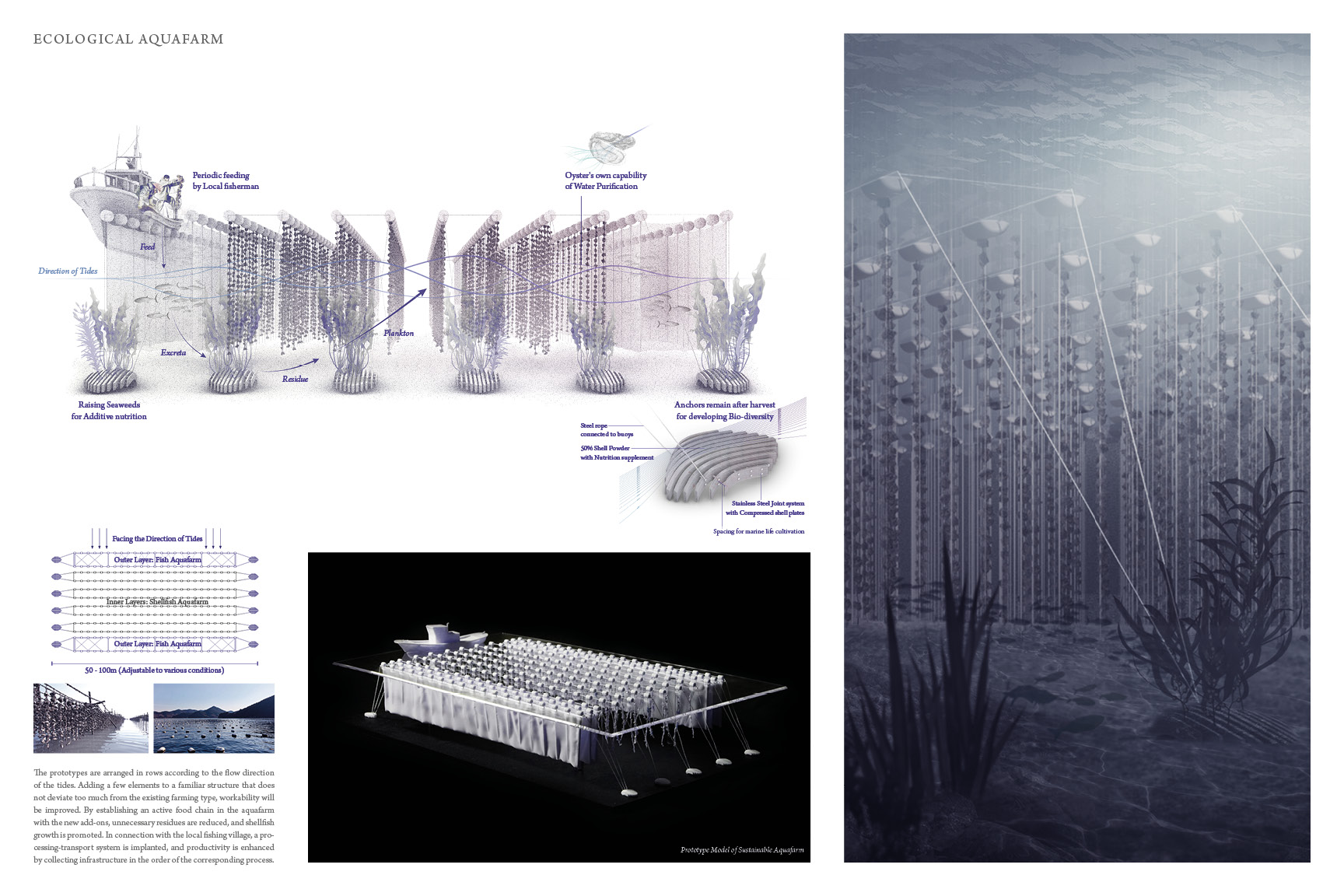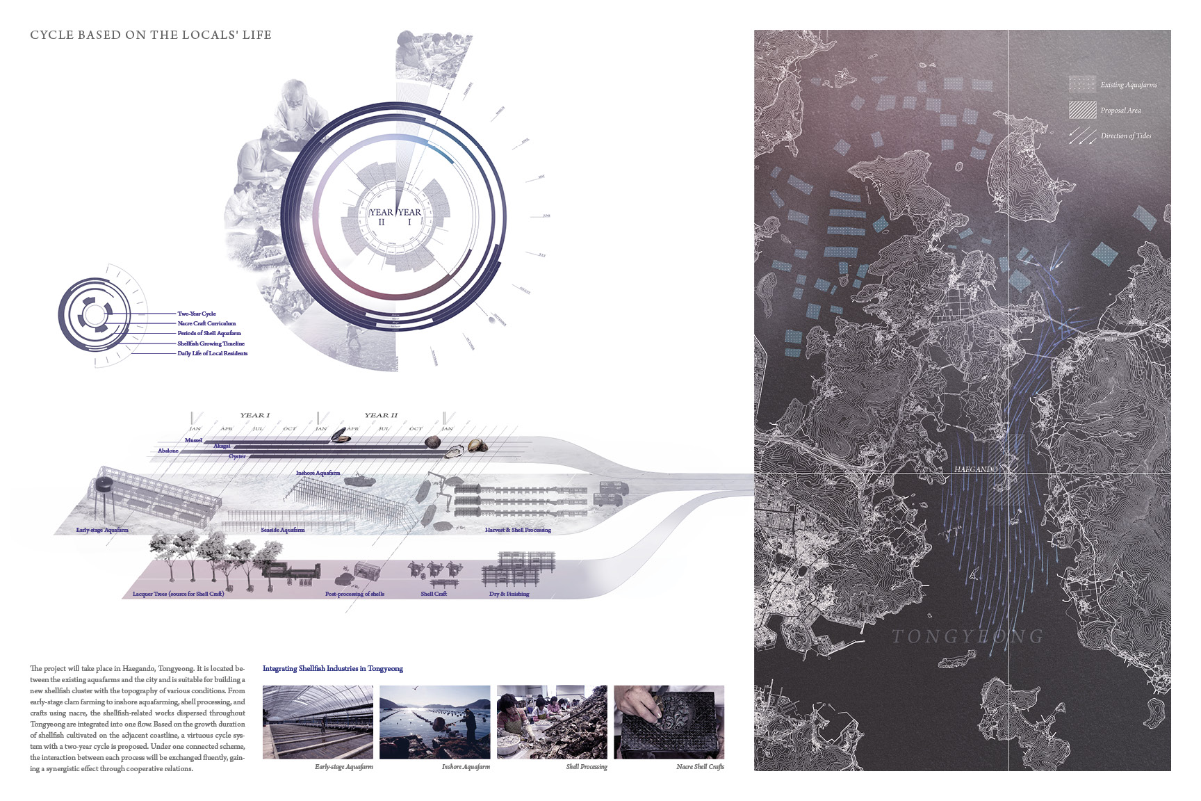 An integrated scheme is proposed for a coastal shellfish-based society. A customized retrofit method that starts with existing elements found in the environs would be suitable to restore an organic relationship between humans and nature. By examining the life cycle of shellfish and the locals, an architectural type that operates in sync with the new ecologically combined aquafarms is suggested under a circulation system.