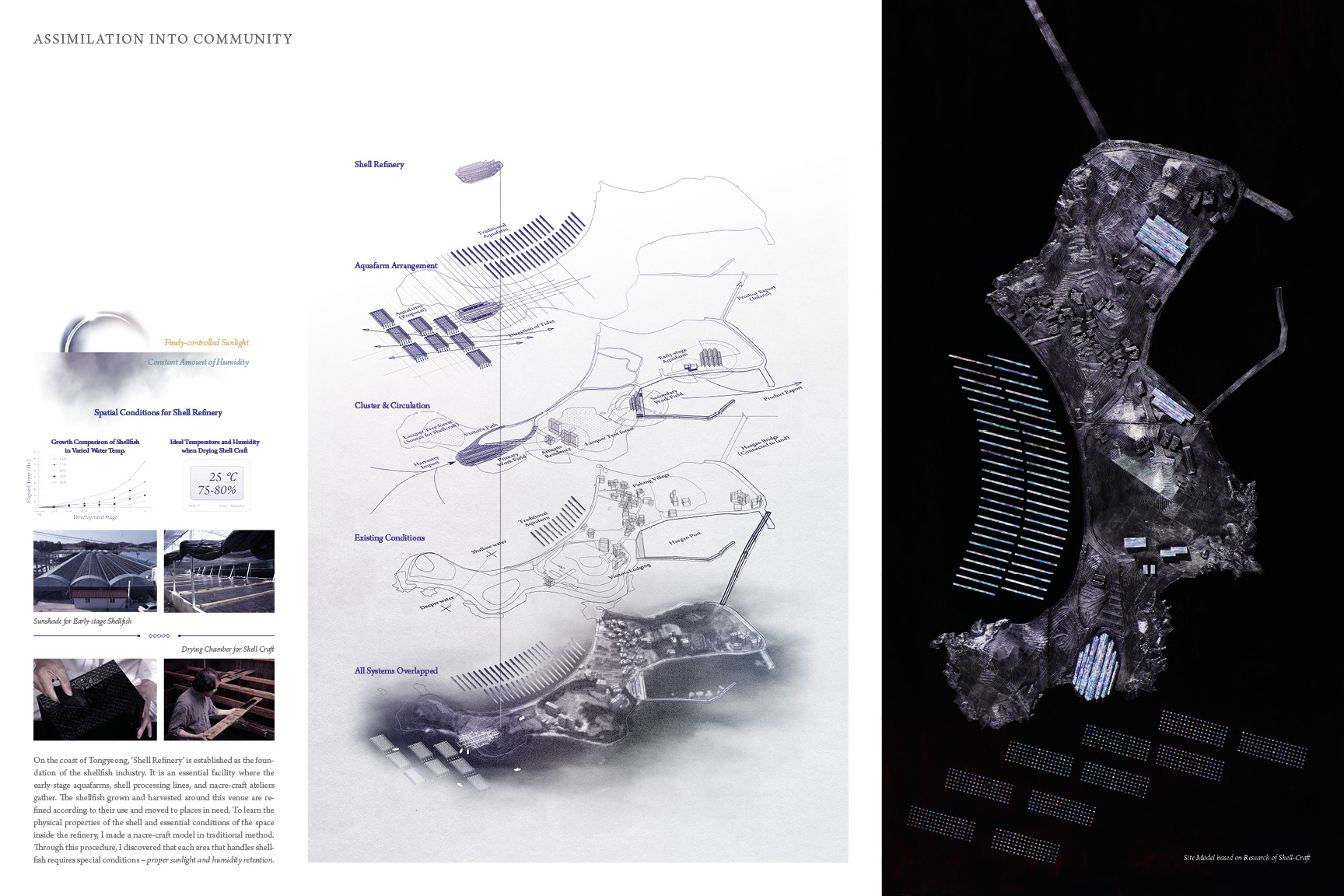 To learn the physical properties of the shell and essential conditions of the space inside the refinery, I made a nacre-craft model in traditional method. Through this procedure, I discovered that each area that handles shellfish requires special conditions – proper sunlight and humidity retention.