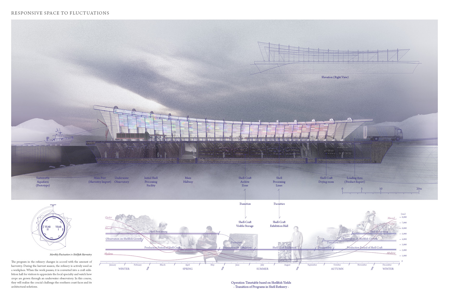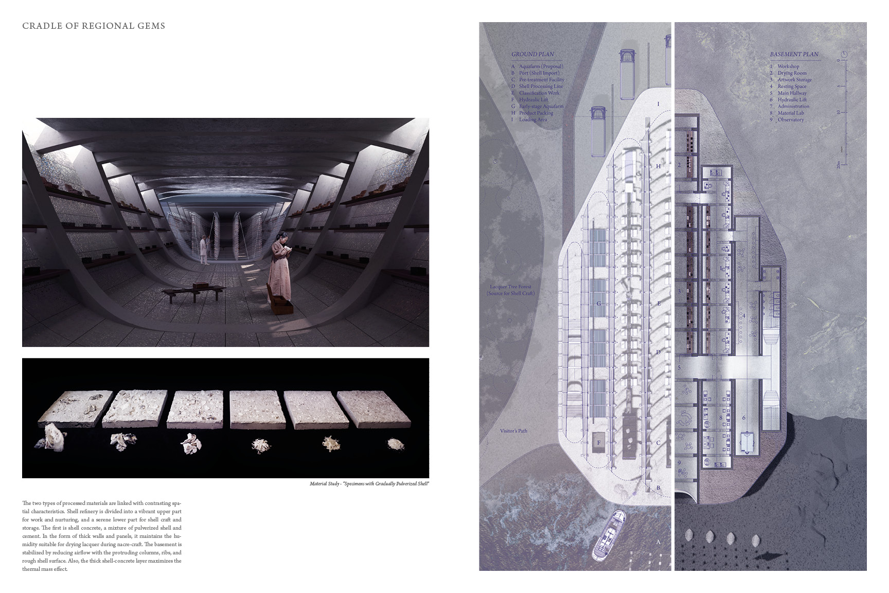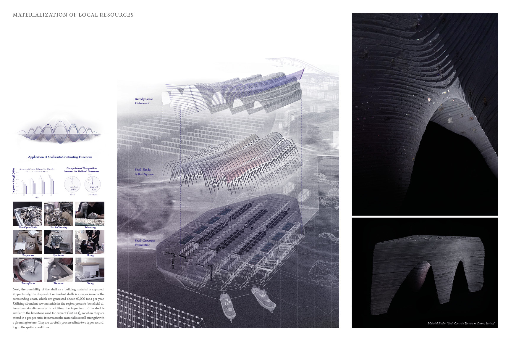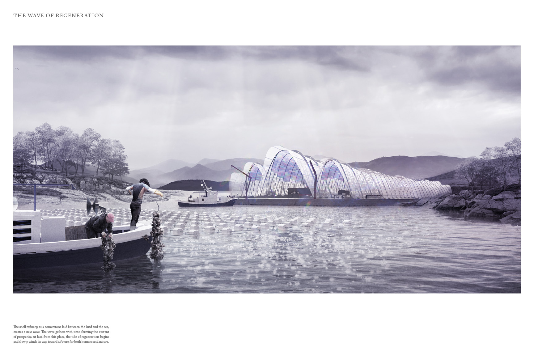 The shell refinery, as a cornerstone laid between the land and the sea, creates a new wave. The wave gathers with time, forming the current of prosperity. At last, from this place, the tide of regeneration begins and slowly winds its way toward a future for both humans and nature.