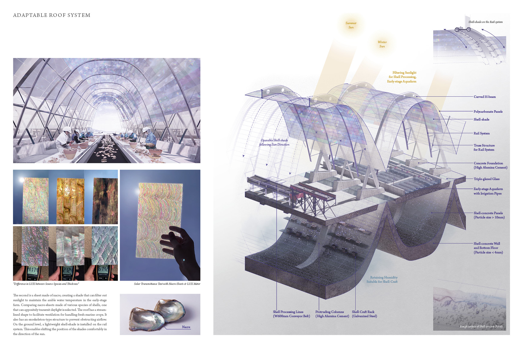 The roof has a streamlined shape to facilitate ventilation for handling fresh marine crops. It also has an exoskeleton-type structure to prevent obstructing airflow. On the ground level, a lightweight shell-shade is installed on the rail system. This enables shifting the position of the shades comfortably in the direction of the sun.