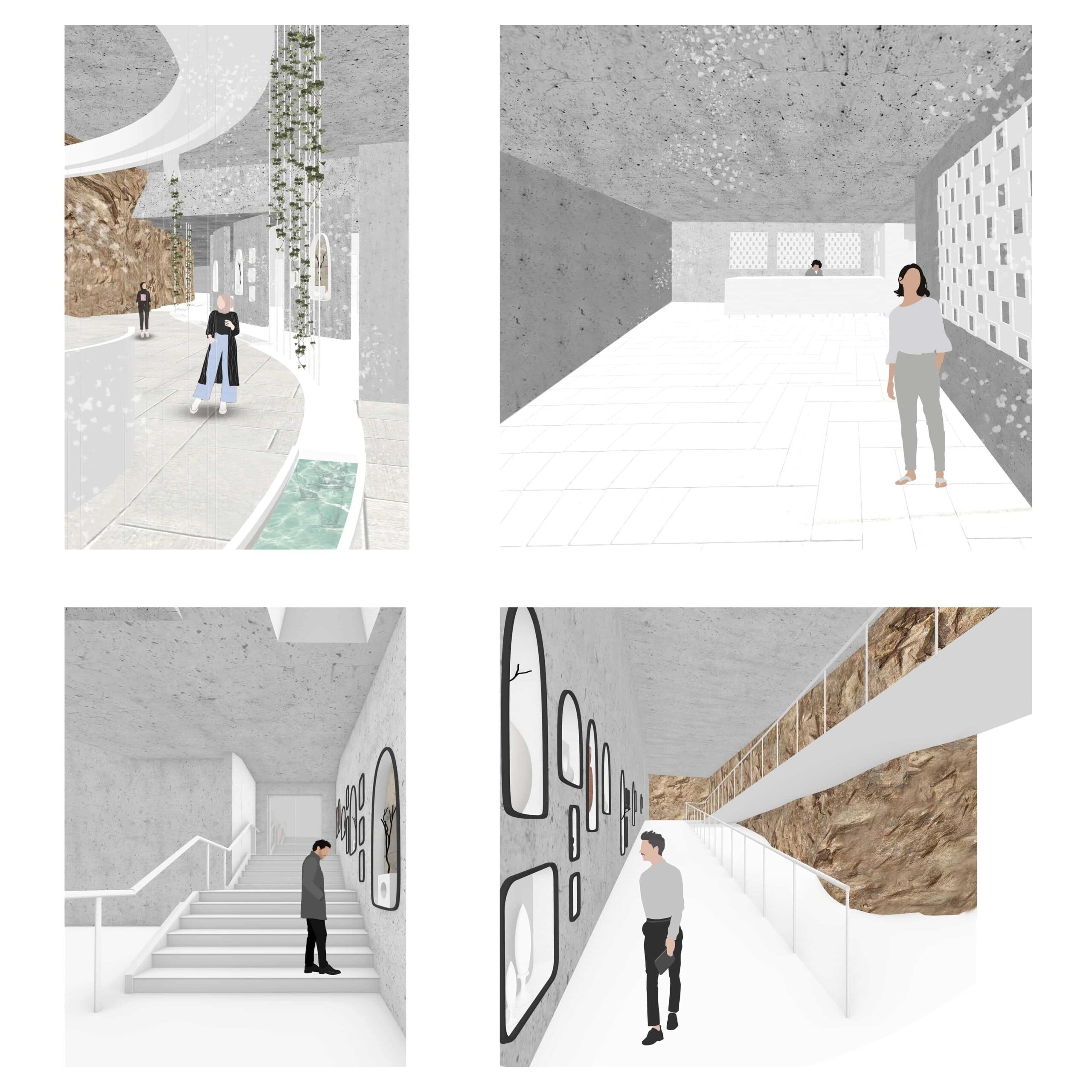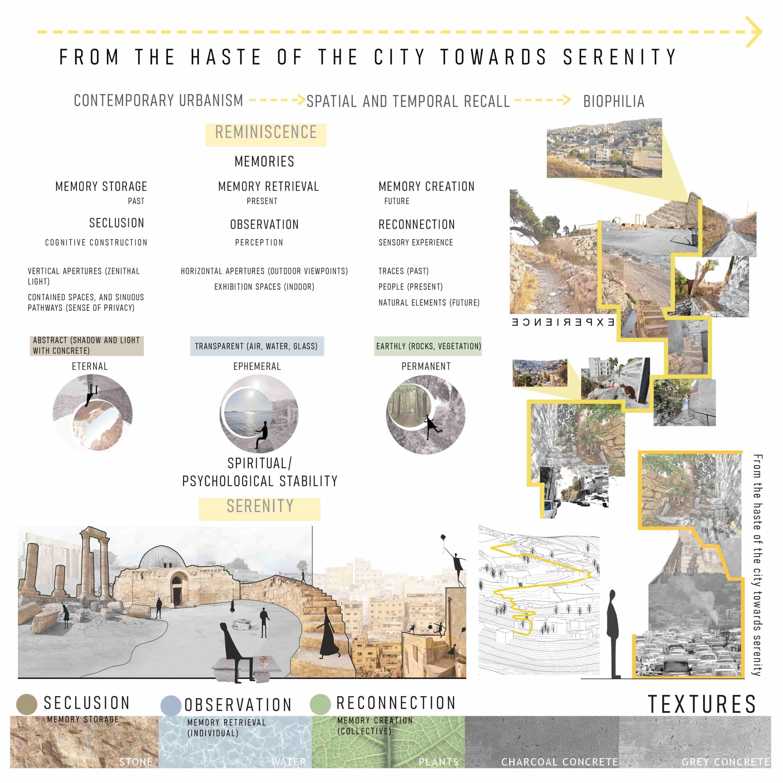 With cultural amnesia and fast, monotonous, and incoherent urban developments, preserving memory is becoming widely important. The project, as a continuation of the historic site, serves as a transitional zone from the crowded city towards a serene site with a spiritual aura of the past, while exhibiting the concept of memory, through episodes of reminiscence, created by human traces and spatial experiences.