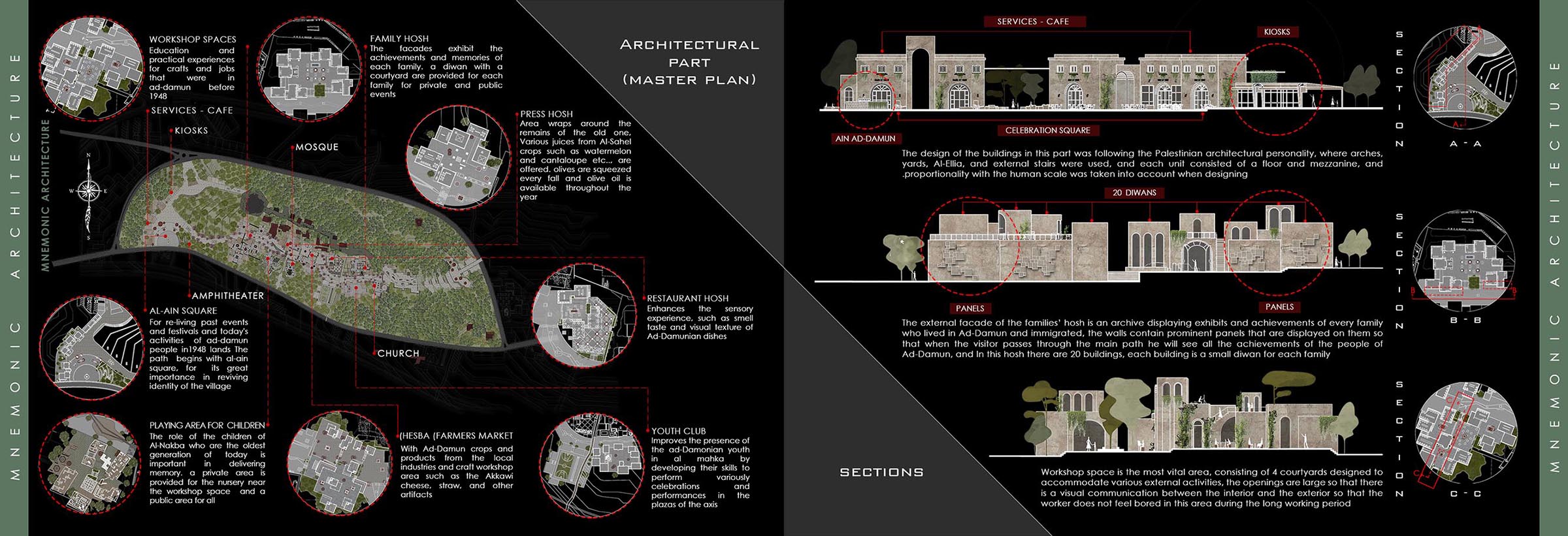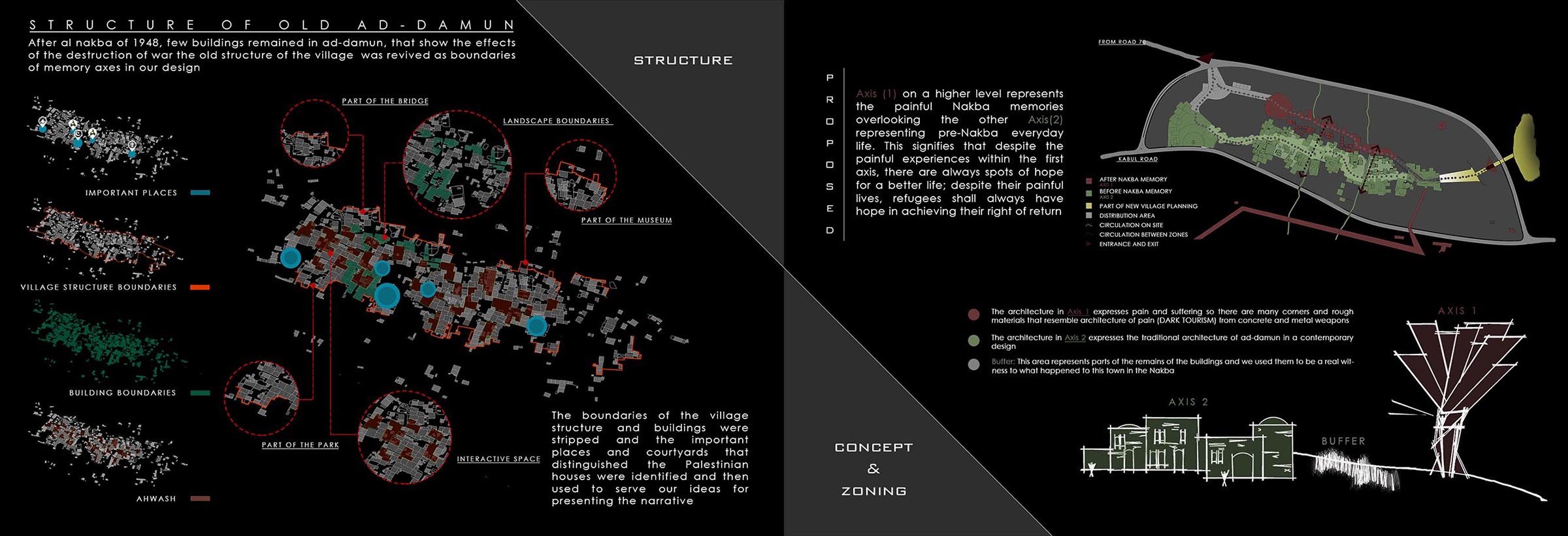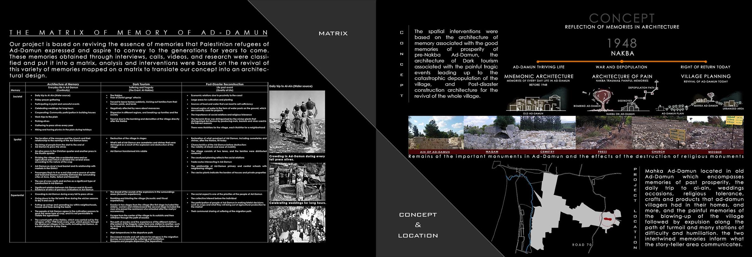 Analysis and interventions were based on the revival of this variety of memories mapped on a matrix (see sheet 1 of the project) to translate our concept into an architectural design. The spatial interventions were based on the Architecture of memory associated with the good memories of the prosperity of pre-Nakba Ad-Damun, the architecture of Dark tourism associated with the painful tragic events leading up to the catastrophic depopulation of the village, and Post-disaster reconstruction architecture for the revival of the whole village.