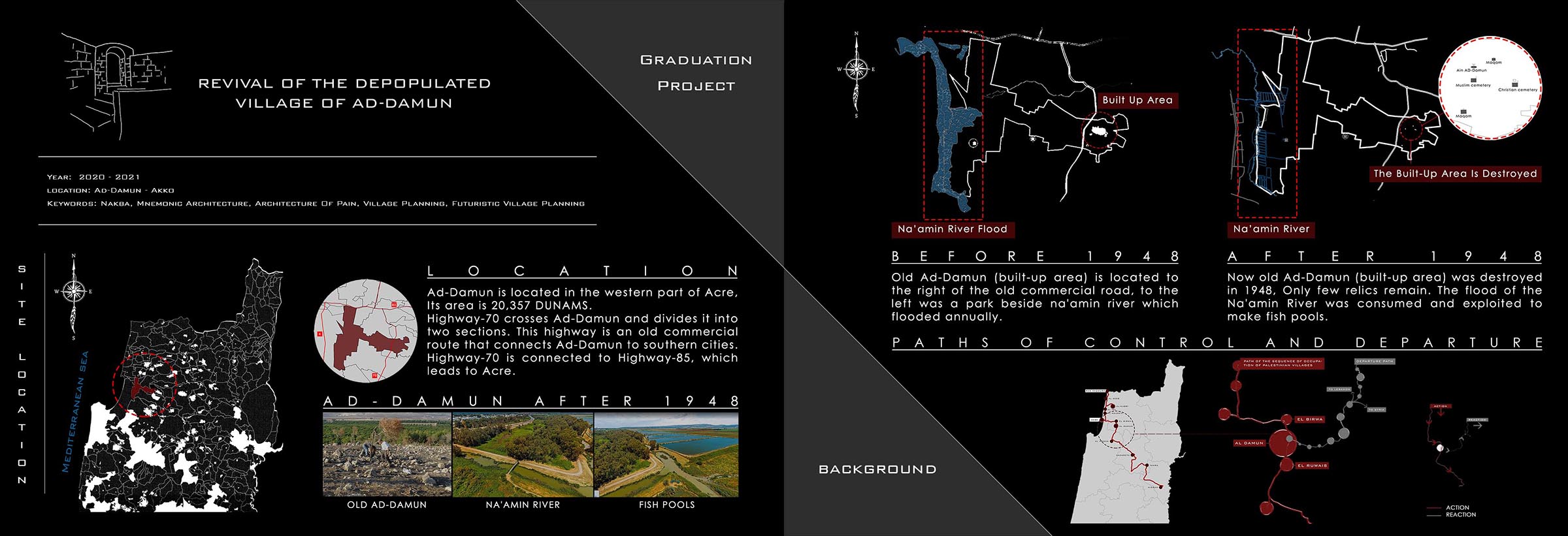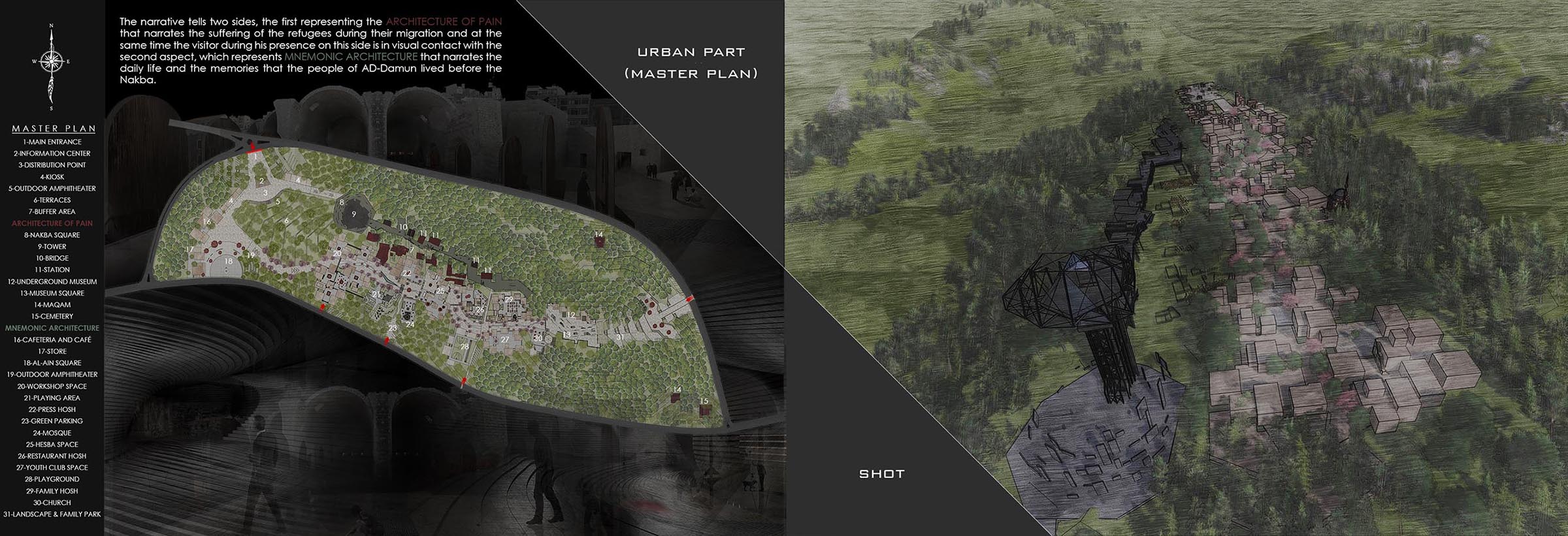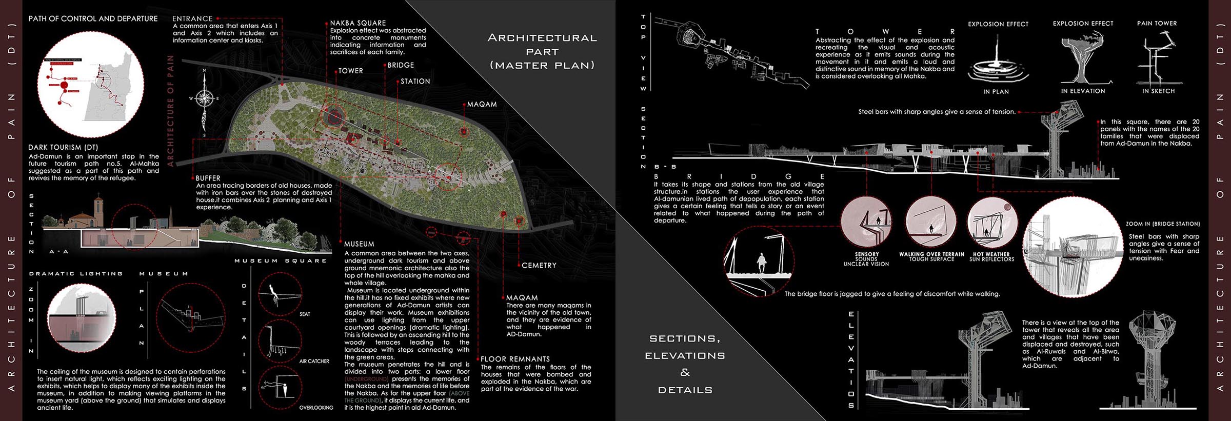 Analysis and interventions were based on the revival of this variety of memories mapped on a matrix (see sheet 1 of the project) to translate our concept into an architectural design. The spatial interventions were based on the Architecture of memory associated with the good memories of the prosperity of pre-Nakba Ad-Damun, the architecture of Dark tourism associated with the painful tragic events leading up to the catastrophic depopulation of the village, and Post-disaster reconstruction architecture for the revival of the whole village.