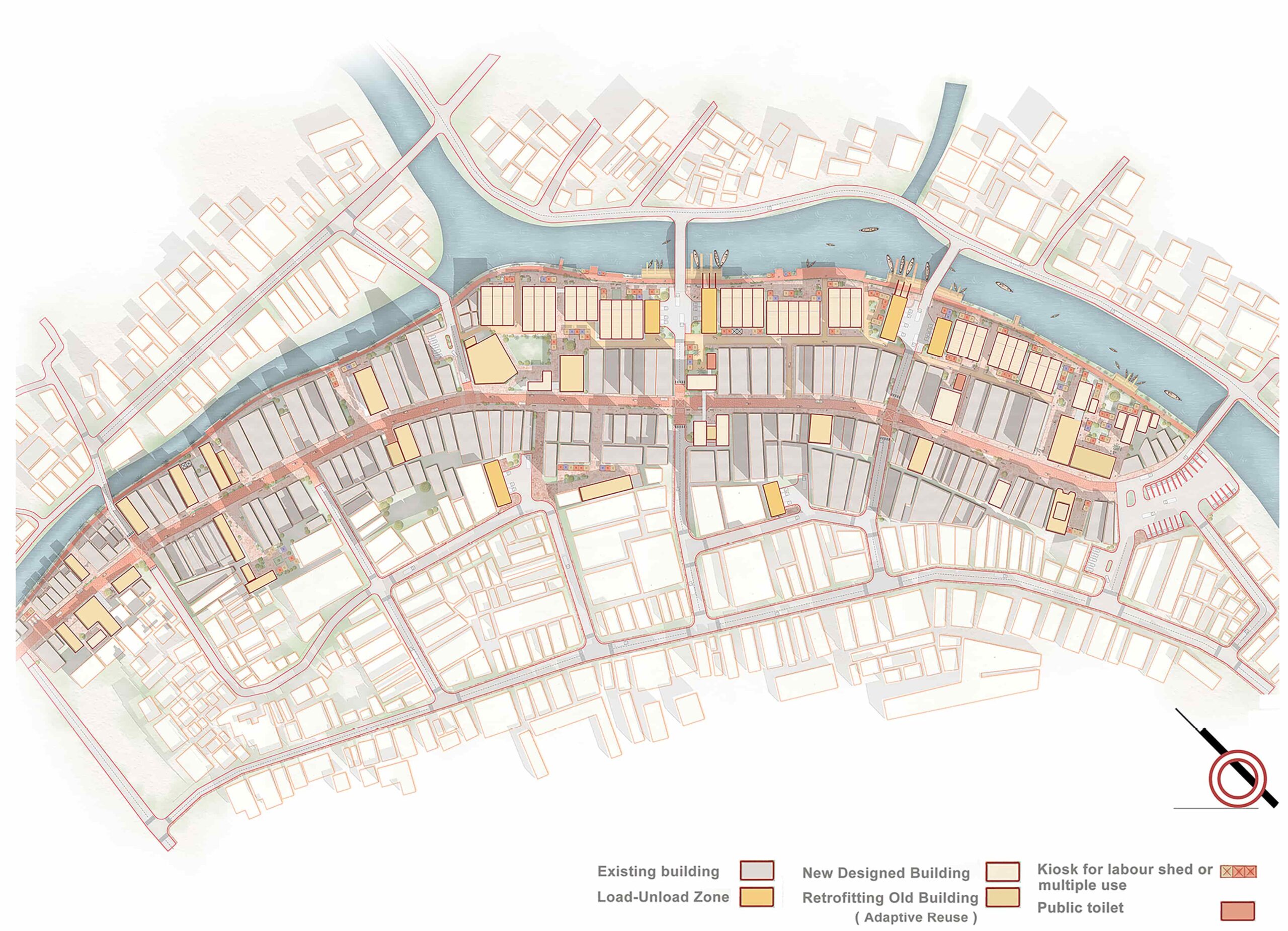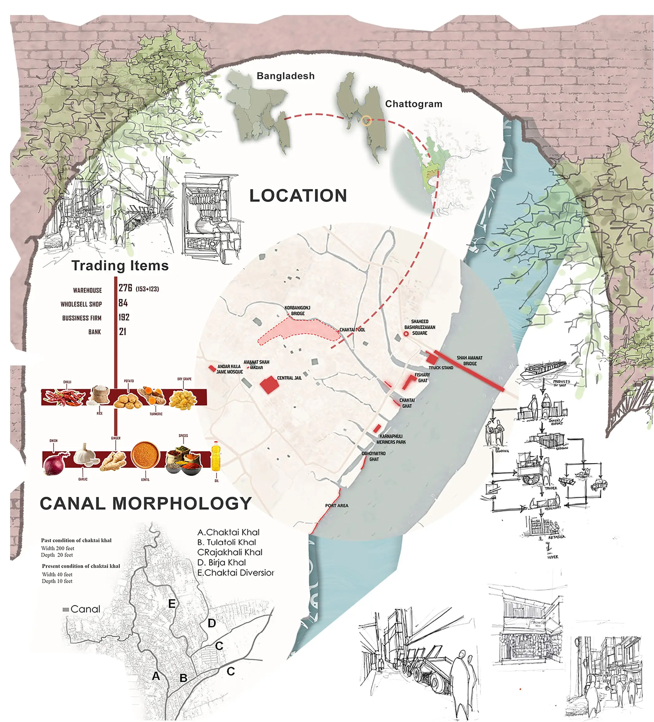 The market’s architecture reflects its rich history, with 18 to 20 structures from the 1700s to 1900s, initially designed for businesses and luxurious residences. These have deteriorated, necessitating adaptive reuse. Revitalizing Khatunganj involves addressing social, cultural, economic, and environmental aspects. Proposals include converting old streets into pedestrian-friendly areas, creating sheds for efficient loading/unloading, establishing water transport points, and developing facilities to support boat traffic and recreational boating.