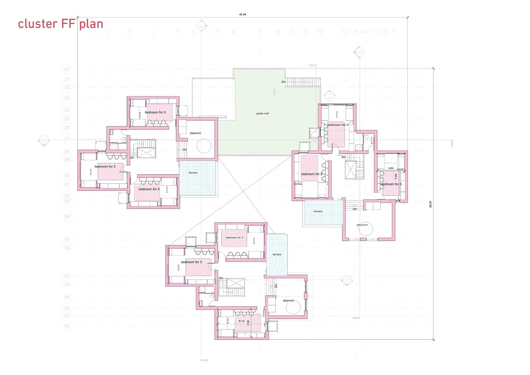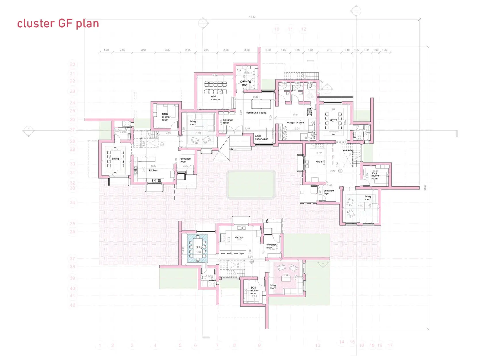 Each cluster contains three houses and a shared social interaction space, where children can freely play and engage in activities. Each house accommodates nine children and one S.O.S mother to look for them (she plays a pivotal role in the children’s life, serving as a substitute for their real parents.), with four bedrooms—three for the children and one for the S.O.S mother.