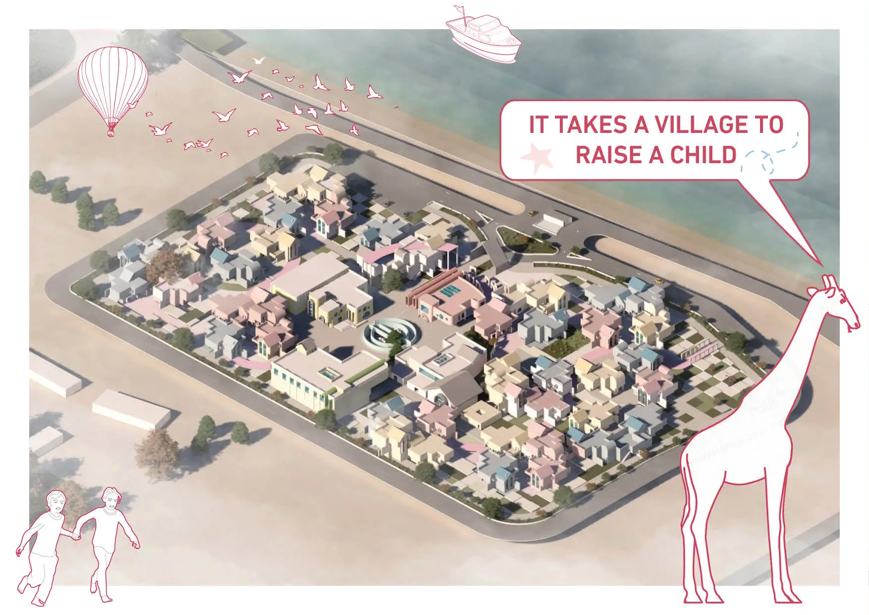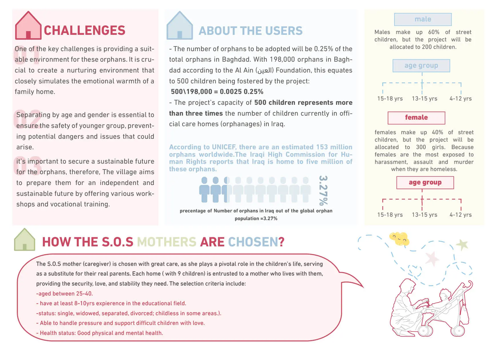 To convey the concept, the approach was to work *with* children, not just *for* them. The main idea, “DESIGNING THROUGH THE EYES OF CHILDREN,” is reflected in clusters designed to resemble a child’s drawing, with playful forms and vibrant colors. This design creates an environment that feels like living inside a child’s imagination, fostering creativity and imagination. However, it also introduces structure and order through a grid and modular approach, ensuring it remains practical and not overly whimsical, especially for older orphans. All while maintaining human scale and designing it to best suite the children’s age groups.