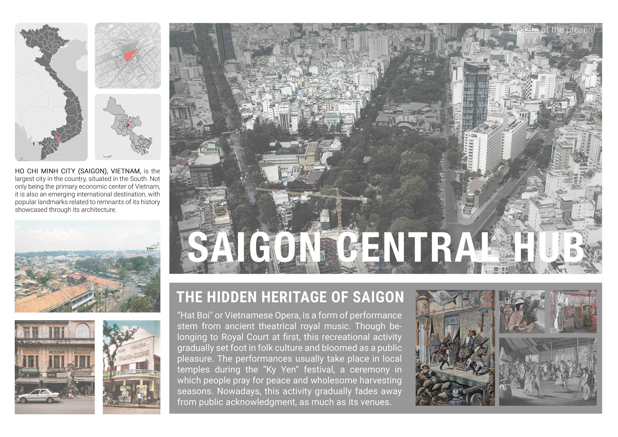 Many projects around the world, such as the Elbphilharmonie, or the Hearst Tower, embrace existing architecture as a part of the new construction. My graduation project tackles a particularly challenging yet promising location. The site consists of a 100-year-old temple, which enshrines the deity of Tan Khai Village, the oldest area in Saigon. Sadly, the place once being the heart of the community, the spiritual home of many traditional music performers, is now totally covered by chaotic blocks of shophouses and billboards.