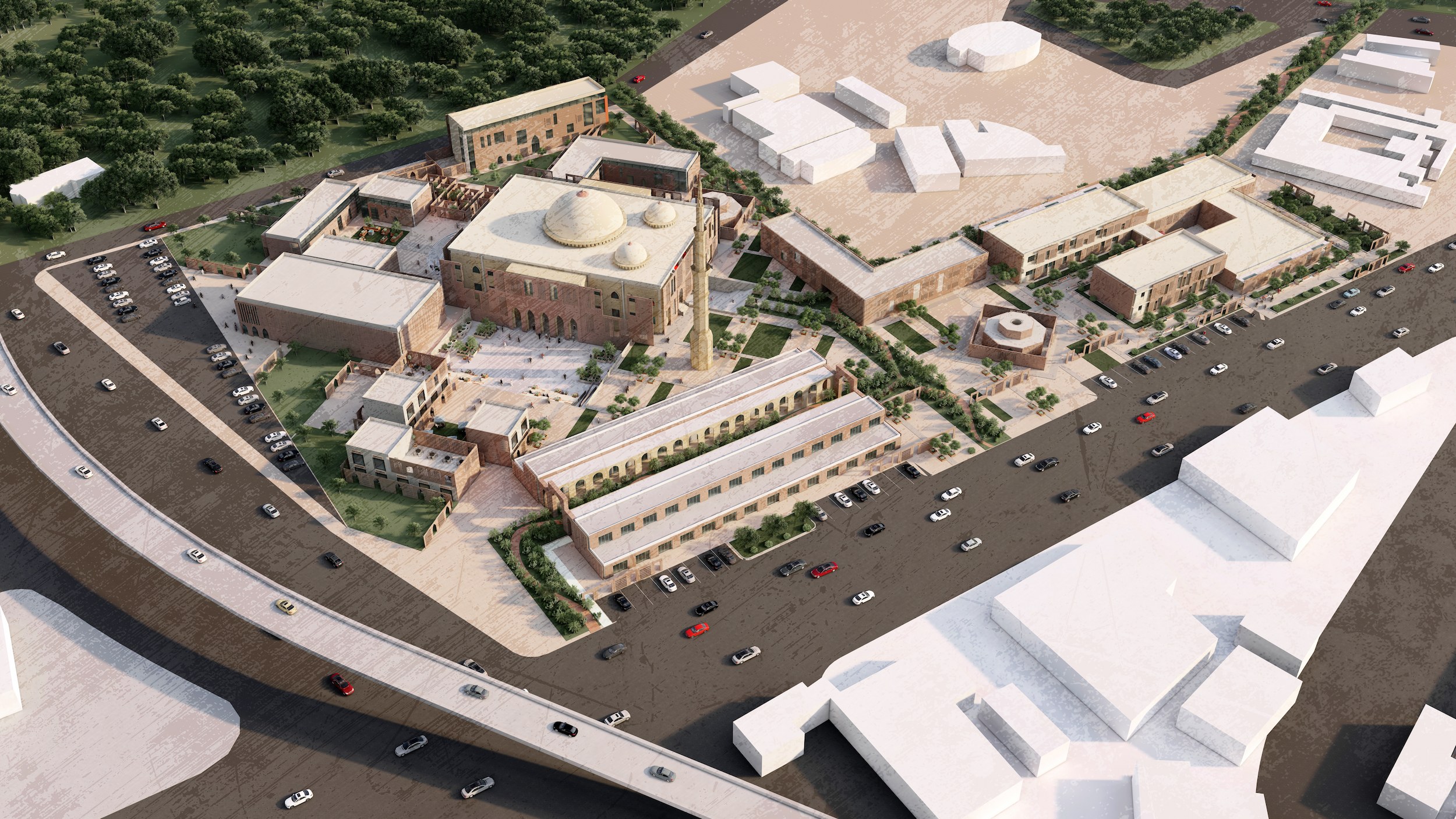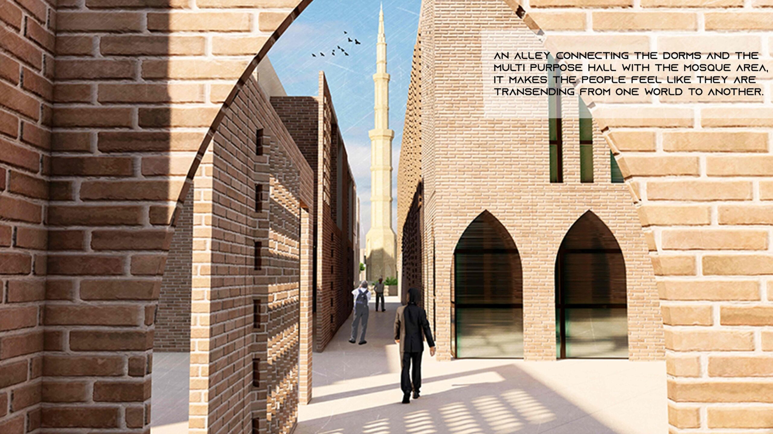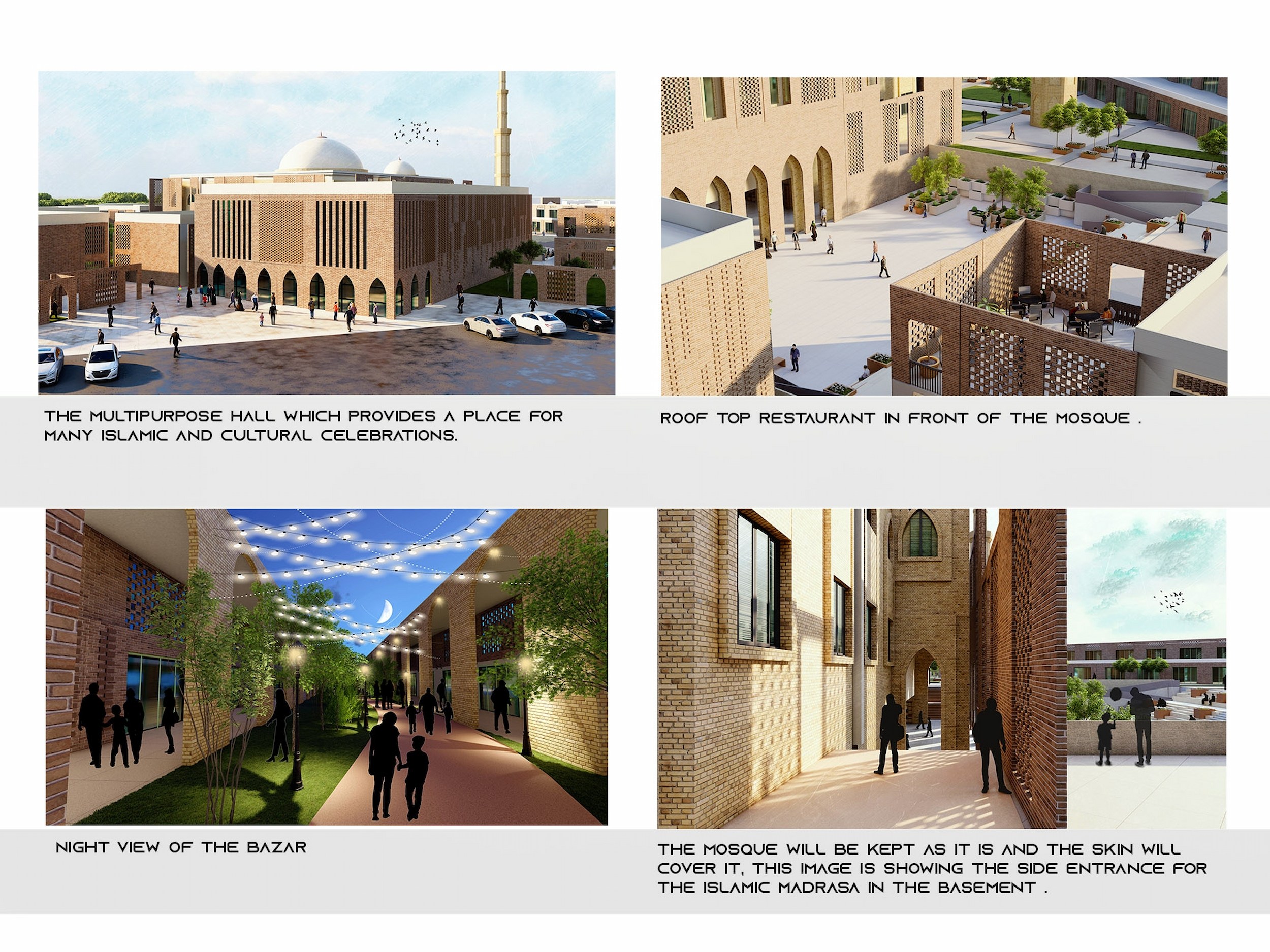 The mosque is the focal point of the project, it is covered with yellow brick the authentic style and the design of the mosque will be kept as it is, and there will be brown brick skin with a traditional brick pattern will be used to cover the mosque and in some places, there will be openings to show the material and the style of the mosque, this skin will cover most of the parts of the project and it will unify the style and the material for the project, this skin will also create a spiritual effect on the interior of the mosque and the other building without touching the interior.