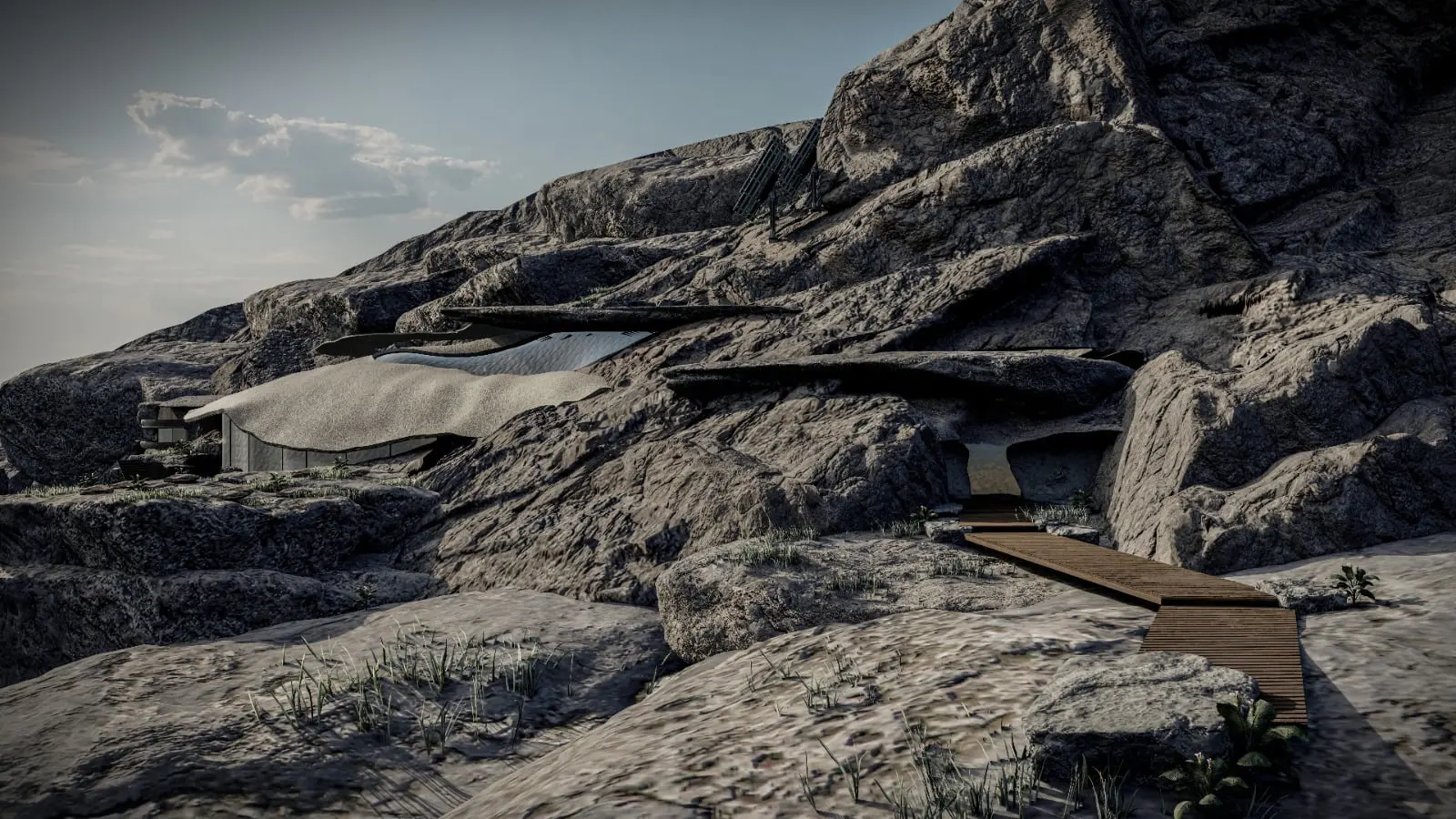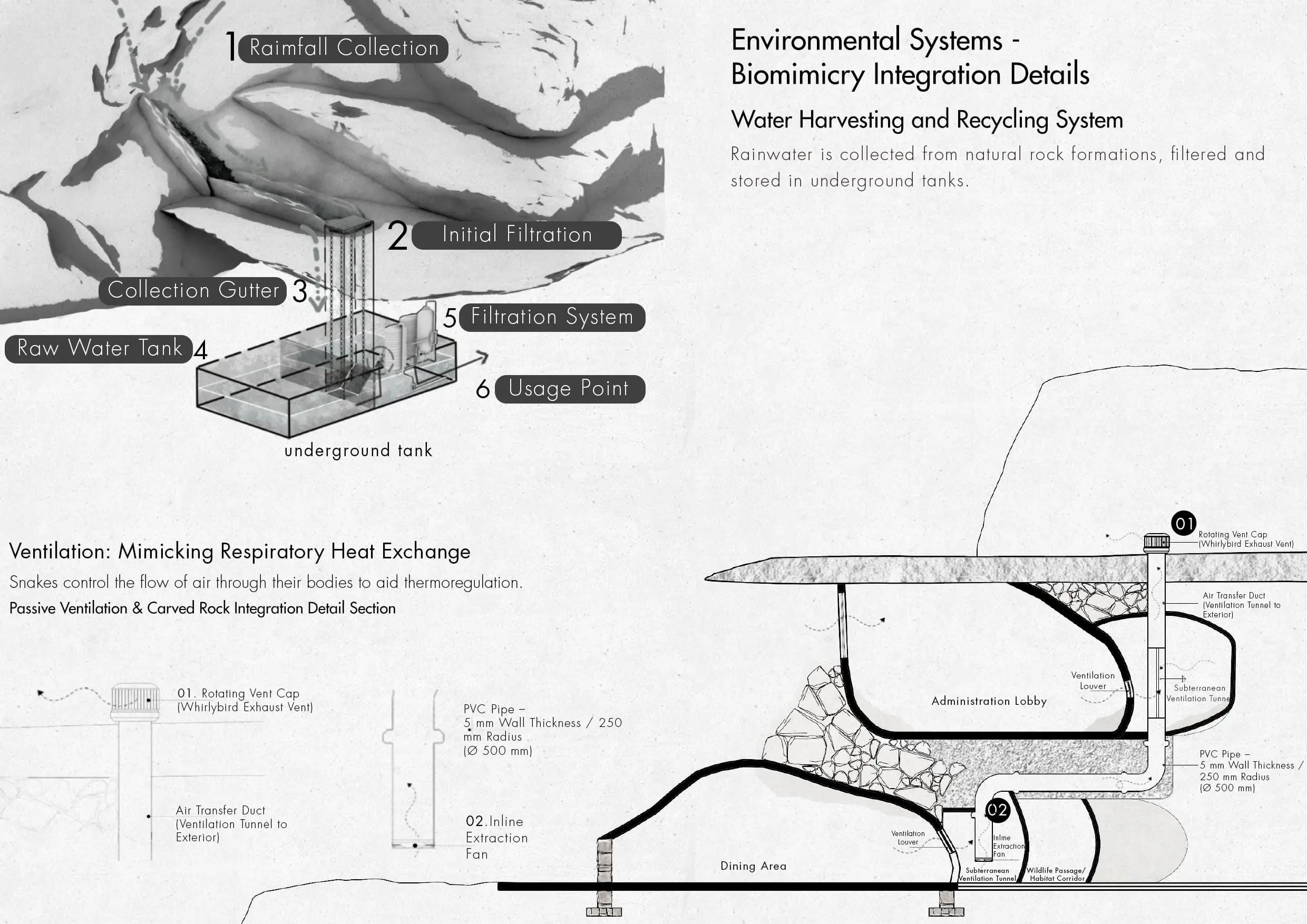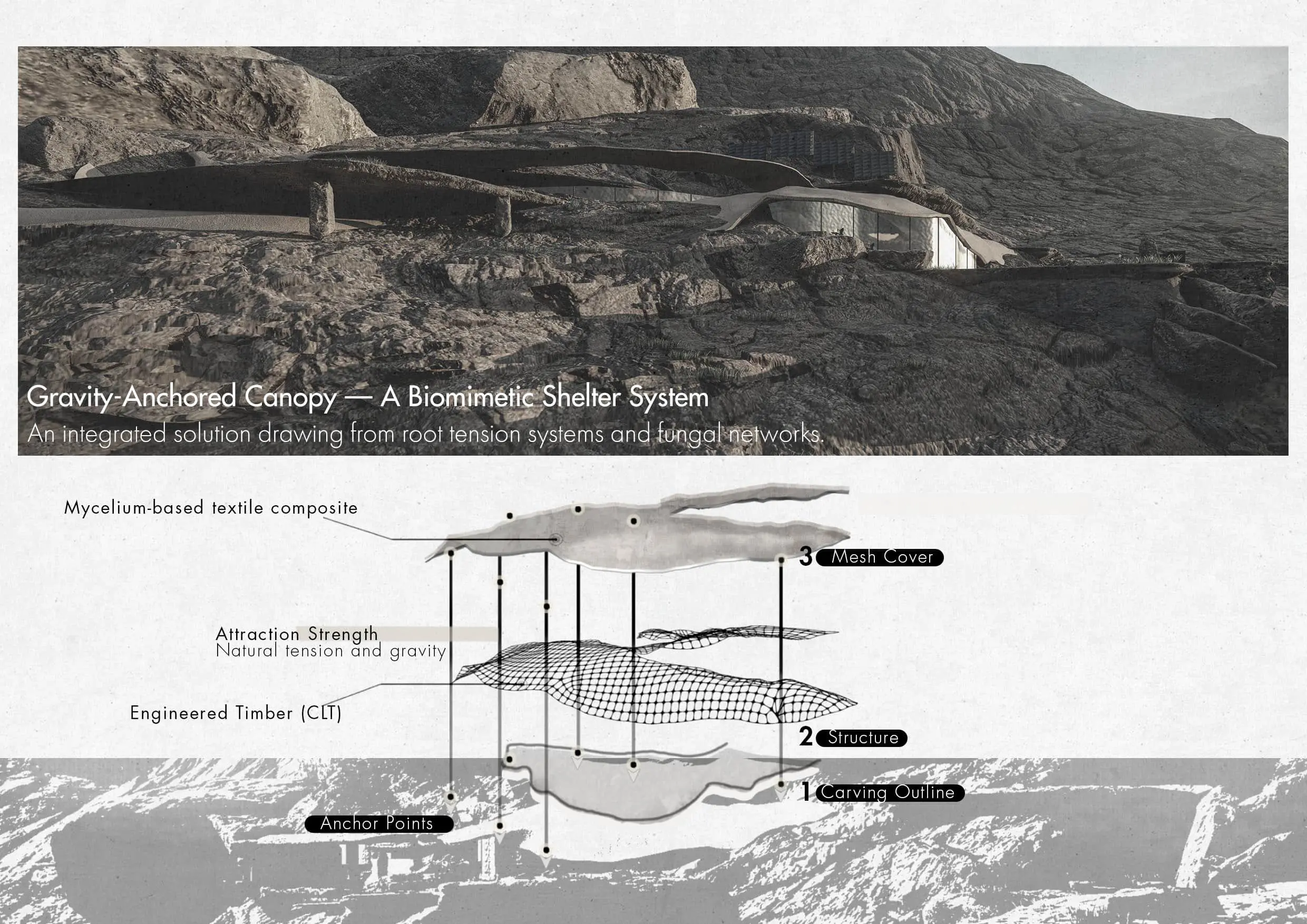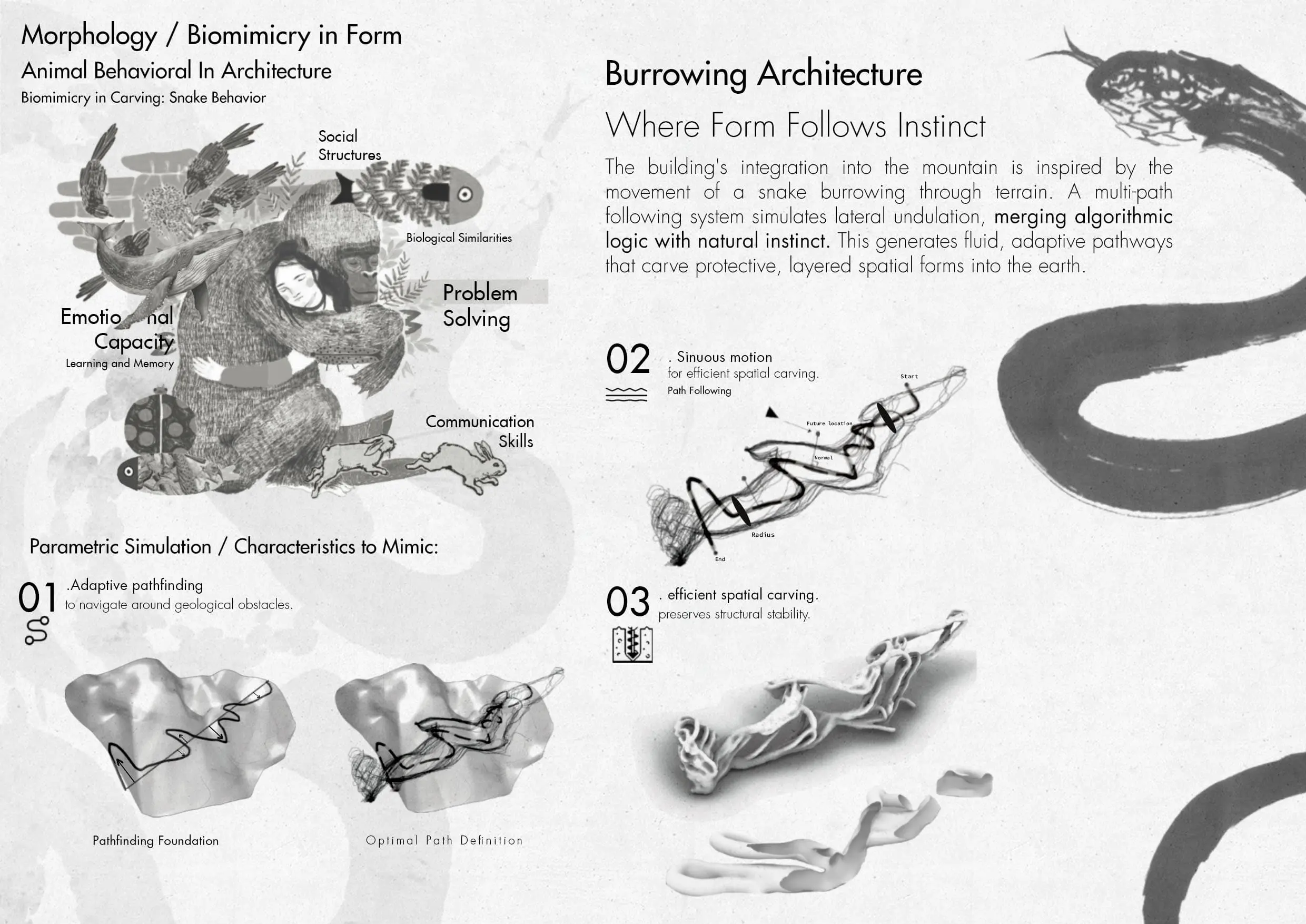 Rooted in biomimicry and environmental responsiveness, the design draws inspiration from animal behaviours observed in natural habitats. Snake burrowing techniques inform the hidden subterranean entrance, creating a sense of protection and grounding at the beginning of the journey, while bird flight patterns shape circulation, guiding users through fluid and intuitive movement across the site. Hanging paths and carved passages merge seamlessly with the mountain’s geology, allowing architecture to emerge gradually from the landscape rather than dominate it.