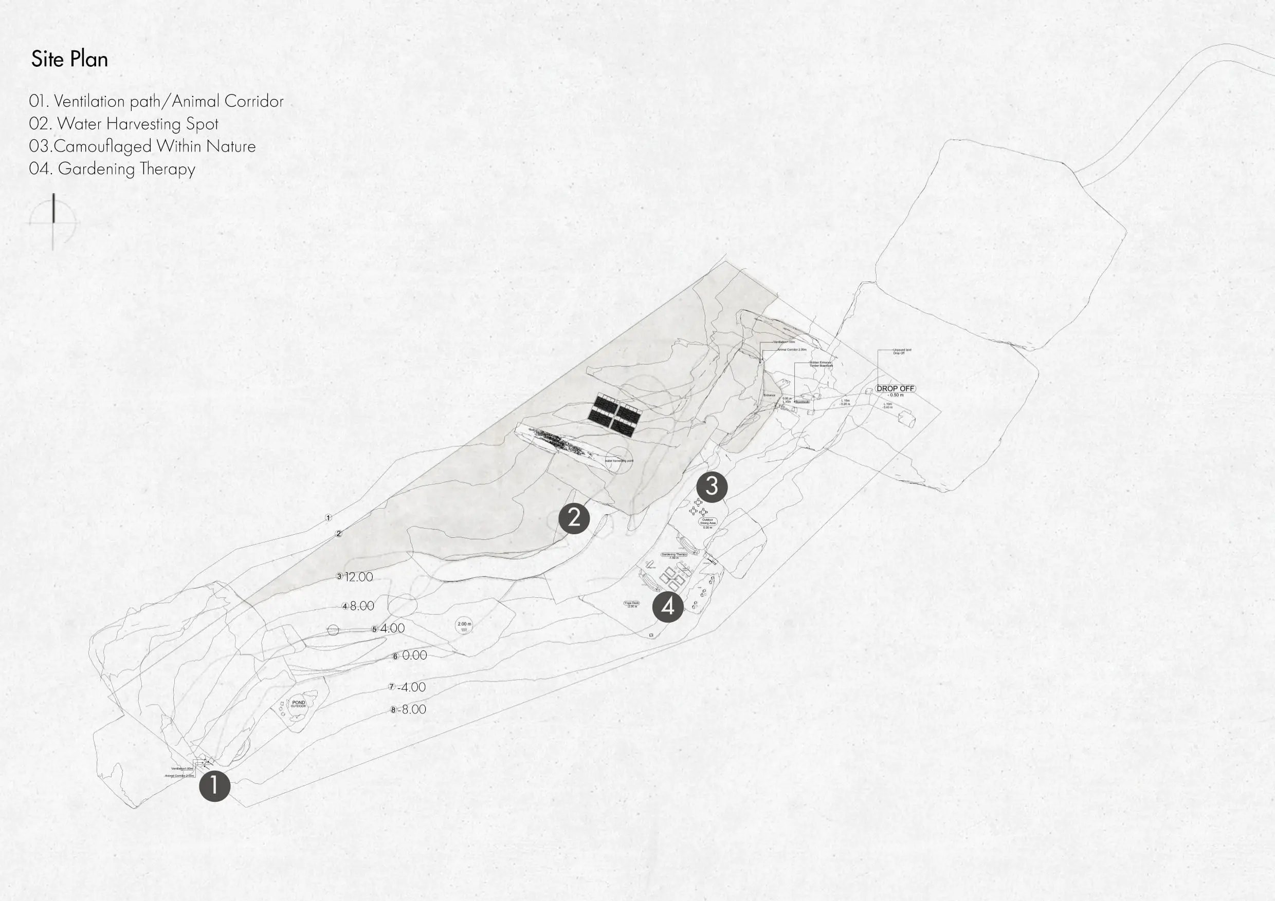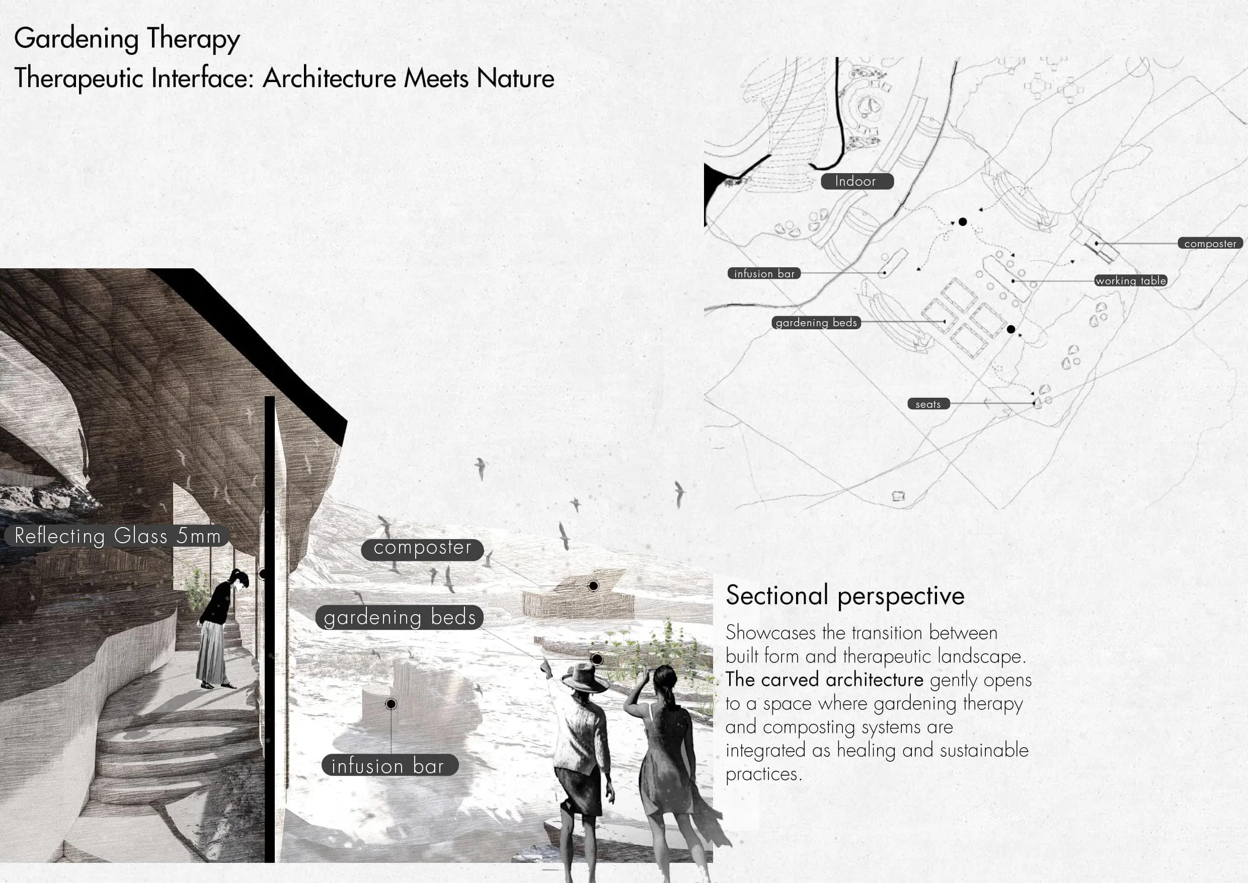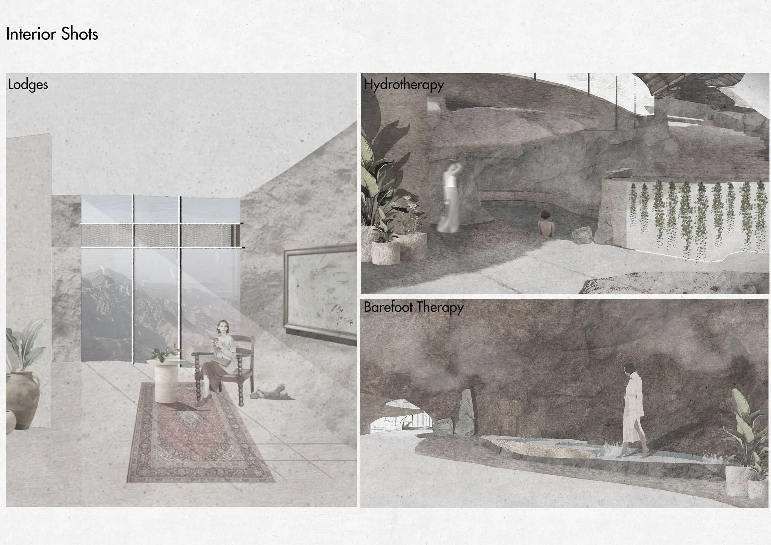 An ecotherapy retreat carved into a Jordanian mountain, designed as a gradual journey from enclosure to openness. Guided by biomimicry and landscape integration, the project uses spatial contrast, light, and movement to promote healing, sensory reconnection, and environmental awareness.