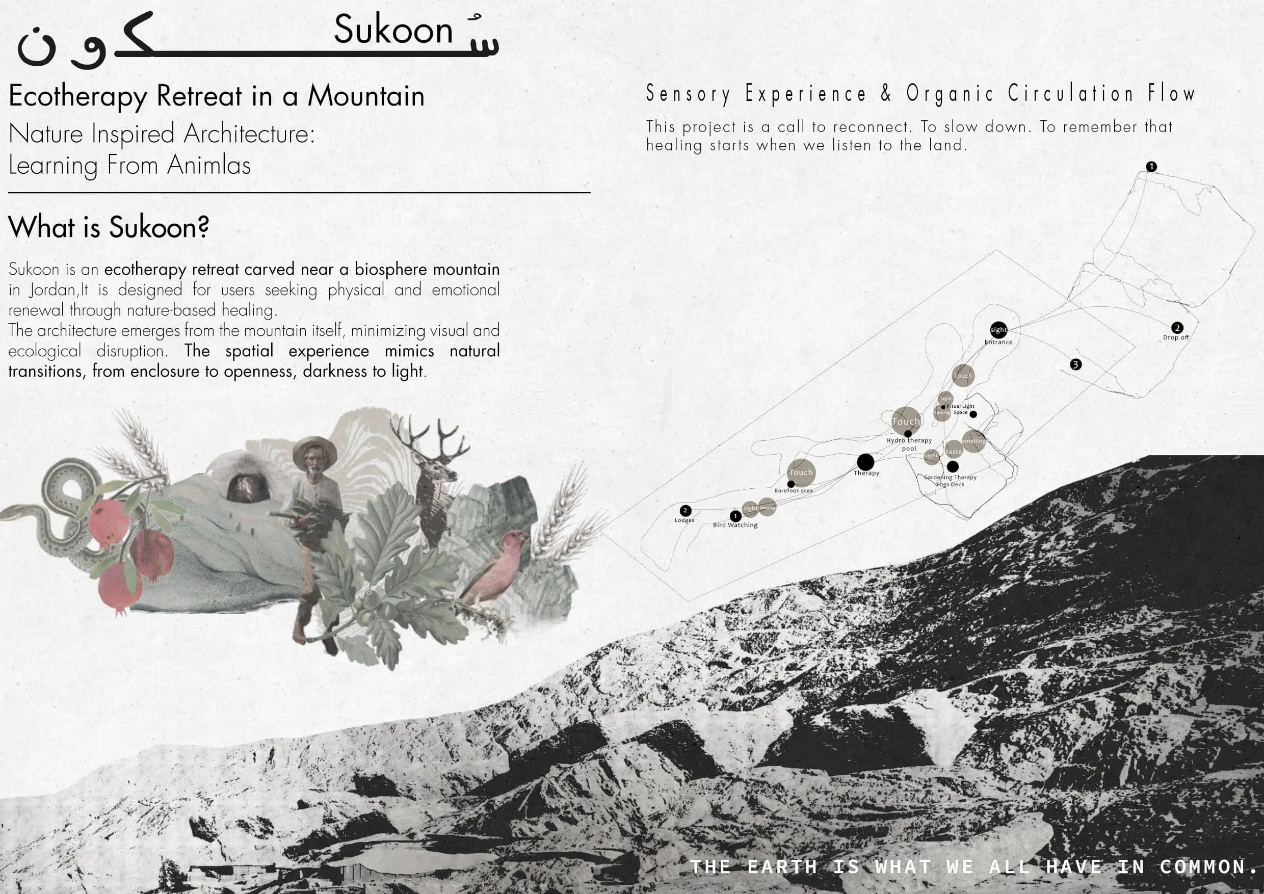 Sukoon, meaning serenity, explores architecture as a medium of healing through a retreat carved into a Jordanian mountain near a protected biosphere reserve. The project reimagines the human–nature relationship as a spatial journey of emotional transition, moving from dark, enclosed spaces toward open, light-filled experiences that foster renewal, reflection, and sensory reconnection.