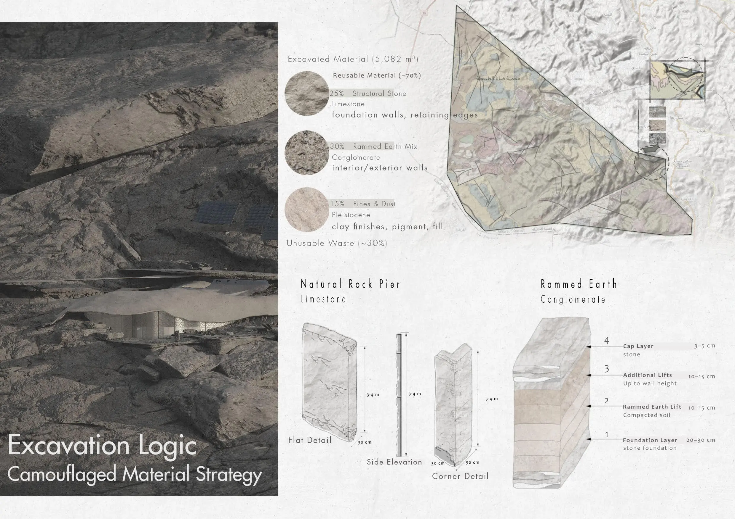 Constructed using 3D-formed rammed earth and locally sourced stone, the project minimizes ecological disruption while reinforcing a tactile, grounded architectural language. Passive environmental strategies, natural ventilation, and sustainable material use support both human well-being and long-term ecological preservation, positioning Sukoon as a model for healing architecture rooted in landscape, behaviour, and place.