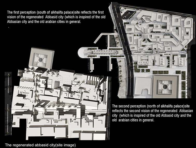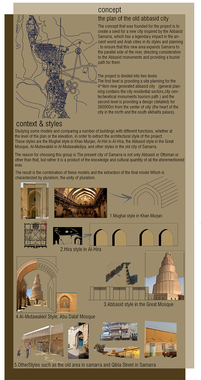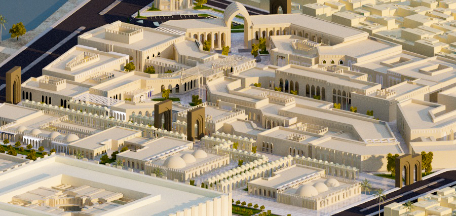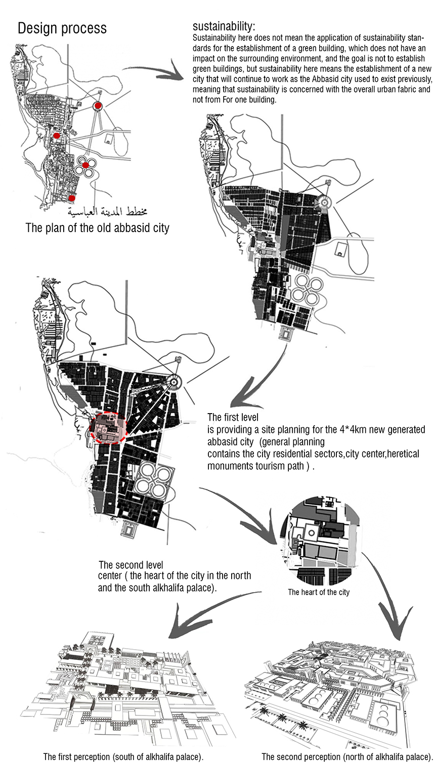 The project is divided into two levels The first level is providing a site planning for the 4*4km new generated Abbasid city (general planning contains the city residential sectors, city centre, heretical monuments tourism path ) and the second level is providing a design (detailed) for 360000m from the centre of the city (the heart of the city in the north and the south al khalifa palace).