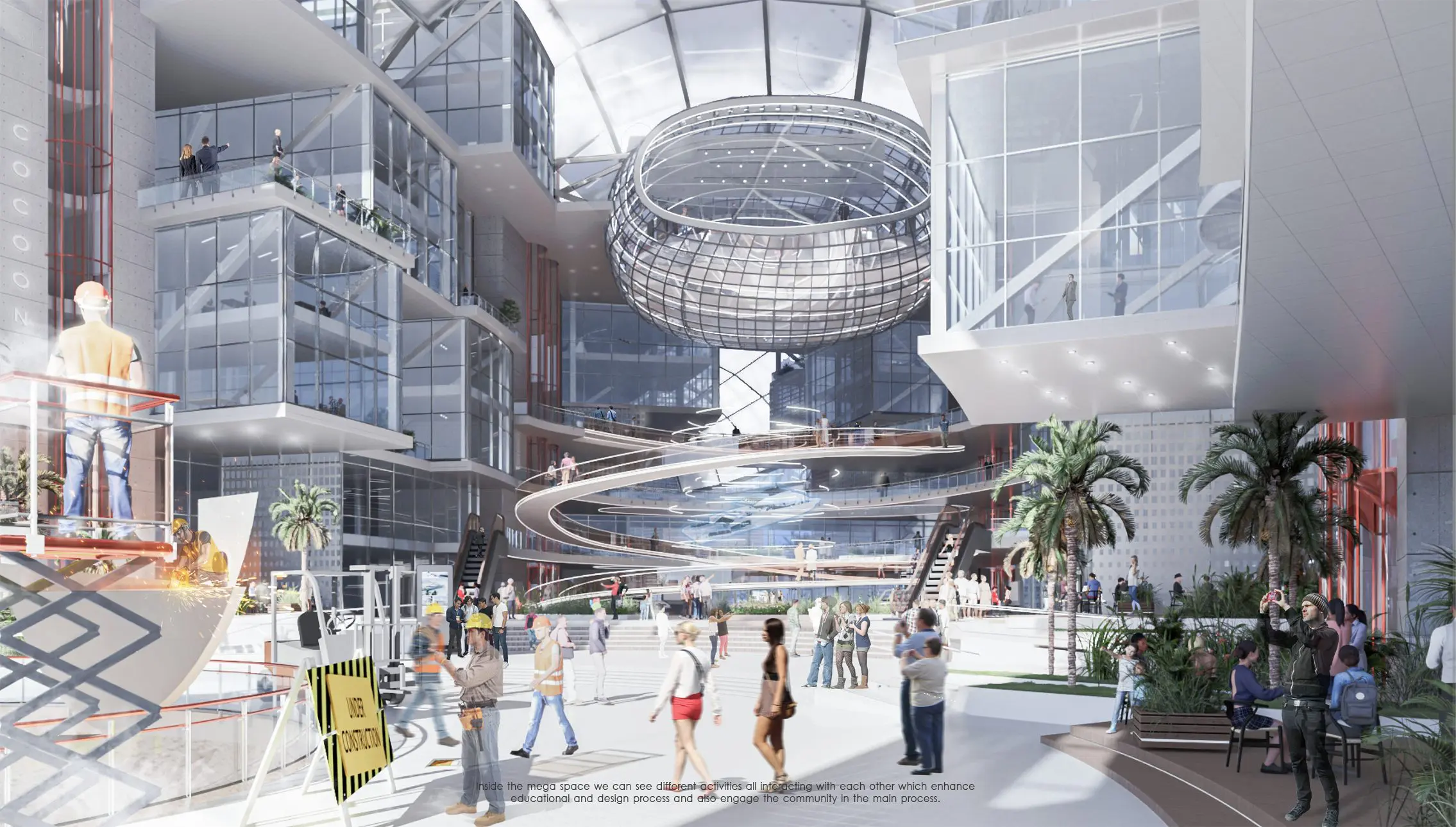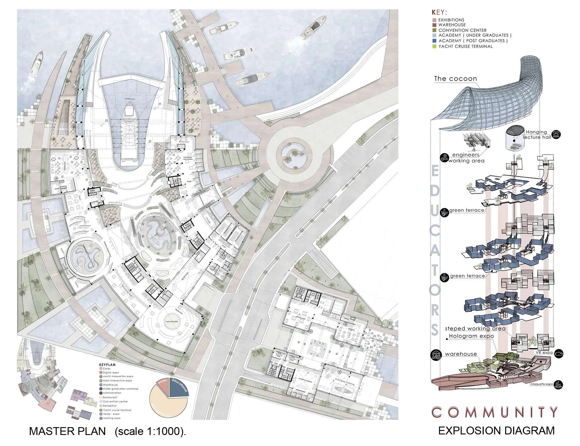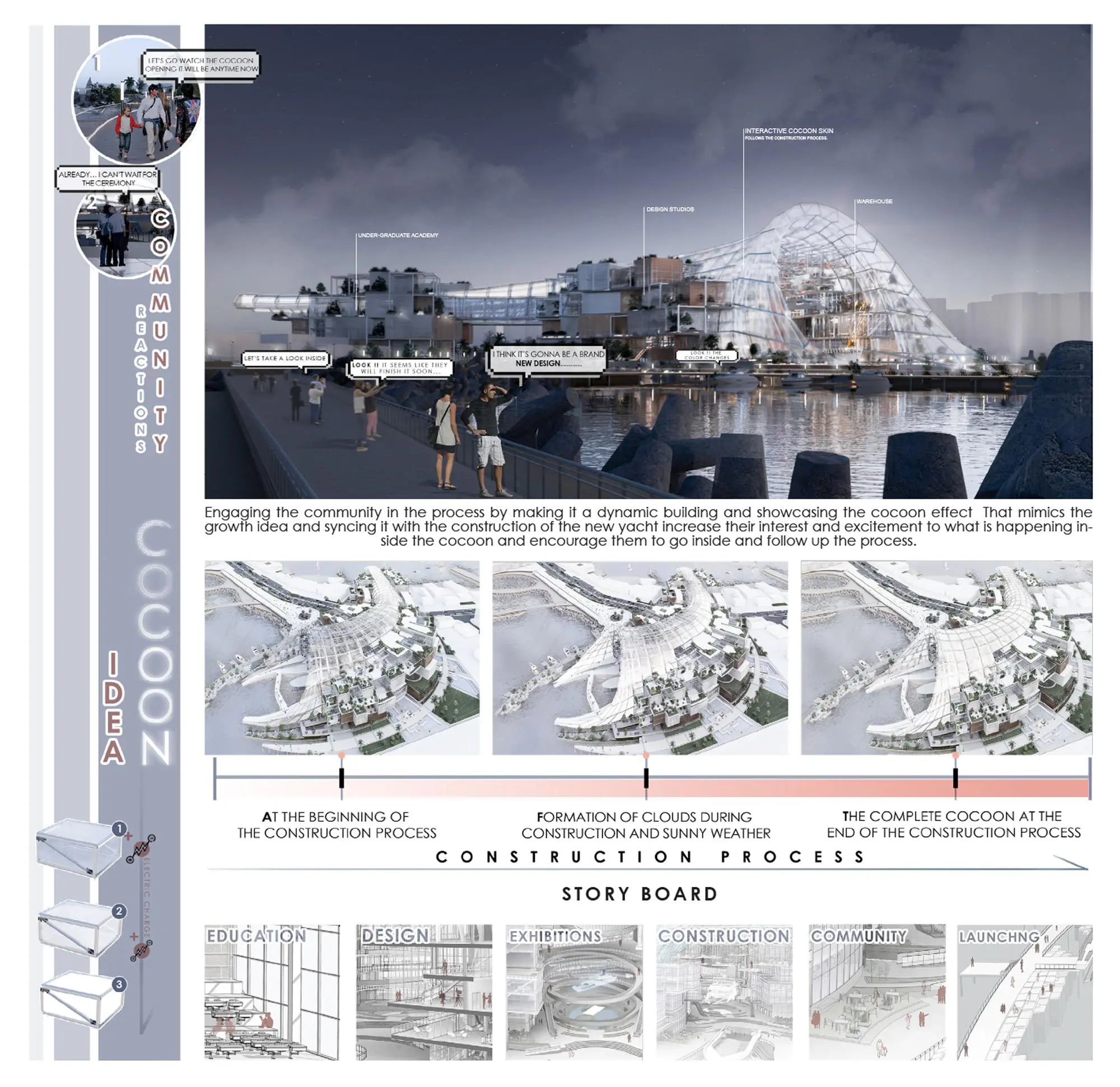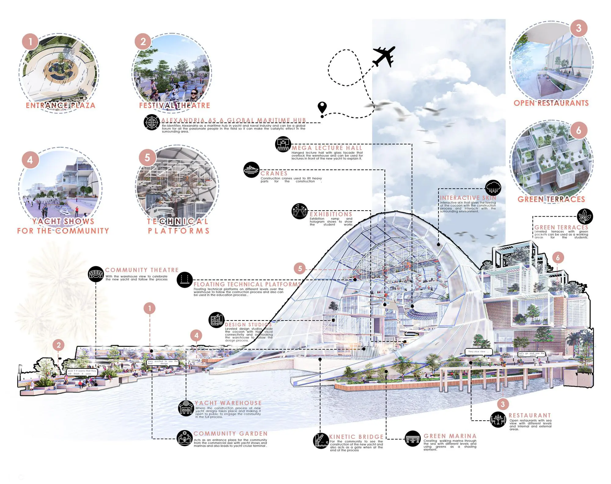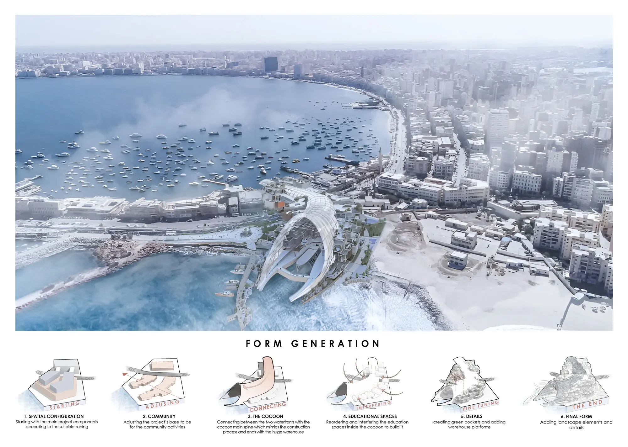 And here it comes, “THE COCOON. “Introducing a new way of thinking in this field, from civilized industrial function to dynamic artistic and avant-garde realm. The project involves the whole process from education, design, and engaging the community in recreational spaces while seeing the manufacturing process so it can revive the rich maritime heritage of Alexandria.