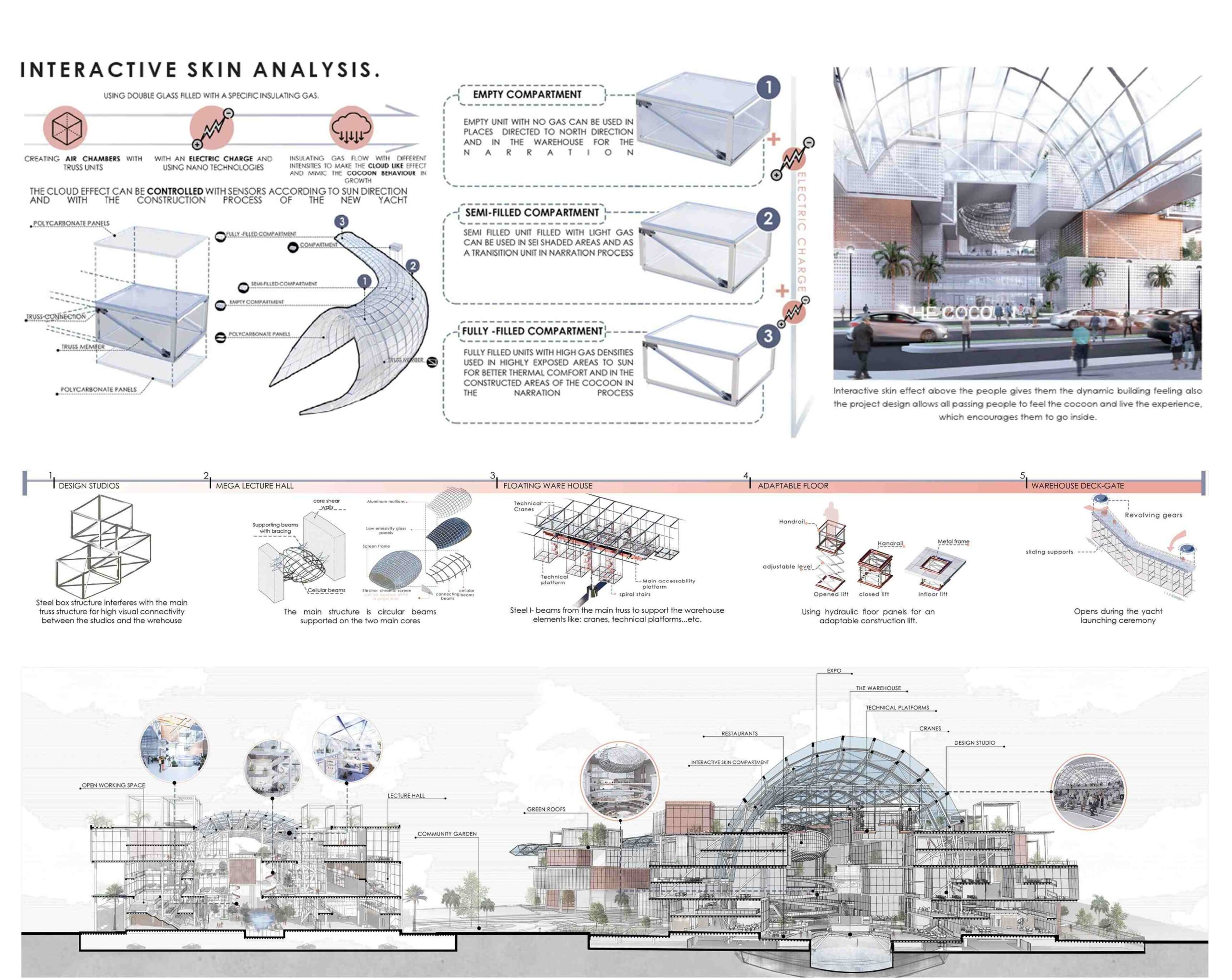 The project focuses on narrative architecture, through an immersive user experience inside the mega space -the cocoon- with its interactive skin which mimics the cocoon behaviour of growth as it varies with the construction process from the very beginning until the final product