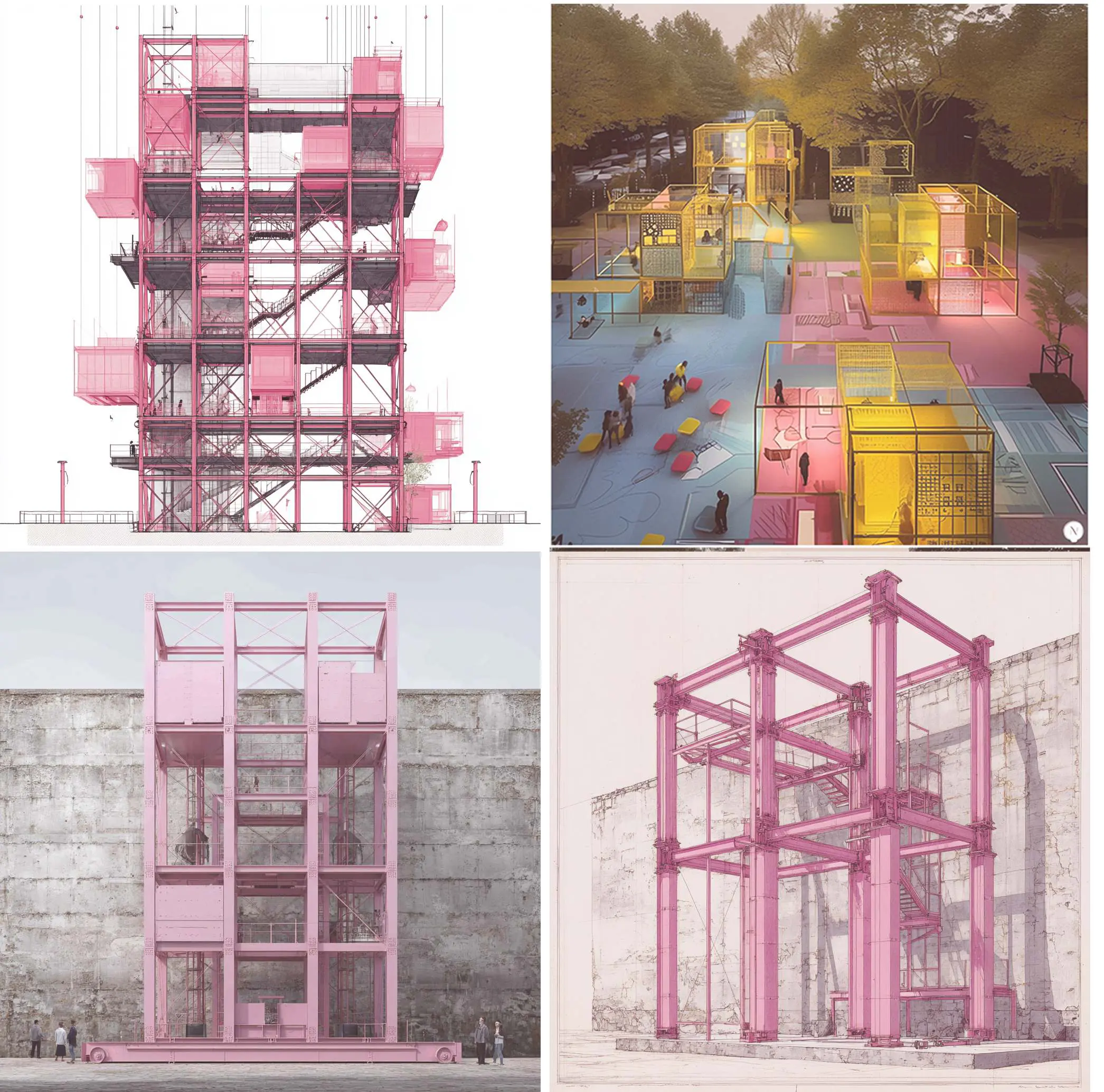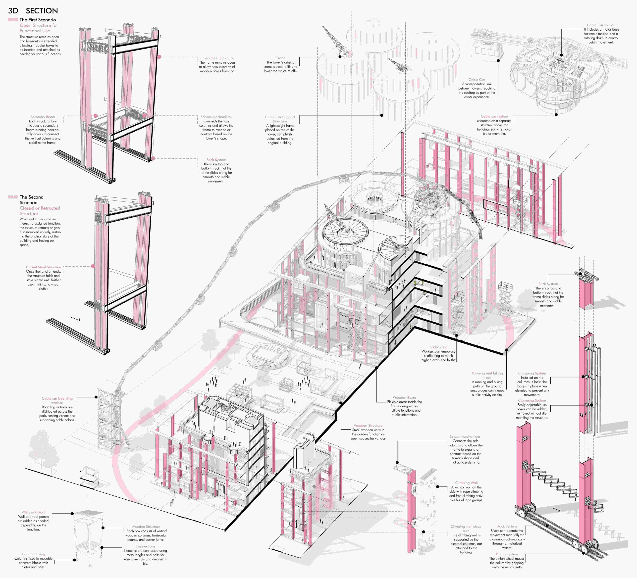 The intervention is based on a flexible, modular steel framework that wraps around the towers like a curtain capable of opening, closing, and reconfiguring according to changing needs. This adaptable system redefines the towers as interactive, ever-changing spaces, allowing new programs to emerge without harming the historic concrete cores. Designed as a prototype, the system can be installed on any Flak Tower whether in Vienna, Berlin, or Hamburg responding to different urban contexts while maintaining a unified architectural language.