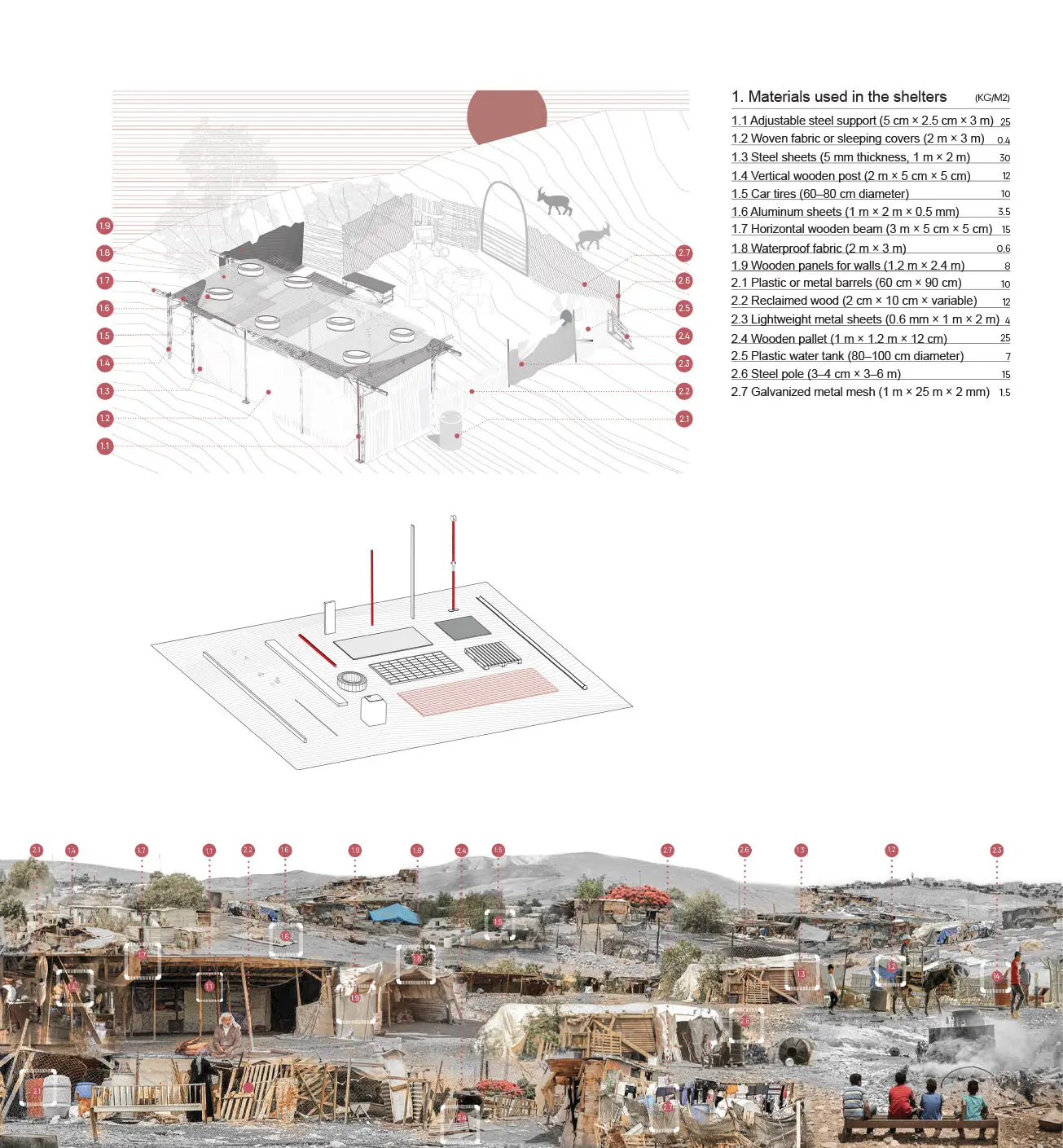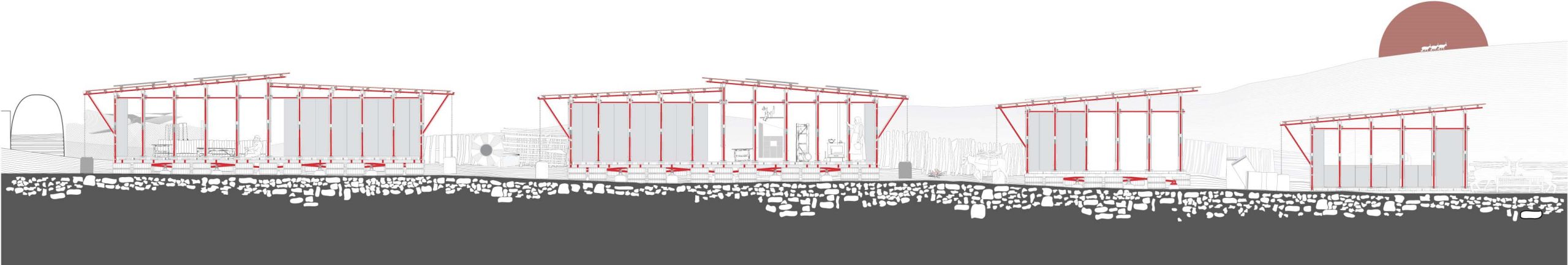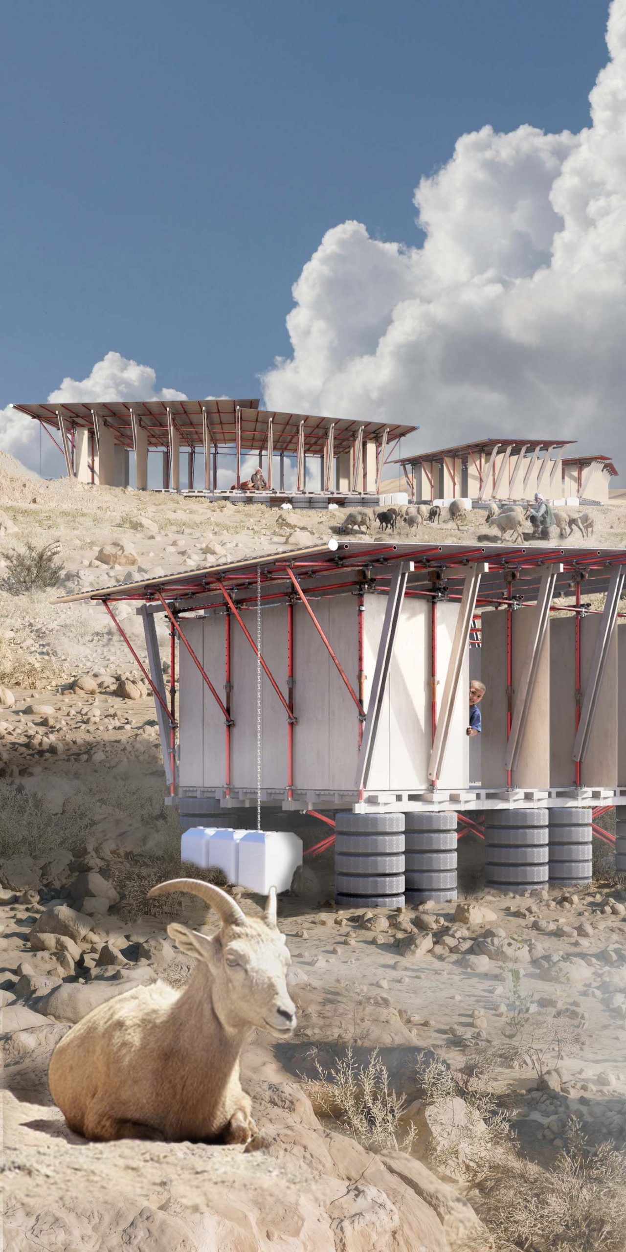 The Reclaimed Temporary’ emerges from the challenging landscape of ‘Khan al-Ahmar’, a territory marked by constant threat, scarce resources, and fragile daily life. The project is inspired by ‘Bedouin tents’, translating their flexibility, simplicity, and human-centered design into a modular, lightweight, and demountable architectural system. Each unit adapts to terrain and climate, with adjustable heights, rotatable walls, and self-sufficient systems for water collection and renewable energy, turning constraints into opportunities for innovation and resilience. The courtyards, drawn from the communal Bedouin culture, function as social hubs where private, semi-private, and open spaces merge. Their orientation and placement shift with topography and sun path, maintaining intimacy while fostering community interaction. The ‘reciprocal frame structure’ allows the units to adjust to uneven ground, reflecting the philosophy of human solidarity and adaptability. Materials used in the project echo the local context, reinforcing cultural authenticity and simplicity. Each intervention preserves the identity of the landscape while providing practical solutions for mobility, rapid assembly, and functional flexibility. The project as a whole is self-sufficient, resilient, and responsive, capable of enduring crises and adapting to diverse scenarios. Ultimately, ‘The Reclaimed Temporary’ is more than architecture, it is a living system of survival, identity, and dignity. By merging heritage, technology, and adaptability, the project offers a universal model for resilient, culturally rooted architecture that responds to conflict, displacement, and environmental challenges, providing hope and continuity to communities in precarious contexts worldwide.