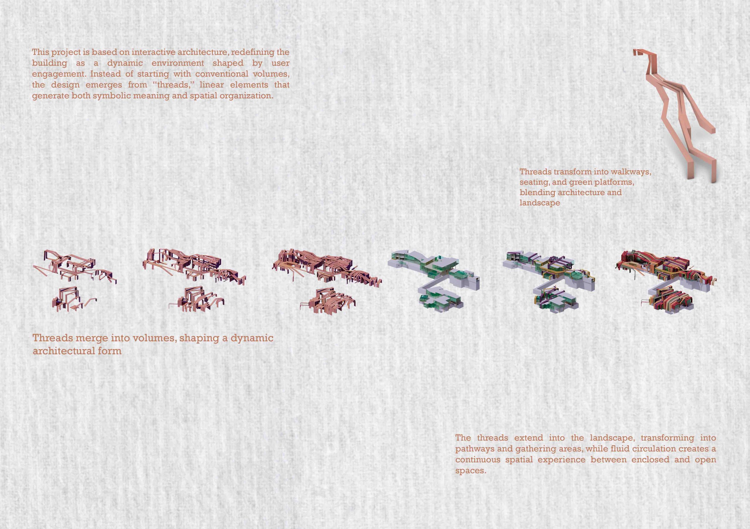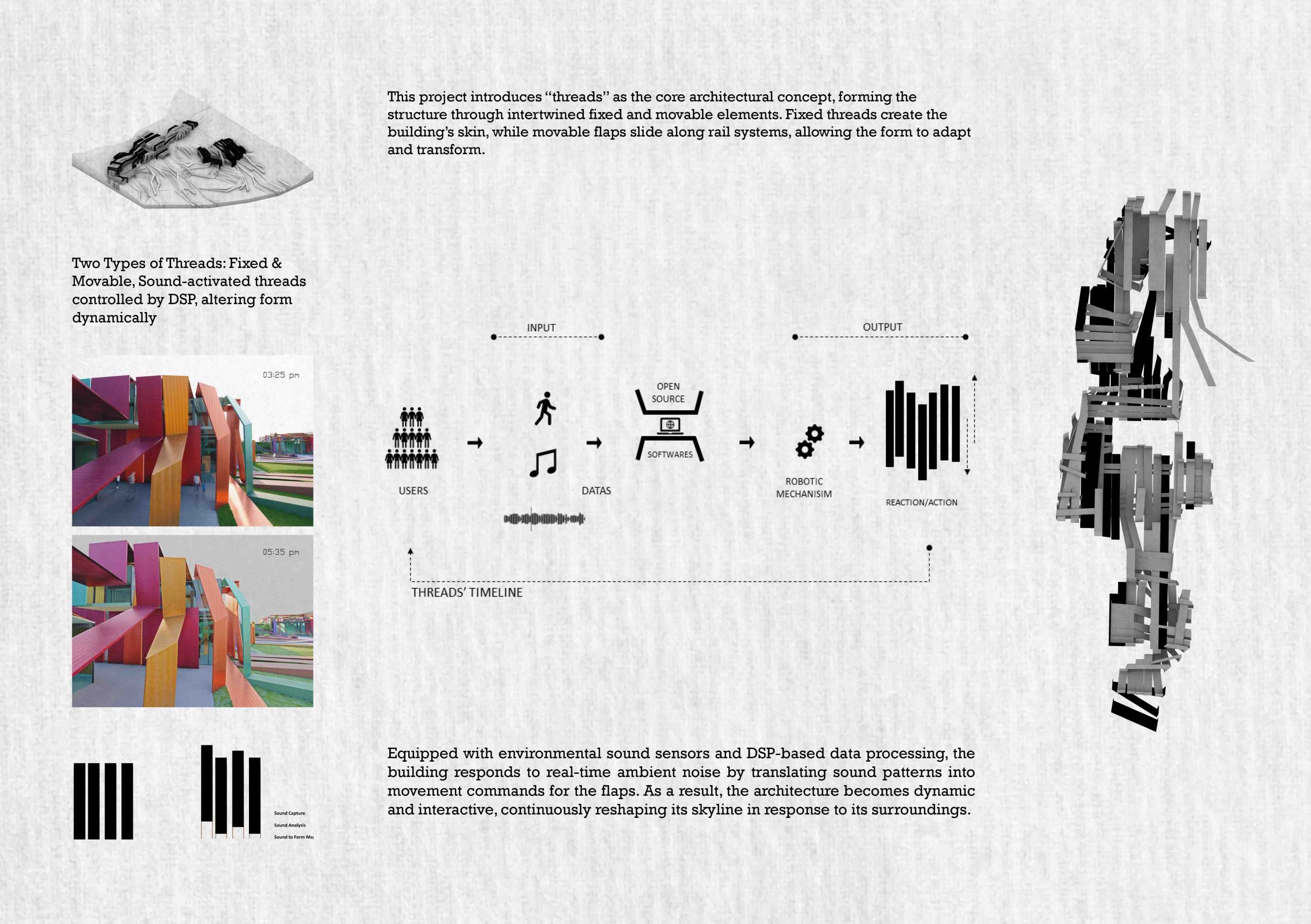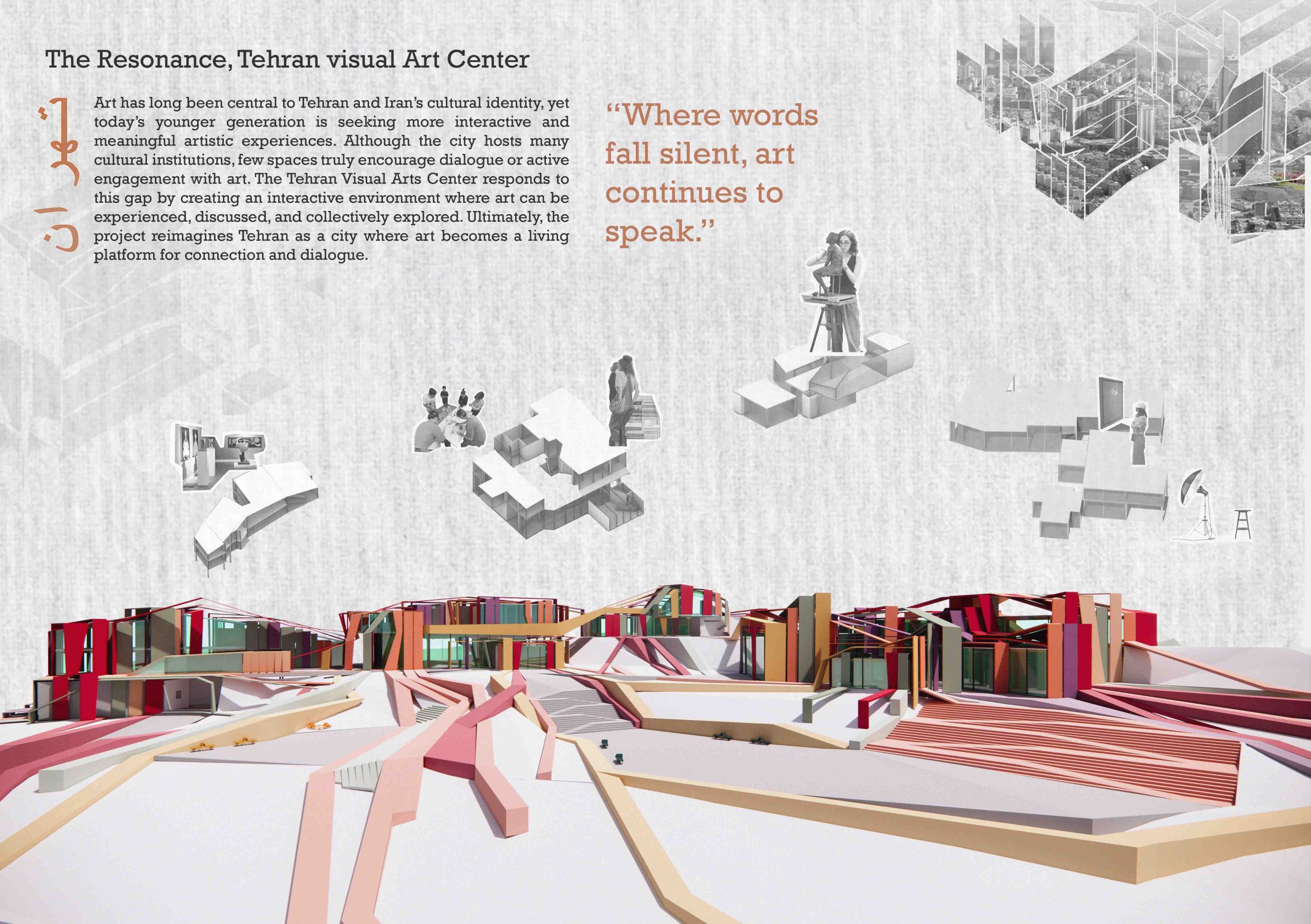 The “Resonance” project focuses on designing a Visual Arts Center in Tehran with an approach to interactive architecture a pursuit to create a space where art, humans, and the urban environment engage in a living dialogue. Since the goal was to establish a level of interaction on a larger scale, certain elements were defined in the architecture of this project, referred to as “threads.” The main structure of the project is composed of these intertwined threads, some of which move dynamically and linearly. These moving elements, or “flaps,” respond to ambient sounds, generating a dynamic rhythm, and the skyline of the project changes multiple times throughout a 24-hour cycle.