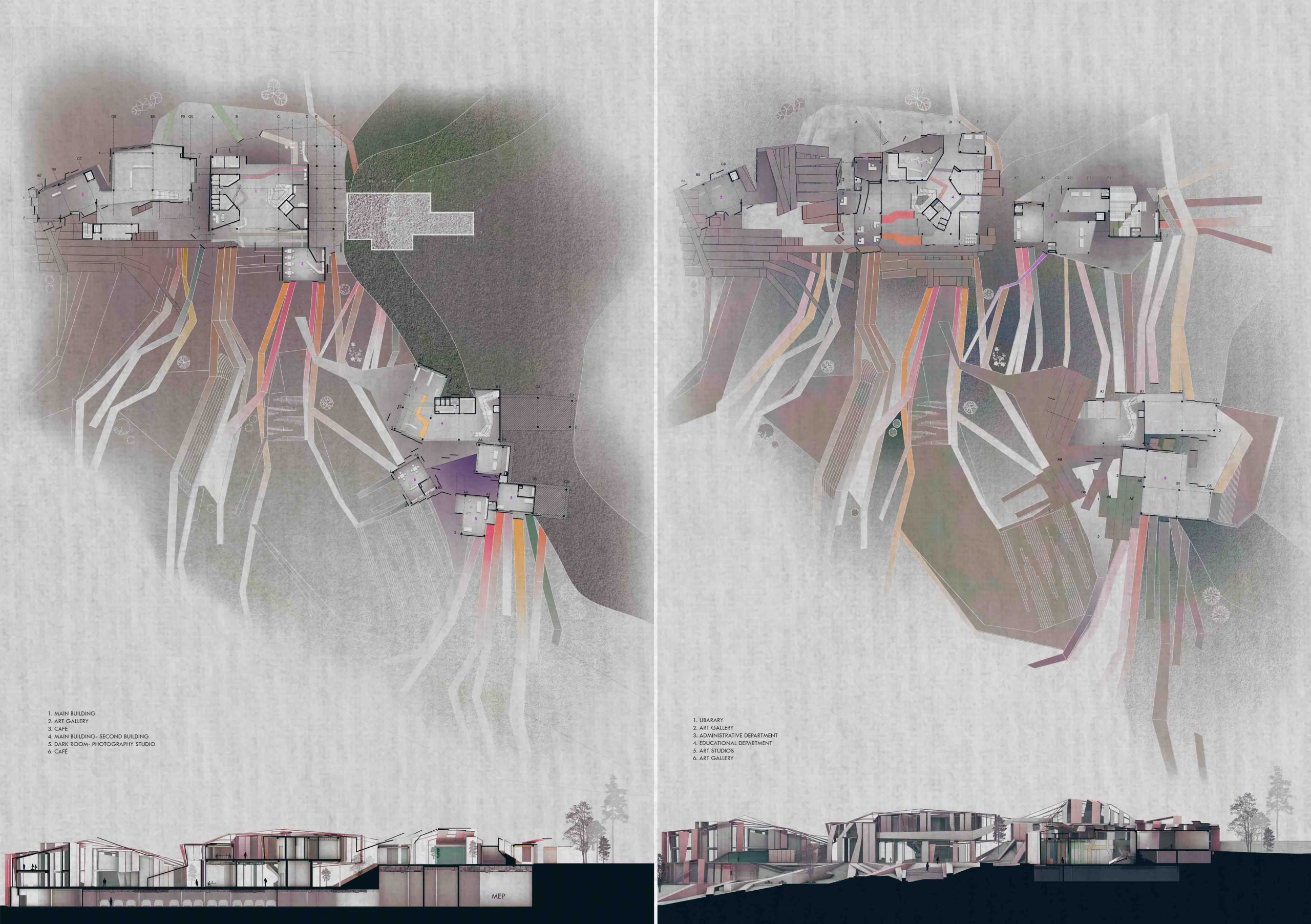 The architectural spaces are organized according to diverse artistic functions from secluded studios at the site’s elevations to open, collective spaces that intertwine with the natural topography through architectural lines. The project’s circulation paths guide users through a fluid experience of enclosed, semi-open, and open spaces, transforming architecture into a lived and evolving experience.