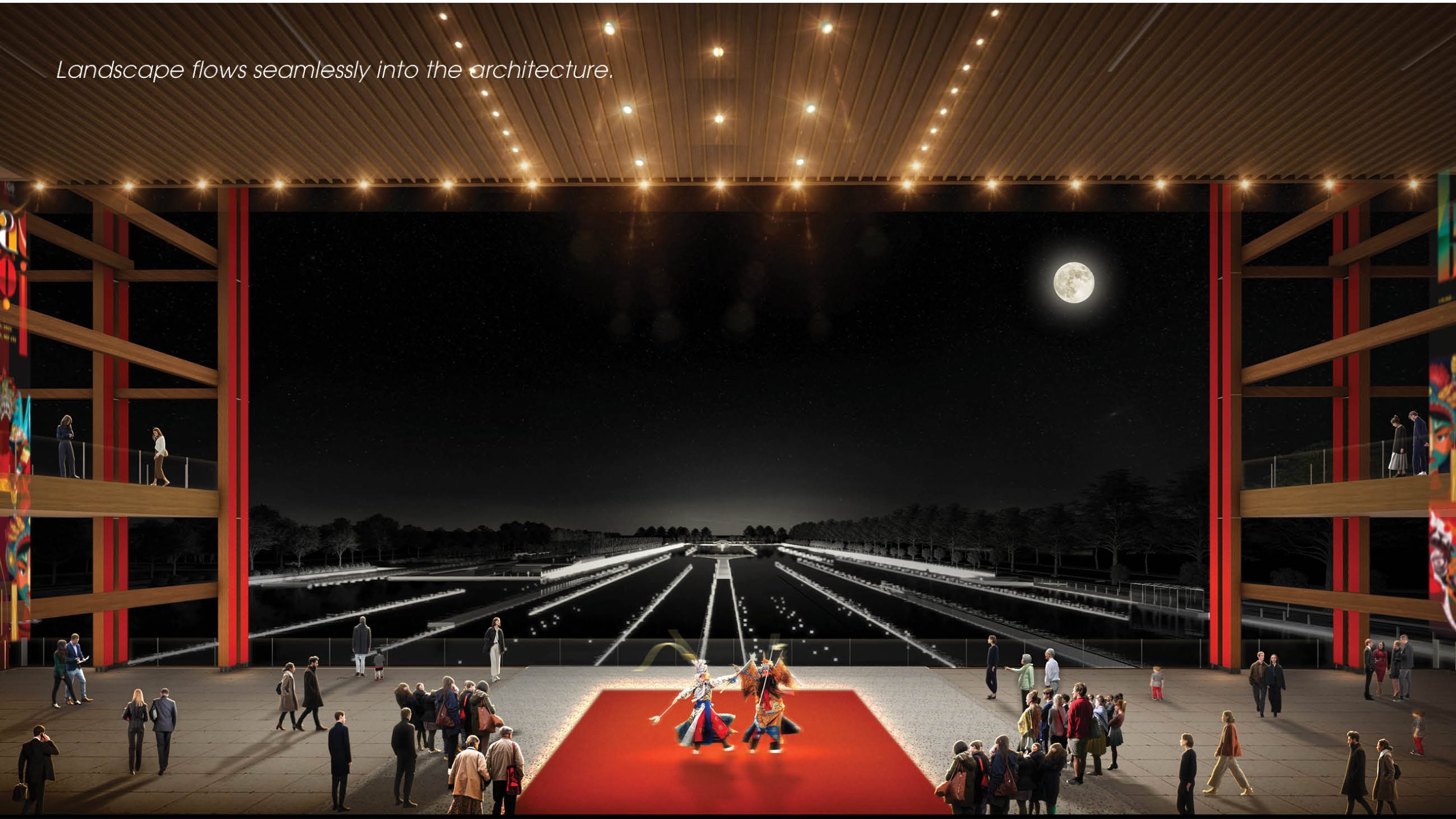 The core of the design is a floating timber frame on water, three main spaces: auditorium, exhibition, and community areas: