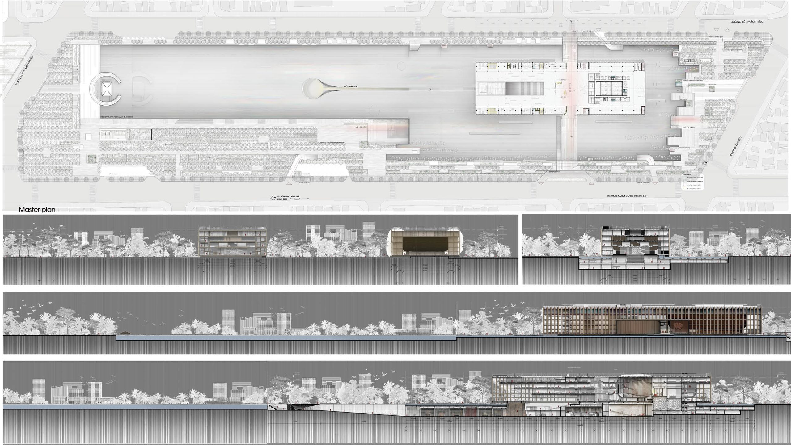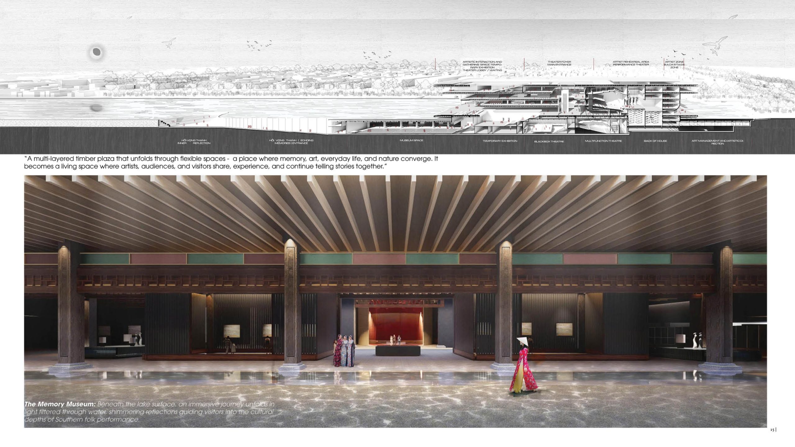 – Underground use: smaller halls and museum beneath the lake connect to the Yersin pedestrian axis, activating underground spaces.
