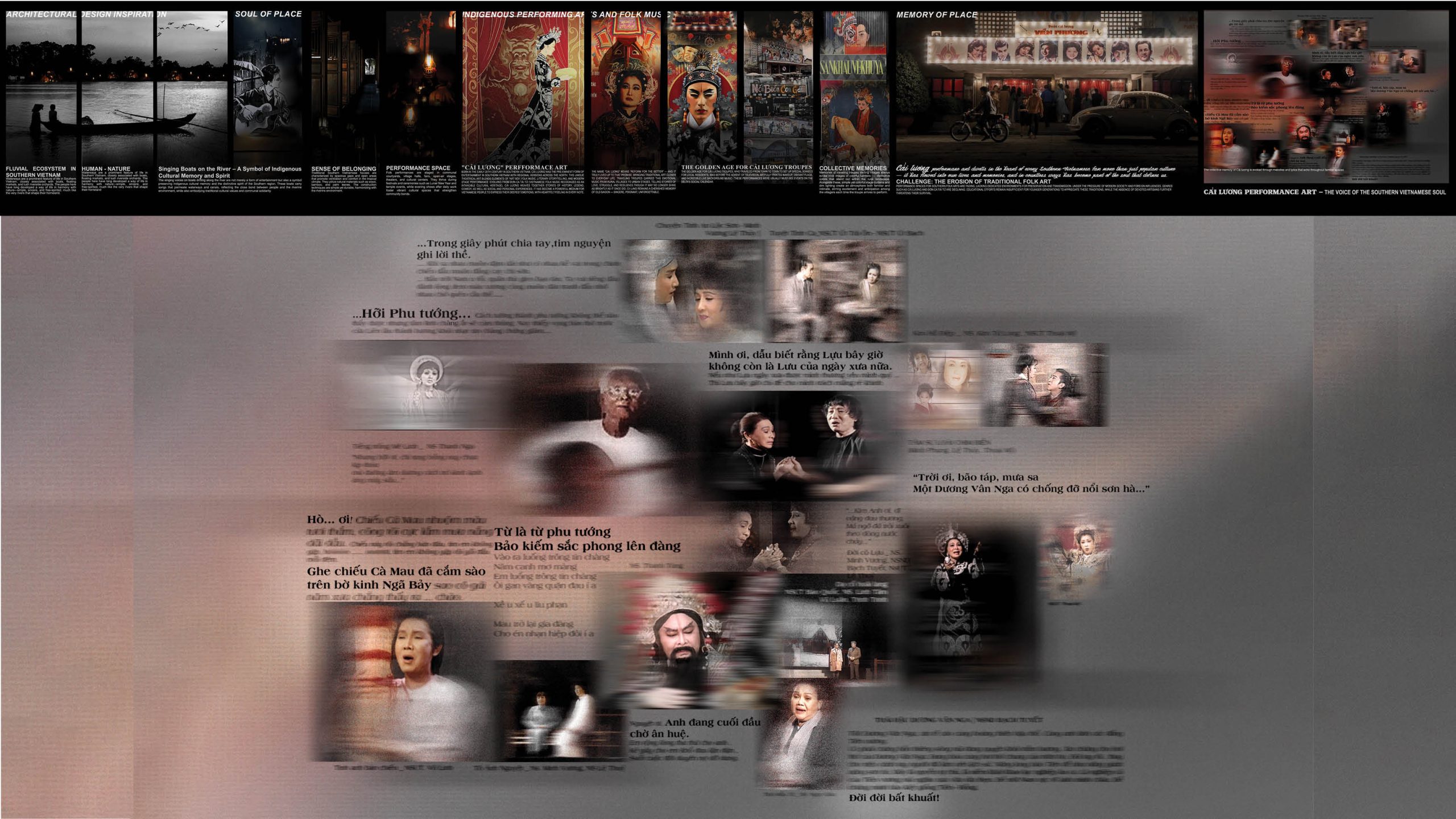 – Memory recall: The façade takes inspiration from vintage cải lương banners and posters, transformed into vibrant panels that invite visitors into a space of memory and performance.